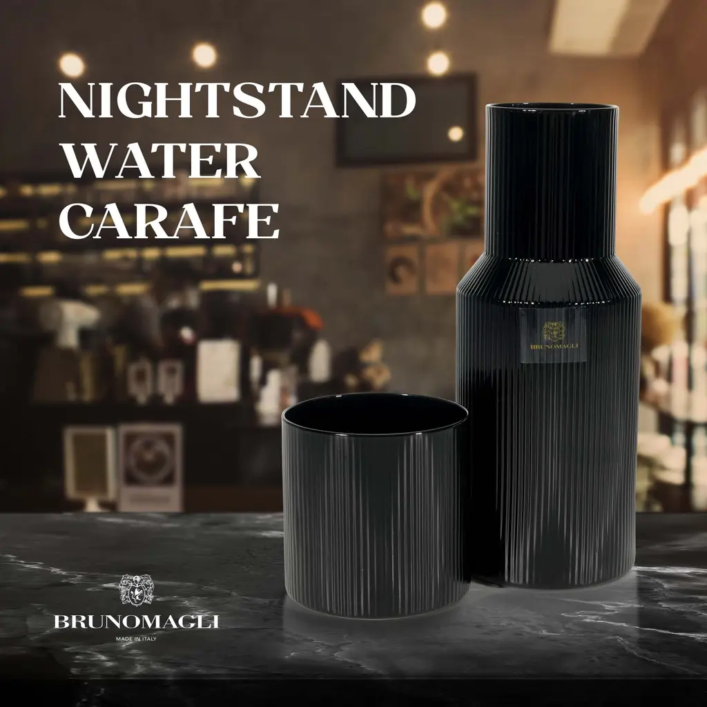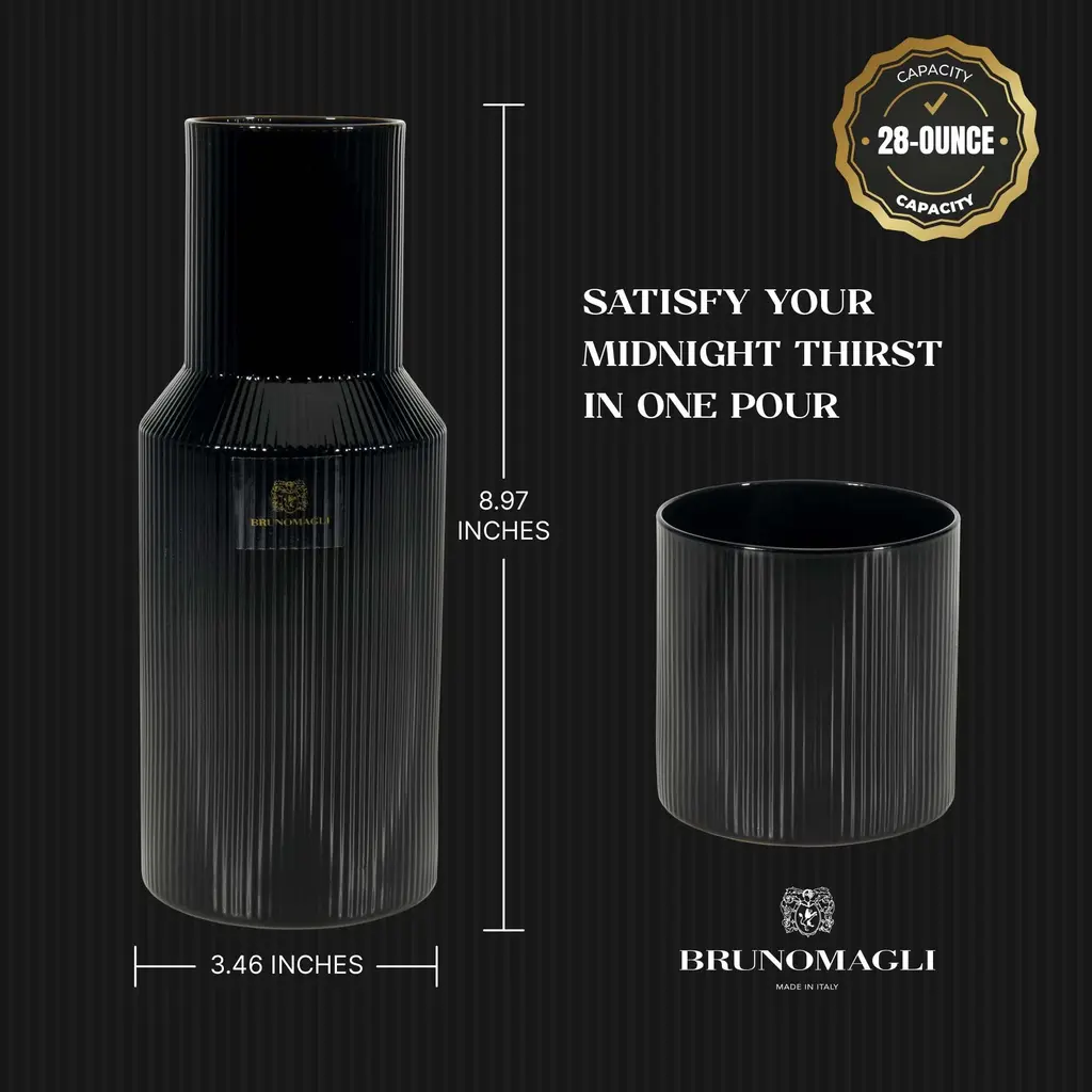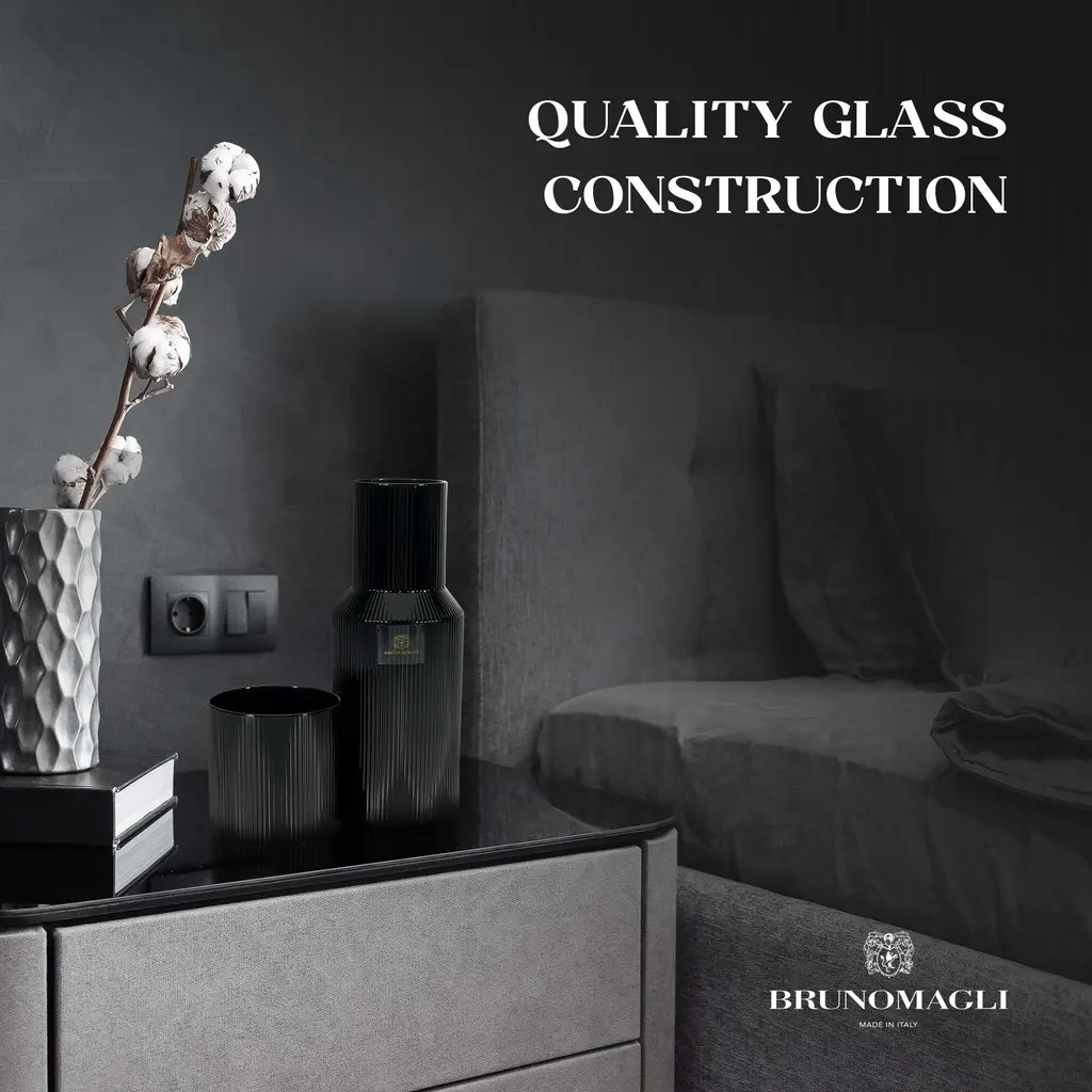 Bruno Magli Ribbed Carafe, 2-Pc Set, Drinking Glass Tumbler Doubles as a Lid, Elegant Nightstand Water Pitcher with Matching Cup for Office, Home, & Guest Room Décor, Gift Boxed - NewThe Bruno Magli Ribbed Carafe is an elegant two-piece set that includes a beautifully designed carafe and a drinking glass tumbler that doubles as a lid. Crafted from high-quality materials in a stunning various of colors (Sage Green, Clear, Amber, Black, Smoke), this stylish carafe is perfect for serving water or other beverages and adds a touch of sophistication to your office, home, or guest room decor. Ideal for nighttime hydration, this set is both functional and decorative, making it a thoughtful gift for any occasion. Each piece comes gift boxed, making it perfect for presentation.FEATURES:MATERIAL:WHAT'S IN THE BOX:PACKAGING: Retail Packaging