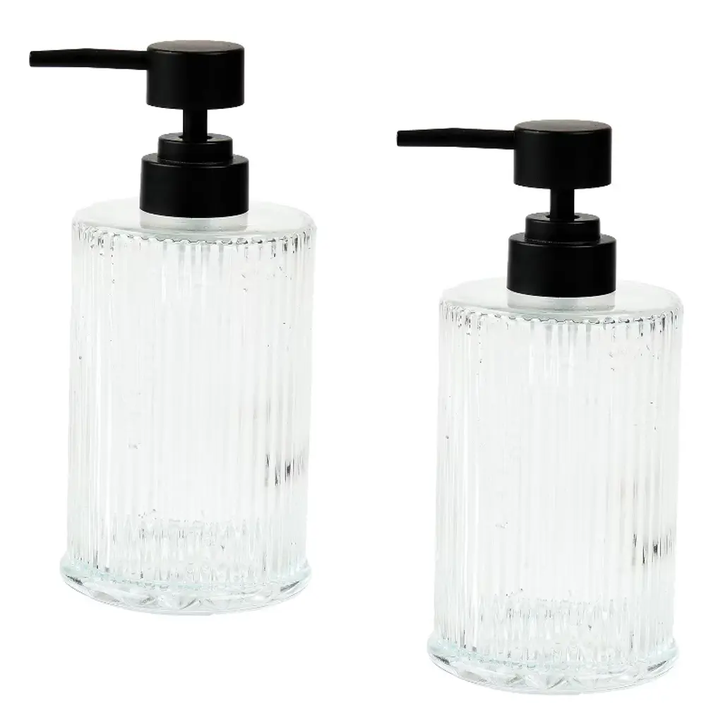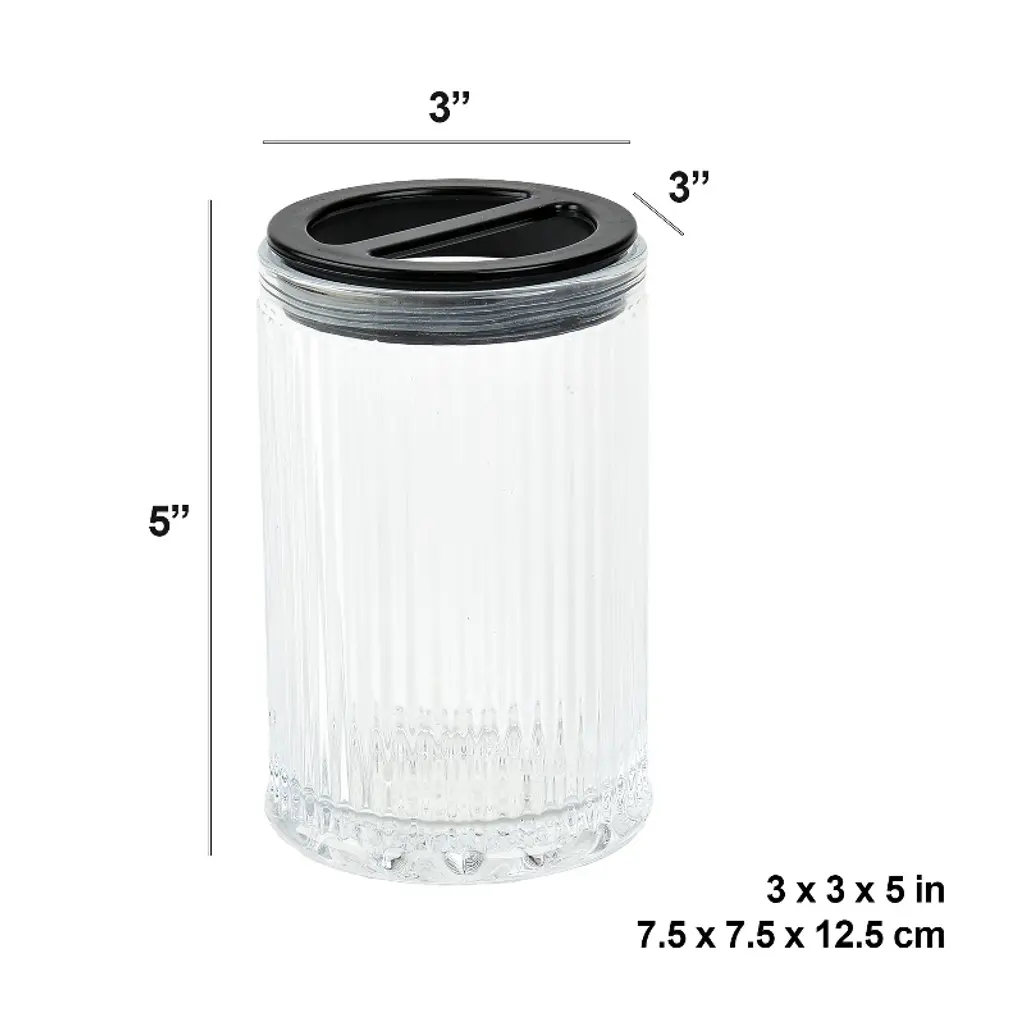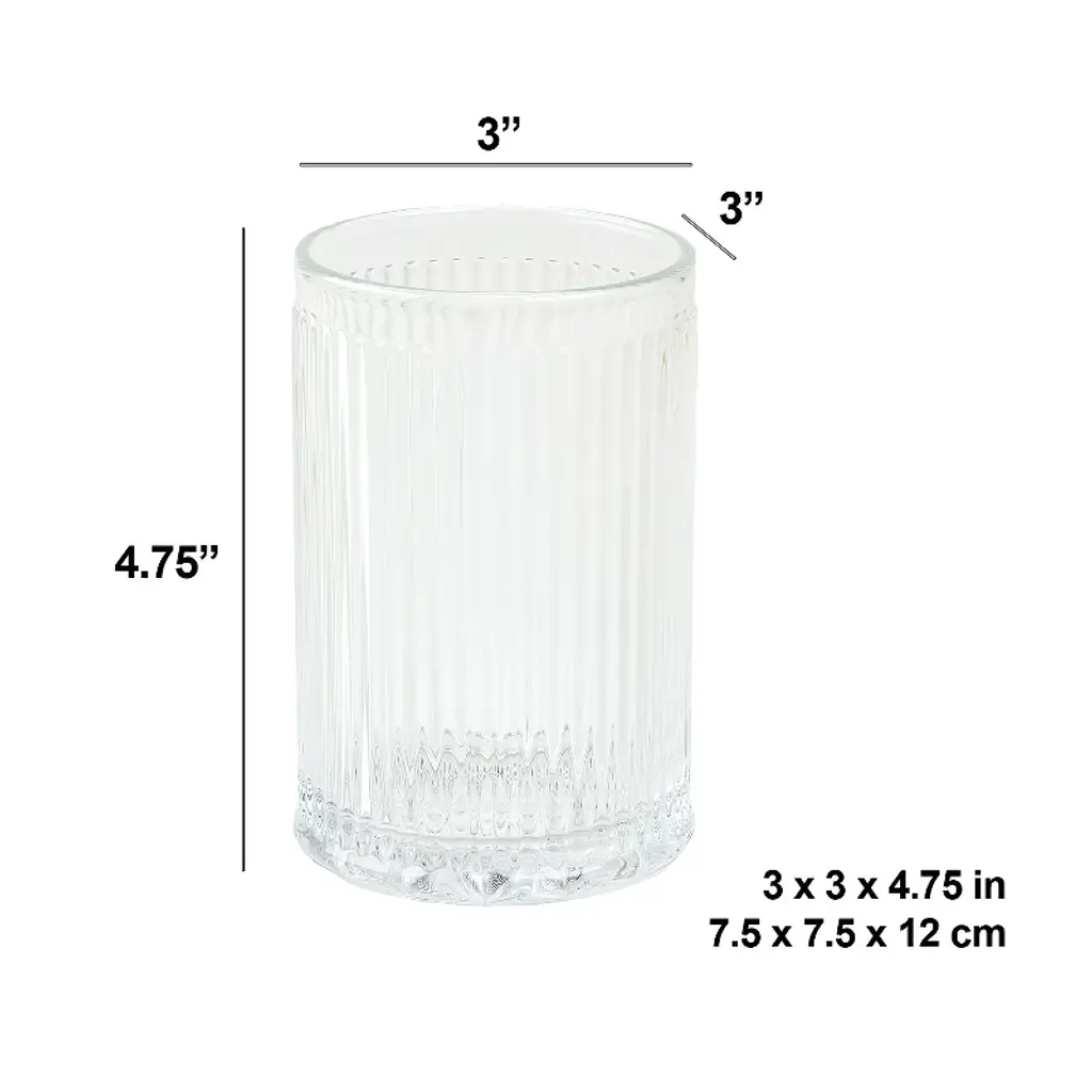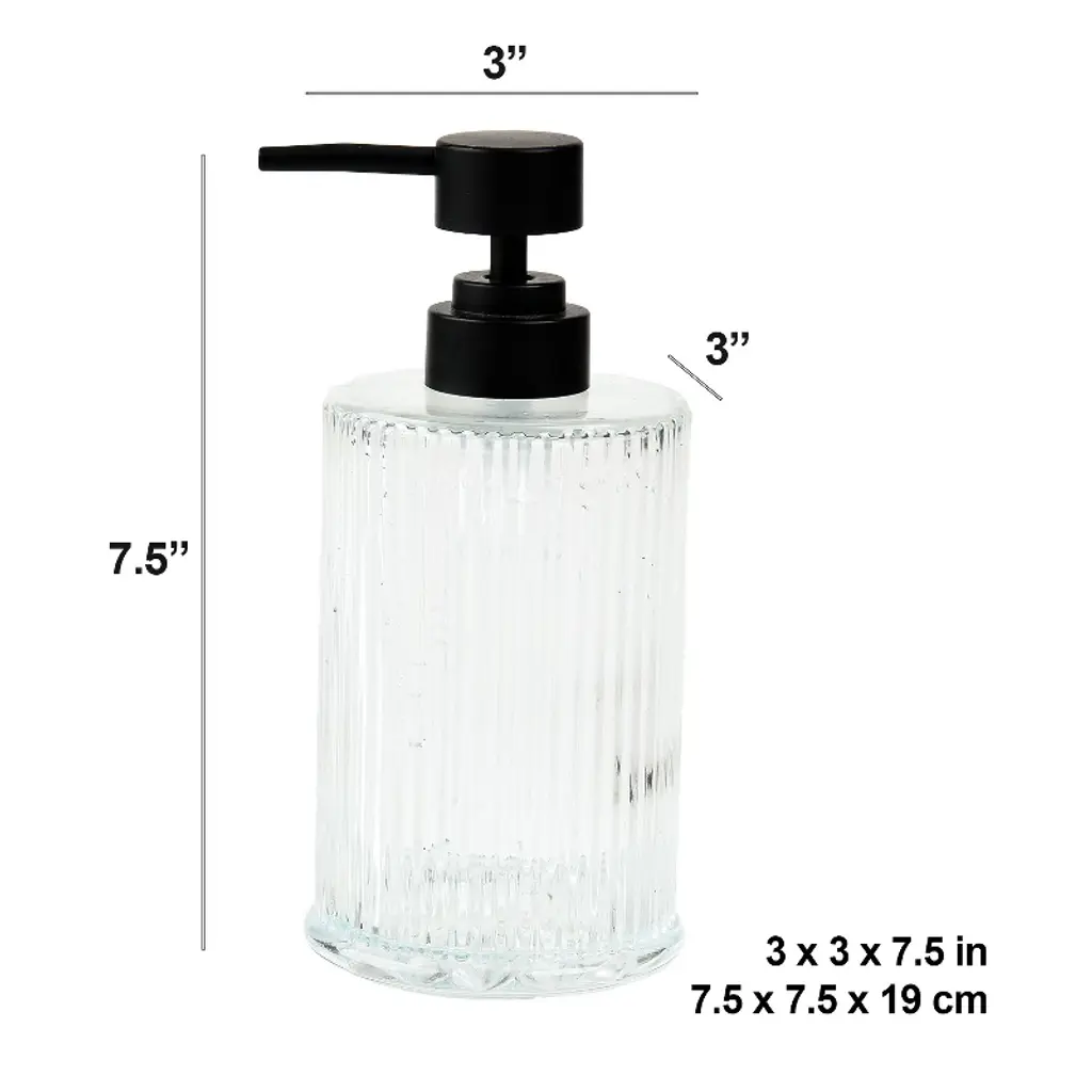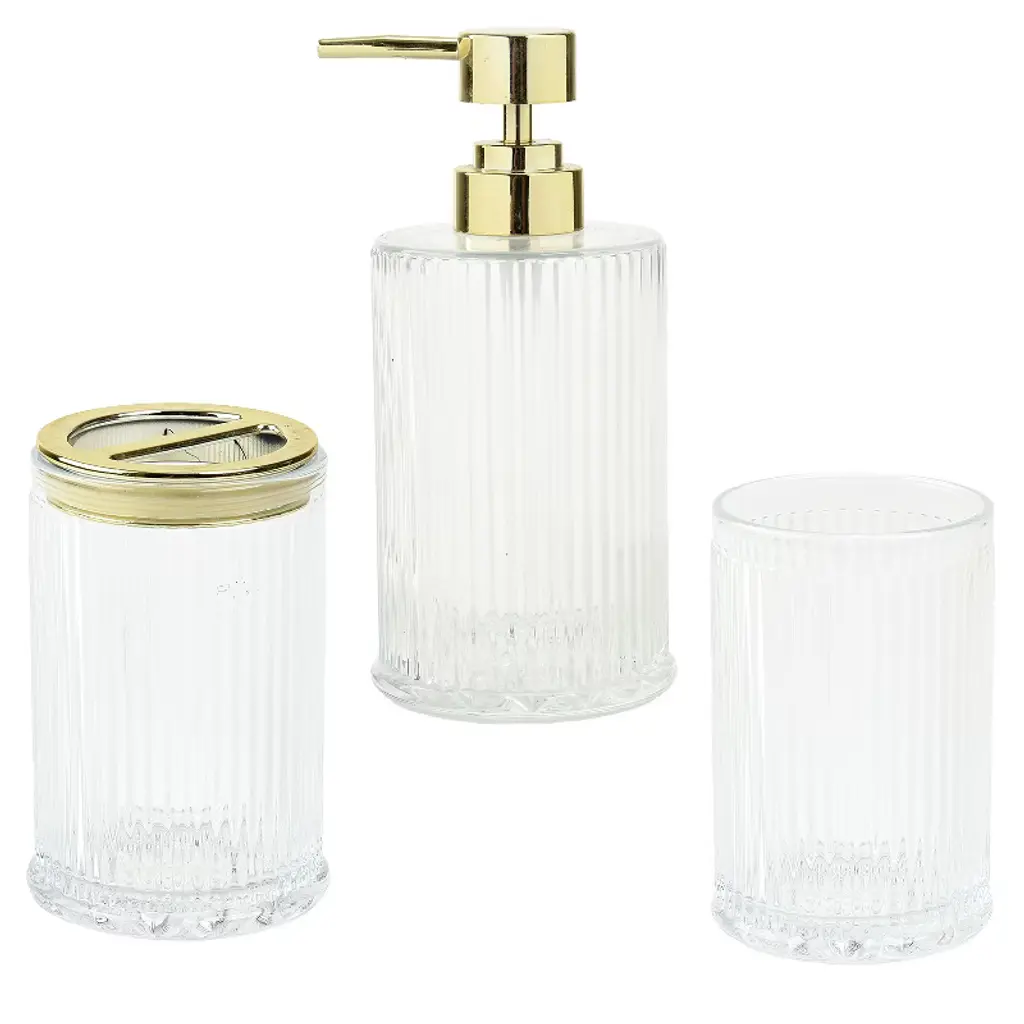 The perfect 3PC set for any bathroom or kitchen area. Designed with a modern sleek look, this Heavy duty ribbed clear glass will compliment any bathroom or kitchen. Includes a Soap/Lotion Dispenser Pump with matching Tumbler and Toothbrush Holder. Great for a starter set for a new home, a housewarming gift or just to refresh your décor!