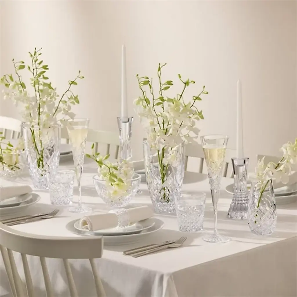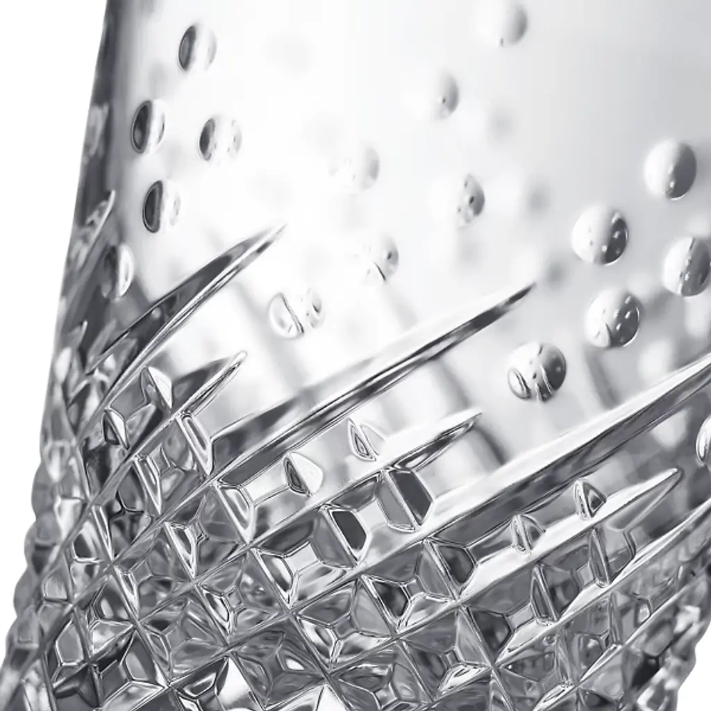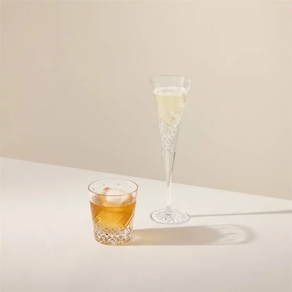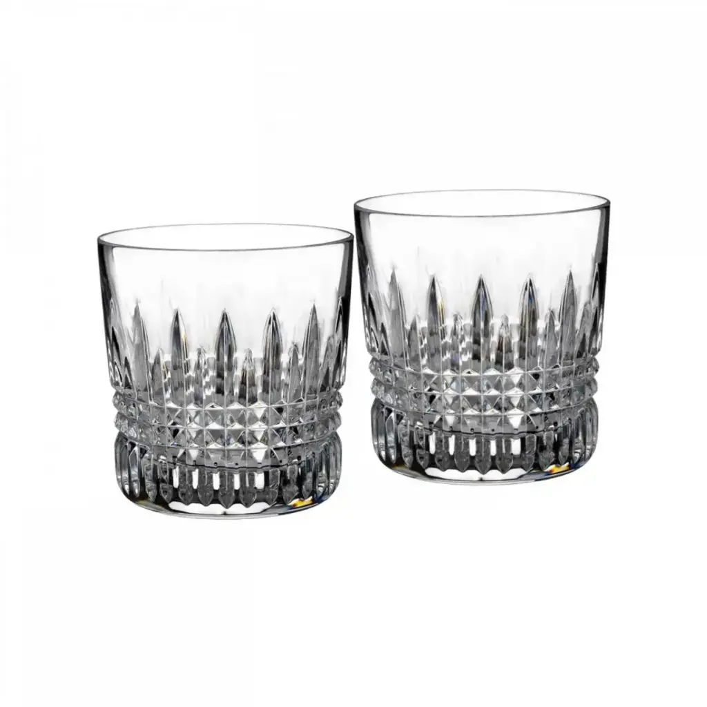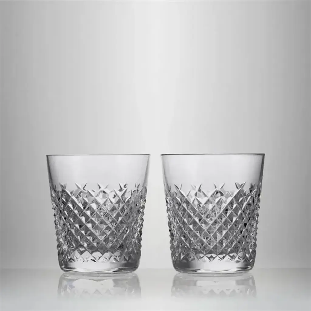 The Celebration Tumbler, Set of 2 from Waterford showcases classic crystal artistry through intricate geometric cutwork around each glass. Designed to bring celebration brilliance to everyday drinking experiences, this pair belongs to the collection honoring special moments. The tumblers feature deep karo cuts that create striking depth alongside delicate olive patterns. Lead-free crystal construction delivers the clarity and weight expected from premium glassware for spirits and cocktails.