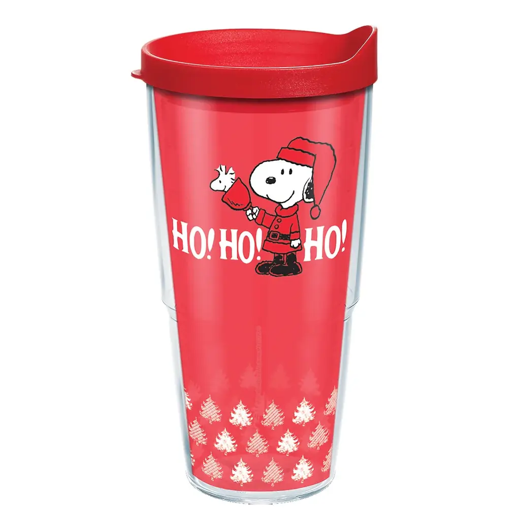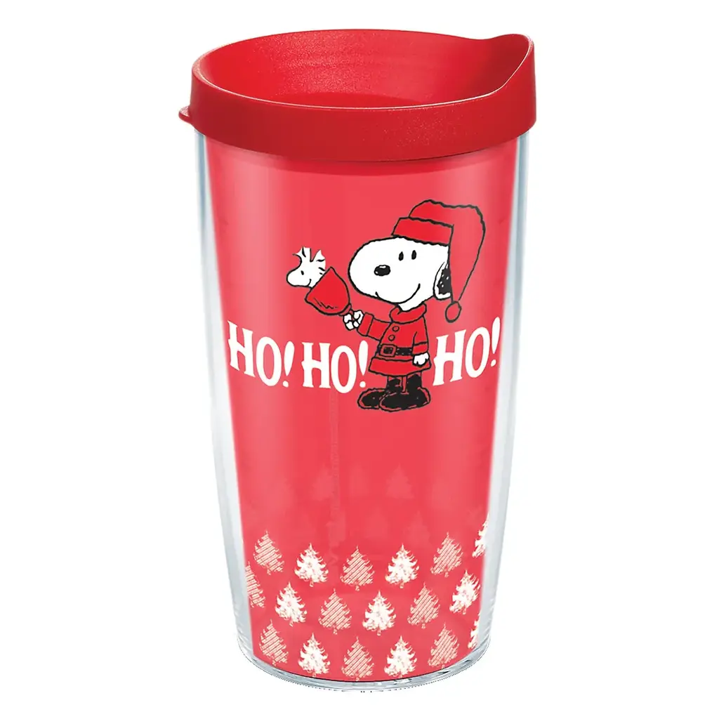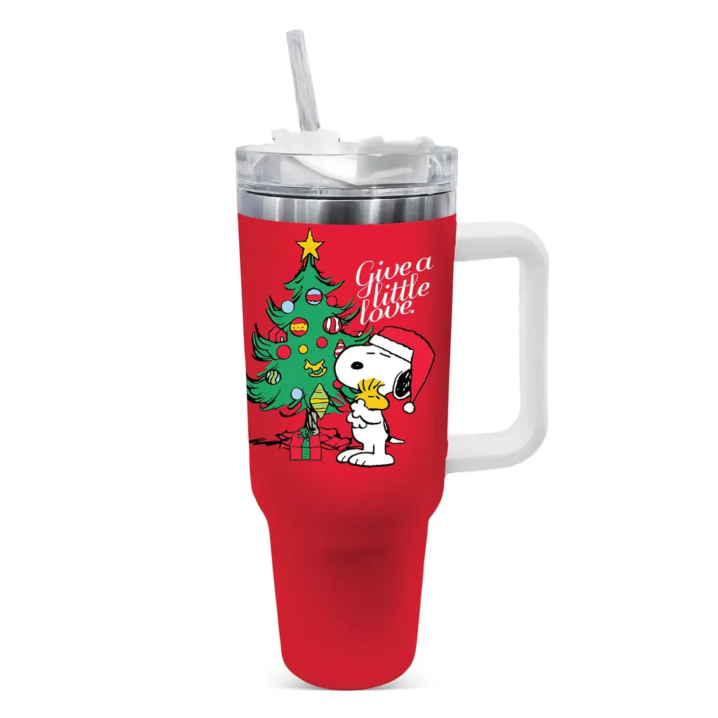This Snoopy tumbler features a red background with Snoopy celebrating the holiday with his best friend Woodstock. The famous duo stands next to the Christmas tree and it reads, "Give a little love" above. The double-walled stainless steel tumbler fits inside most vehicle cup holders, has a BPA-free plastic lid with sliding lock, a removable straw and sturdy white handle. Perfect for hot and cold beverages. Hand wash. Holds 40 oz. 5 1/2"L x 4"W x 12 1/2"H.