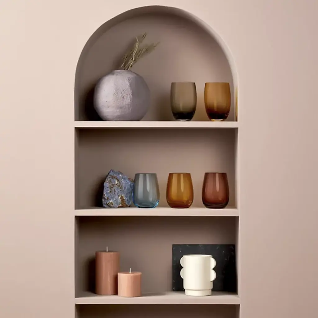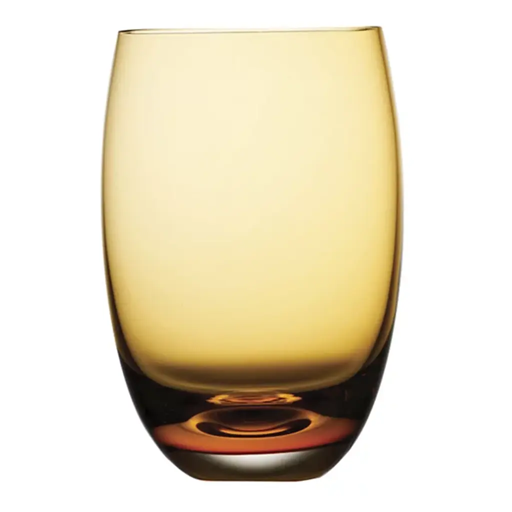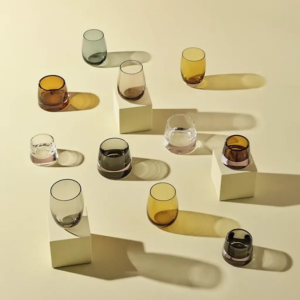 The Colored O Tumbler Glasses, Set of 4 from Nude feature heavy crystal bases that taper upward into translucent colored walls with subtle gradient effects. Created by the Nude Design Team in Turkey, each lead-free crystal glass displays a different hue while maintaining identical proportions and weight distribution. The substantial bottom provides excellent stability while the tinted crystal adds chromatic depth to minimalist forms.
