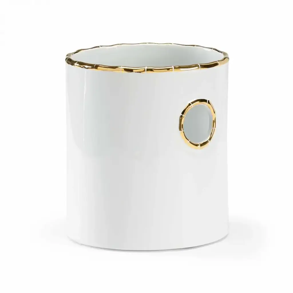 Add timeless elegance to your bathroom decor with the Delphine stoneware bath accessories. Featuring a glossy ivory finish and delicate gold trim, this set offers a sophisticated touch. Perfect for creating a polished, coordinated look while keeping your essentials stylishly organized. The Delphine Bath Accessories collection consists of a lotion/soap dispenser, tumbler, vanity tray, wastebasket, and tissue box cover.