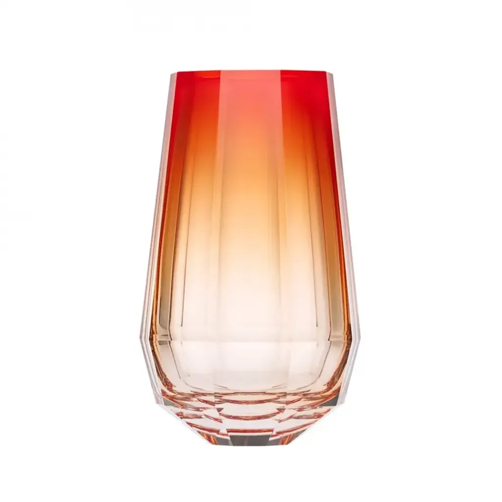 The distinct contemporary and colorful soul accenting this set of two tall tumbler glasses is evident in the splendid display of colors. A warm, lively range of hues from orange-red to pink graces the tall silhouette, which is further enlivened by an elegant texture of vertical grooves progressively wearing thin while approaching the upper rim.
