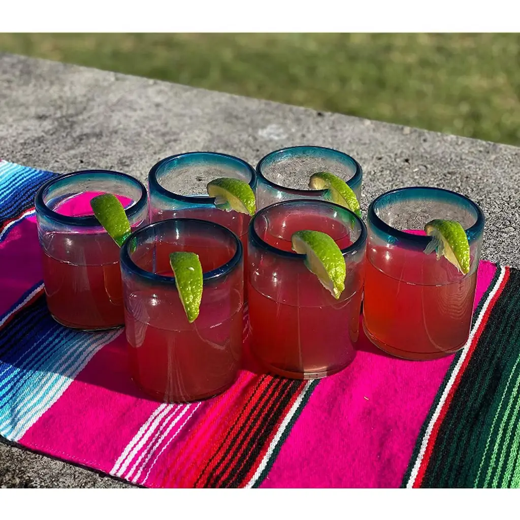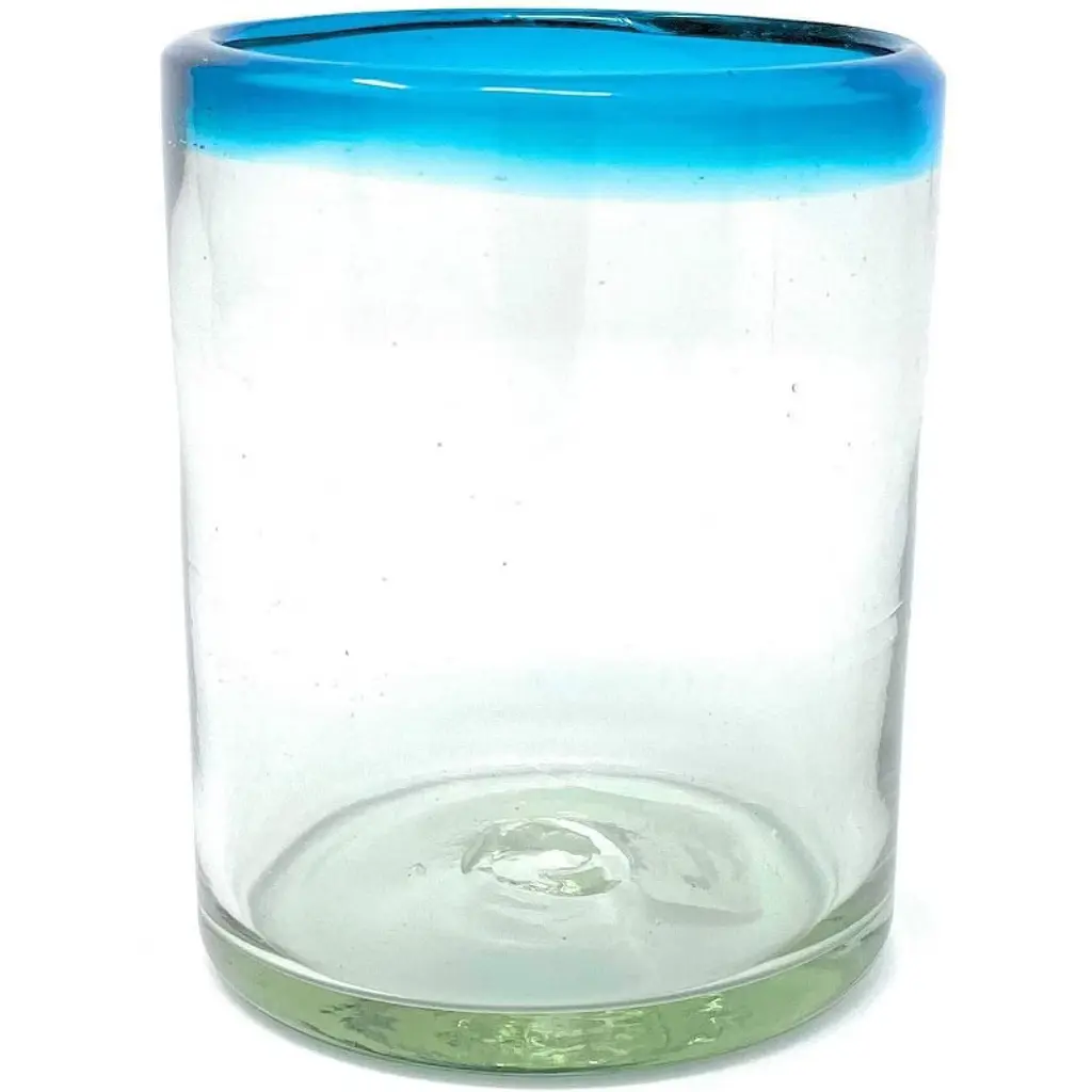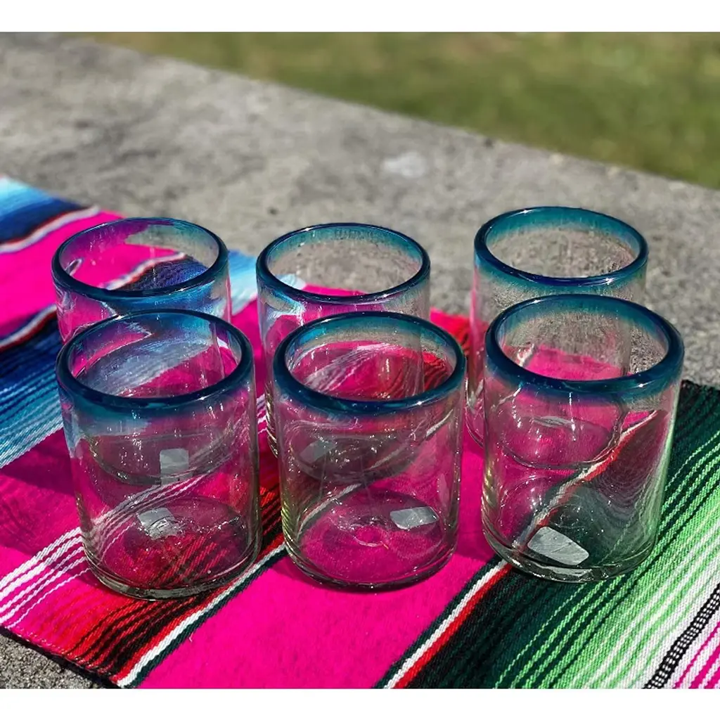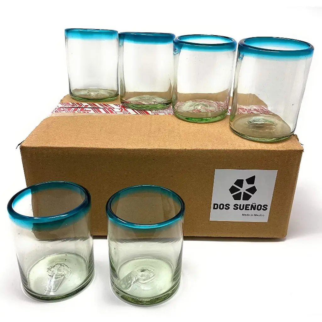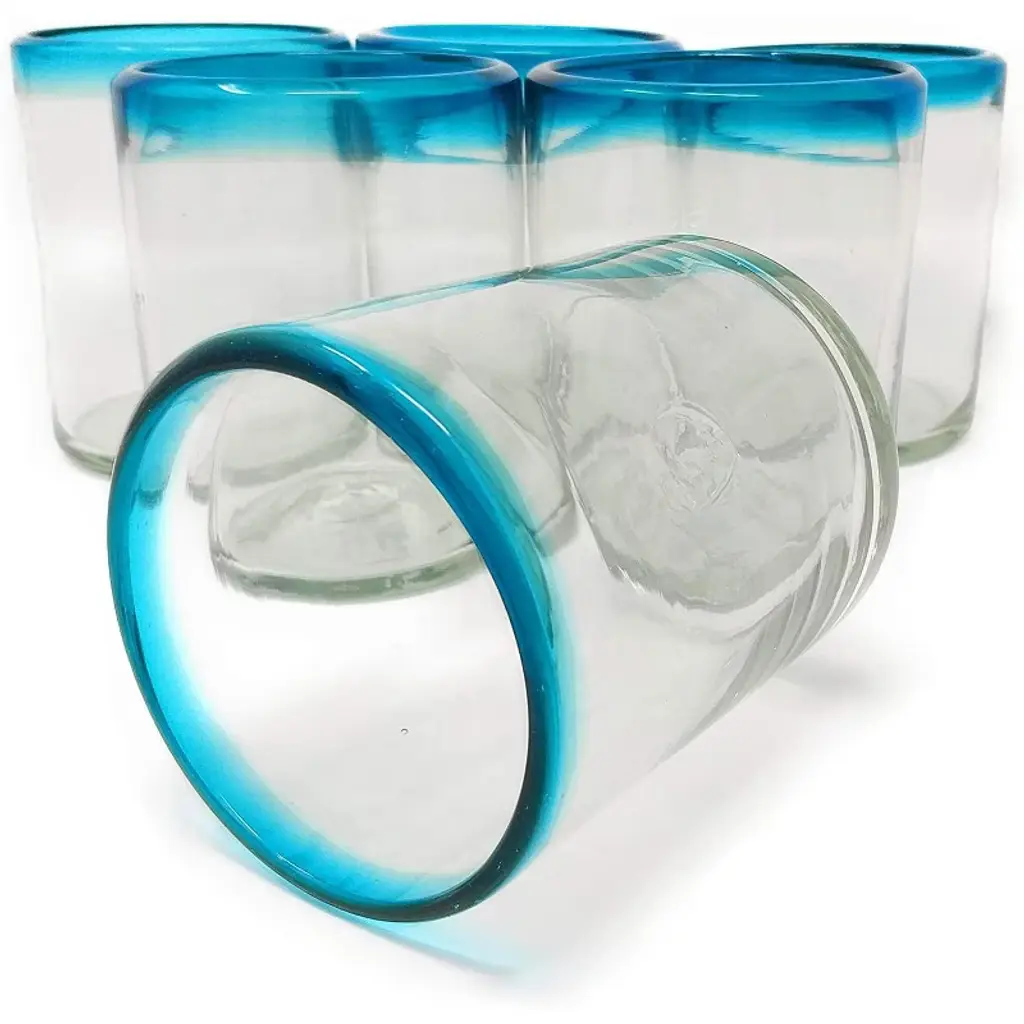 Dos Sueños Mexican Hand Blown Tumblers - Aqua Rim - 10oz - Set Of 6