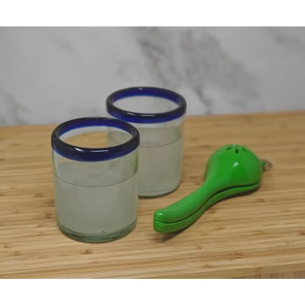 This traditional set of 2 blue rim tumbler glasses is perfect for your next fiesta! Use them to serve water, juice, soda or alcohol. The set adds a great sense of elegance to the dining room that will be enjoyed by everyone. Each blown glass may vary slightly in size and show tiny bubbles within the glass that develop from the blowing process. Lead-free, made from sustainable recycled glass. Hand-washing recommended, but dishwasher safe on the top rack. Exceptional artisan quality, thick and sturdy glass. Proudly hand made in Mexico.