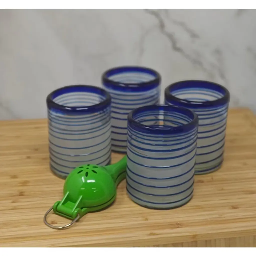 This traditional set of 4 blue spiral tumbler glasses is perfect for your next fiesta! Use them to serve water, juice, soda or alcohol. The set adds a great sense of elegance to the dining room that will be enjoyed by everyone. Each blown glass may vary slightly in size and show tiny bubbles within the glass that develop from the blowing process. Lead-free, made from sustainable recycled glass. Hand-washing recommended, but dishwasher safe on the top rack. Exceptional artisan quality, thick and sturdy glass. Proudly hand made in Mexico.