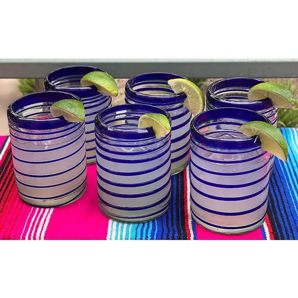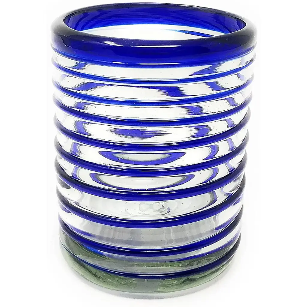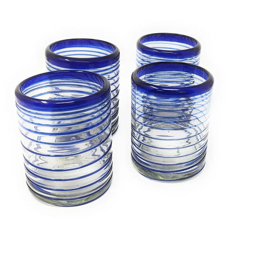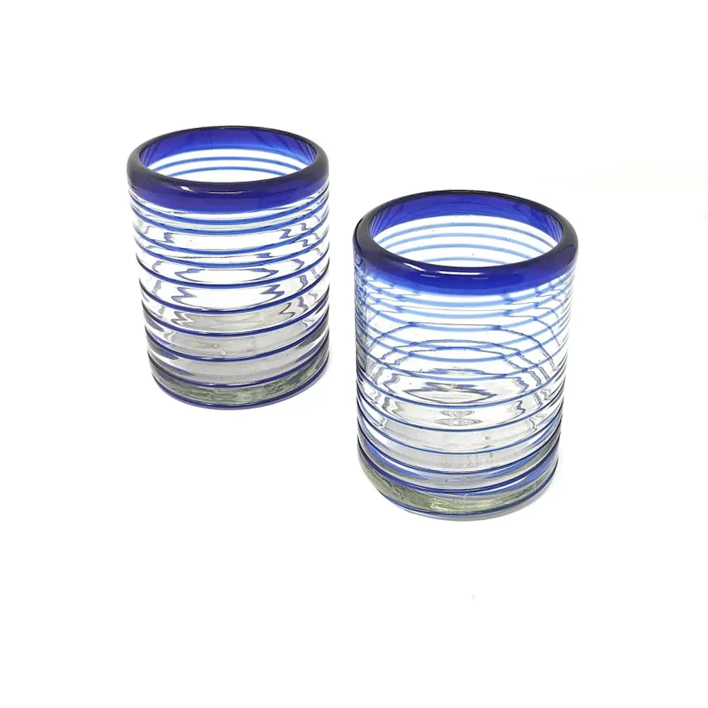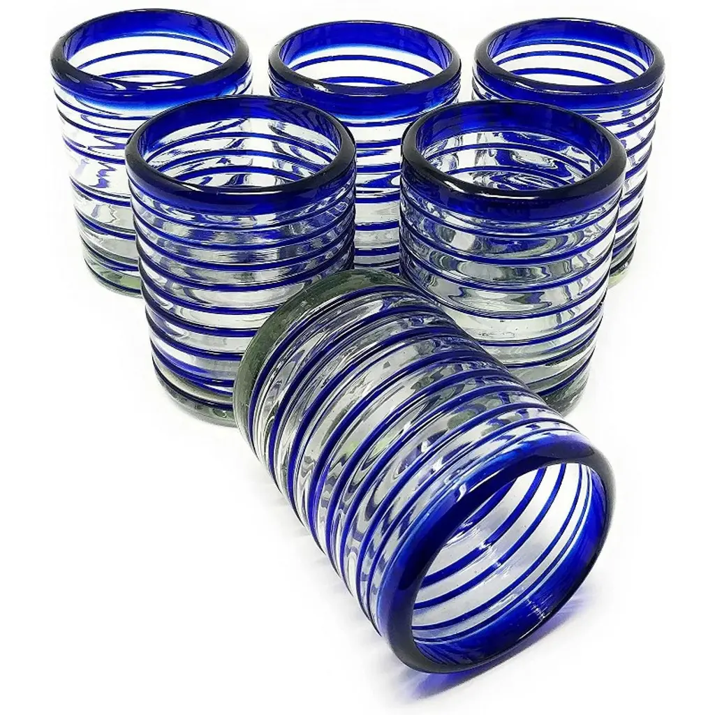 This traditional set of 6 blue spiral tumbler glasses is perfect for your next fiesta! Use them to serve water, juice, soda or alcohol. The set adds a great sense of elegance to the dining room that will be enjoyed by everyone. Each blown glass is made by the hands of skilled artisans, may vary slightly in size and show tiny bubbles within the glass that develop from the blowing process. Lead-free, made from sustainable recycled glass. Hand-washing recommended, but dishwasher safe on the top rack. Exceptional artisan quality, thick and sturdy glass. Proudly hand made in Mexico.
