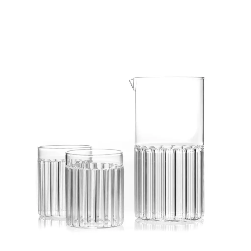 This contemporary Czech glass set includes one Bessho Carafe Pitcher and six Bessho Tumblers Just as the small town is known for the healing properties of its hot springs, so are the evenings we spend with good friends. The contemporary, minimal Bessho Collection is elegant in its simplicity of modern form and use of glass. Perfect for any beverage from ice tea and lemonade to your favorite cocktails and spirits. With an innovative use of materials, the collection is made with the finest quality borosilicate glass and without the use of molds. In StockDesign: Felicia Ferrone, 2016Handcrafted in Czech RepublicBessho Carafematerial • borosilicate glasssize • 1000mL (34fl oz) H 20.5cm (8in) ø10cmBessho Tumblersmaterial • borosilicate glasssize • 400mL (14 fl oz) H 10cm (4in) ø8cm