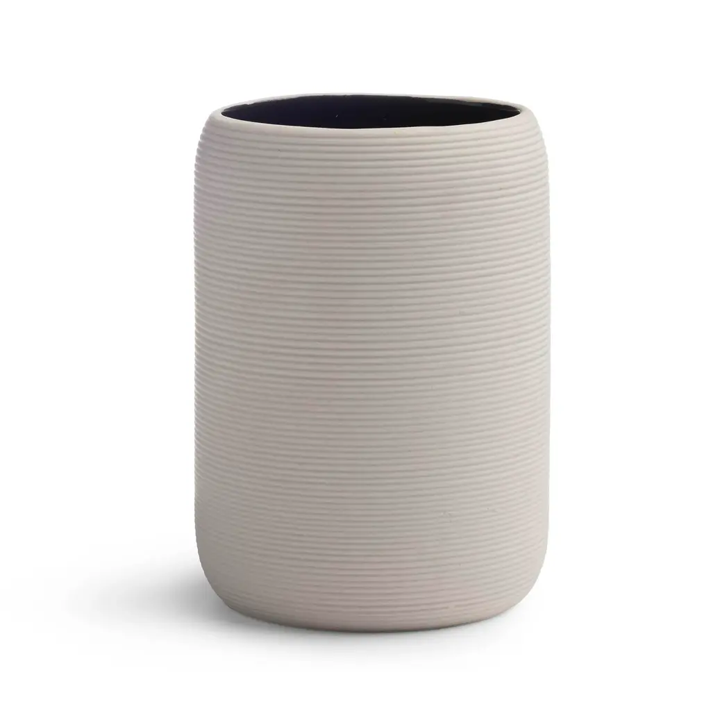 Crafted from porcelain, the Fillmore bath accessories feature a ribbed texture. Ivory on the outside and black on the inside, these accessories achieve the ultimate modern look.