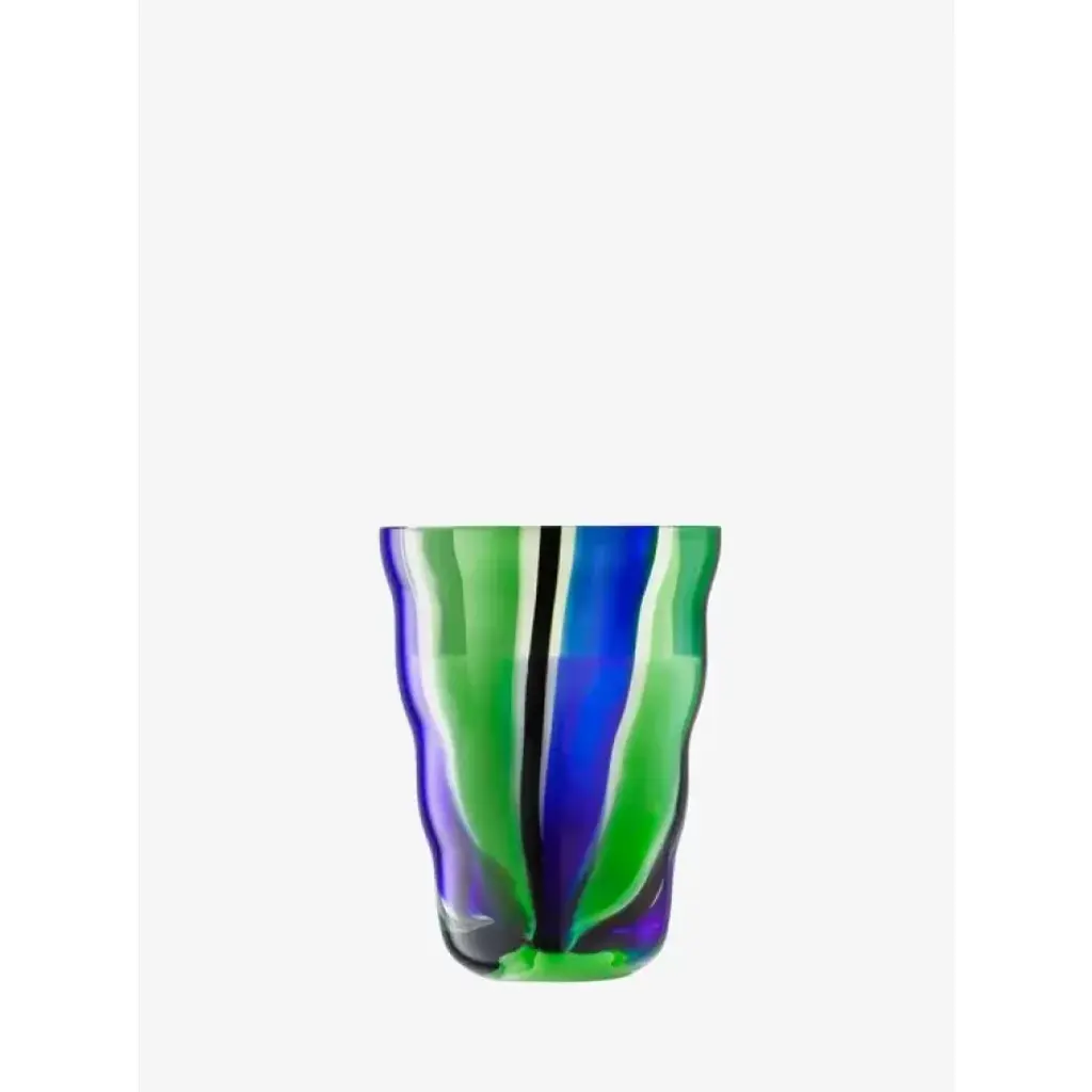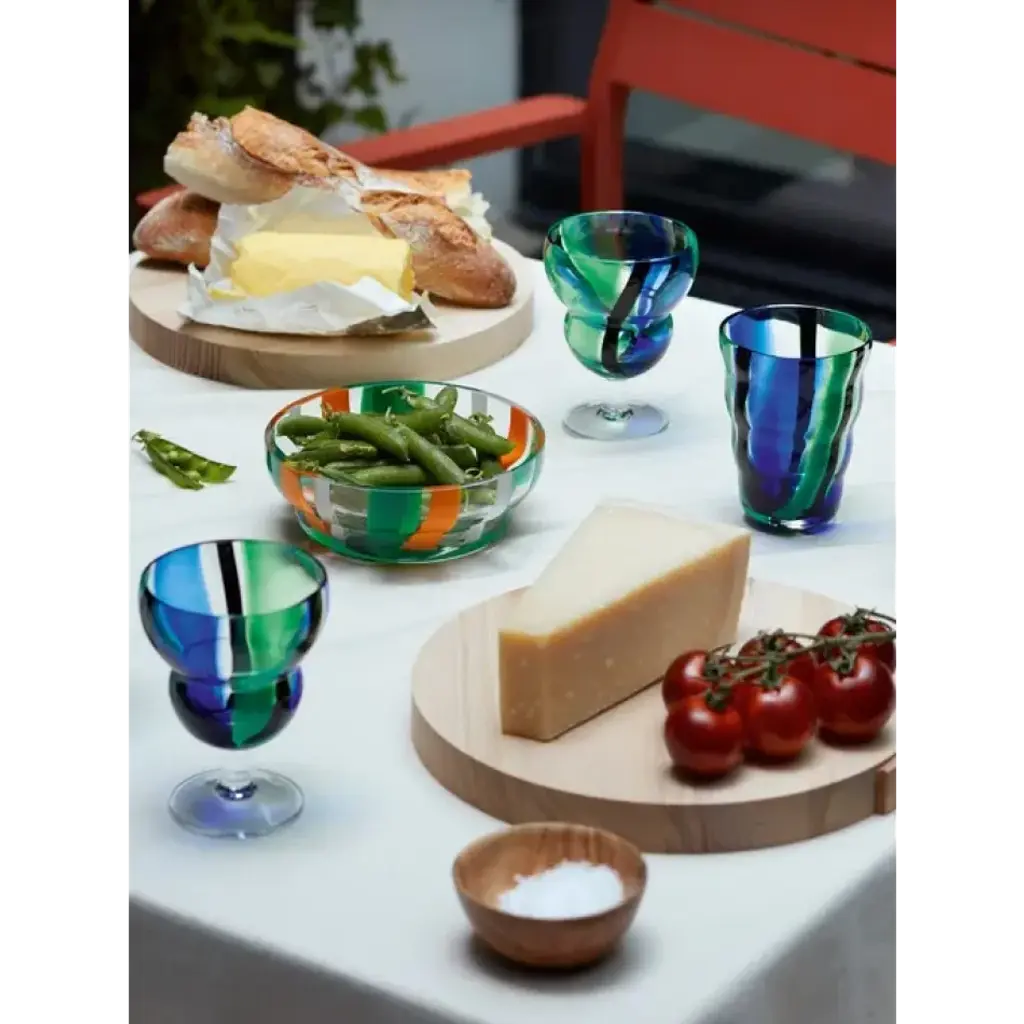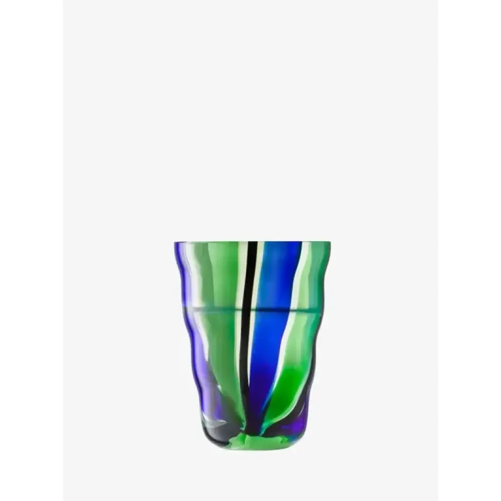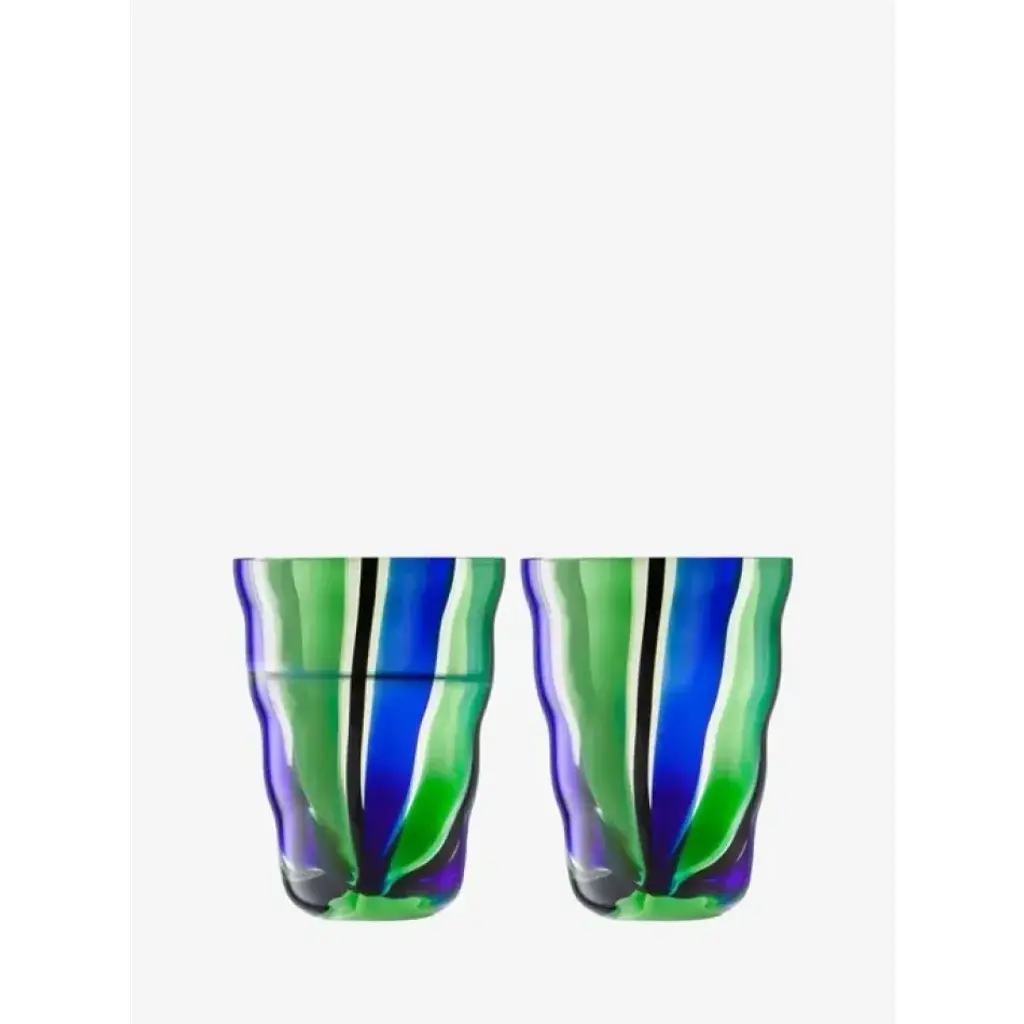 A pair of mouth-blown tumblers with a distinctive folk-inspired pattern and undulating form. For water, wine or juice.