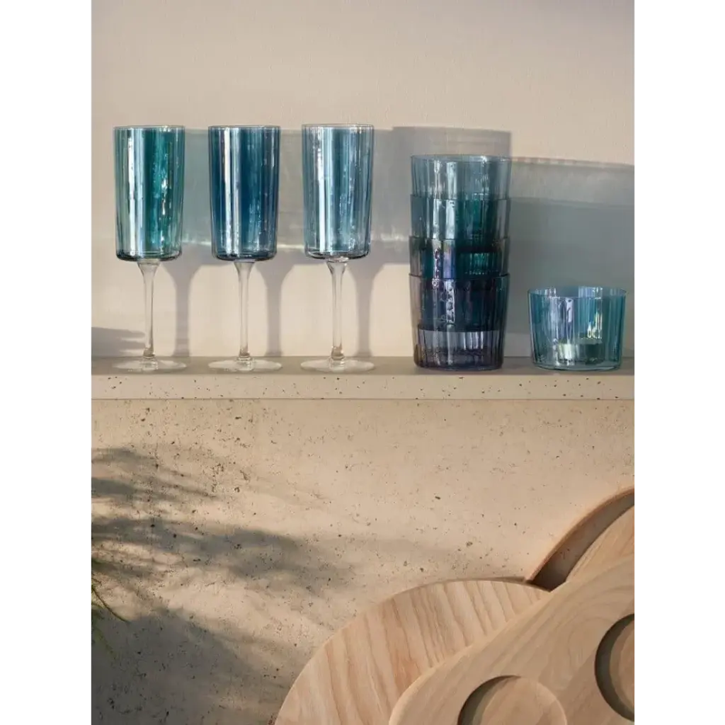 A set of textured tumblers with fine walls, painted by hand in assorted tonal lustres.