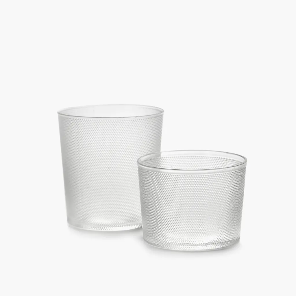 Ribbed to the touch and clear to the eye, the L tumbler from Merci’s La Nouvelle Table sits in that sweet spot between everyday and restaurant-ready. The pressed texture gives a light, secure grip; the rim stays smooth for an easy sip. Straight sides and a flat base mean they stack neatly, so a full set won’t crowd the cupboard. At 10.1 oz (300 ml), it’s the right size for water, spritzers, iced coffee, or a classic lowball. Rugged enough for daily use, happy in the dishwasher, and clean-lined enough to pair with anything on the table.