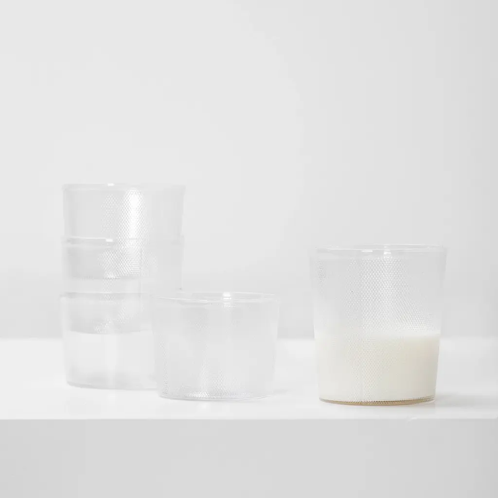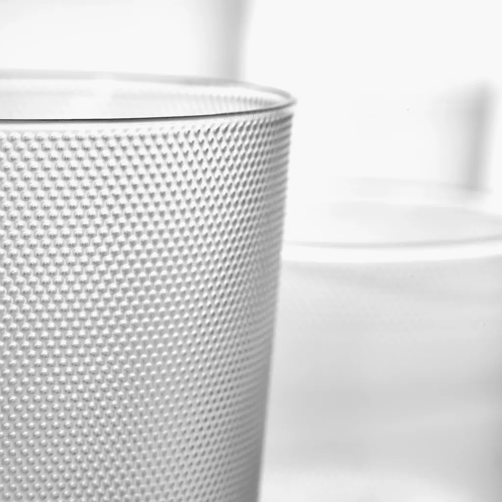 Ribbed to the touch and low in profile, the Glass S sits neatly in the hand and stacks without fuss. The pressed texture catches light while the lip stays smooth, so juice, iced espresso, or a small pour of spirits feels clean to drink. At 6.7 oz (200 ml) it’s the right size for everyday refreshments or desserts—think panna cotta or fruit at the table. Pair it with the taller Glass L to mix heights across place settings; the shared pattern keeps everything coherent. Clear, durable, and dishwasher-safe, these are the glasses you’ll reach for all day—breakfast to nightcap.