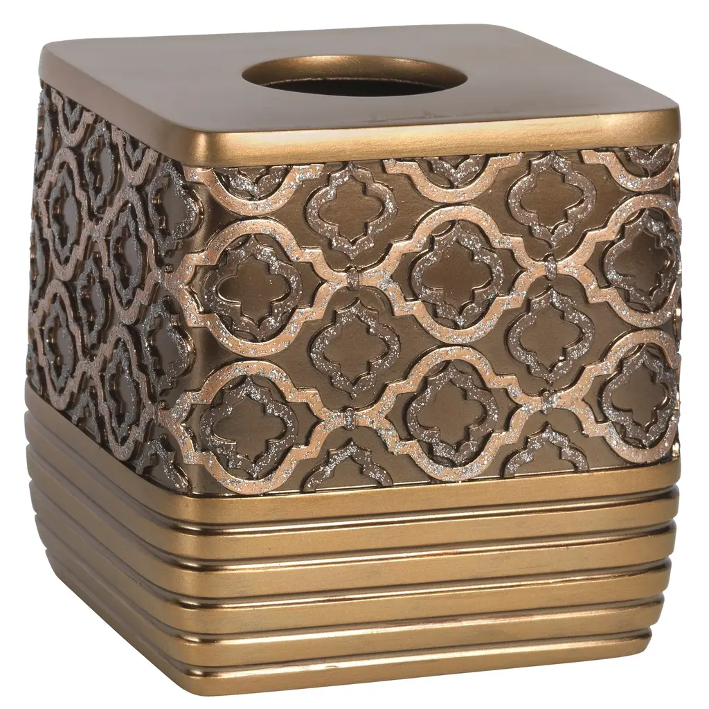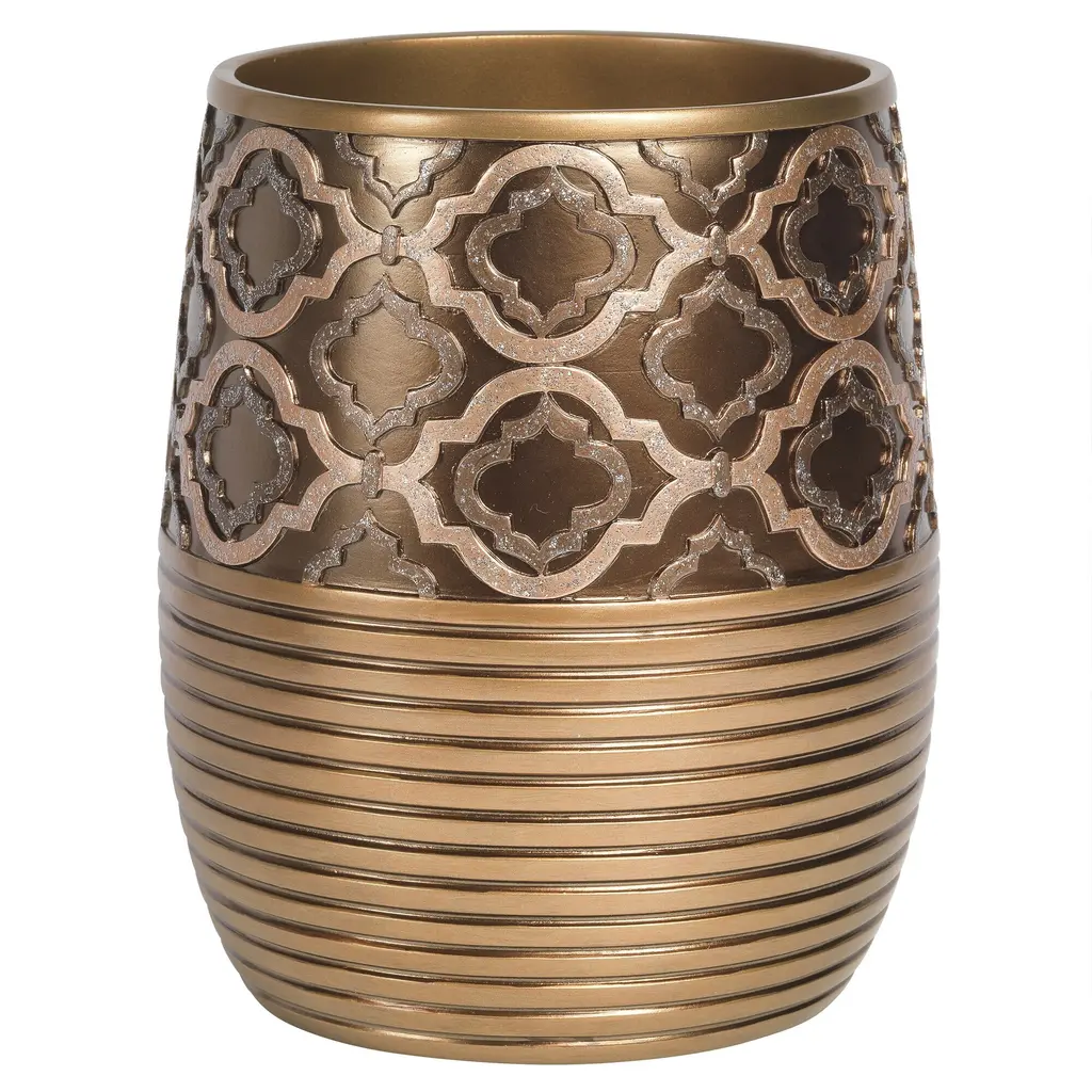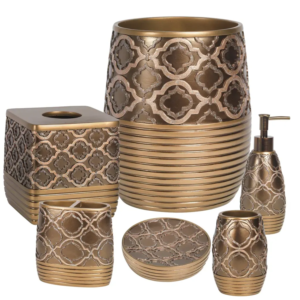 Elevate your bathroom decor with a touch of luxury using our Gold Medallion Bath Accessory Set or Separates. Each piece features a gold medallion pattern with a cracked finish for an elegant look. Made of high-quality resin, choose from a waste basket, tissue box, lotion pump, soap dish, tumbler, or toothbrush holder to suit your needs. Add a single piece for a subtle touch of sparkle, or go for the full set to create a cohesive and sophisticated look.Features: