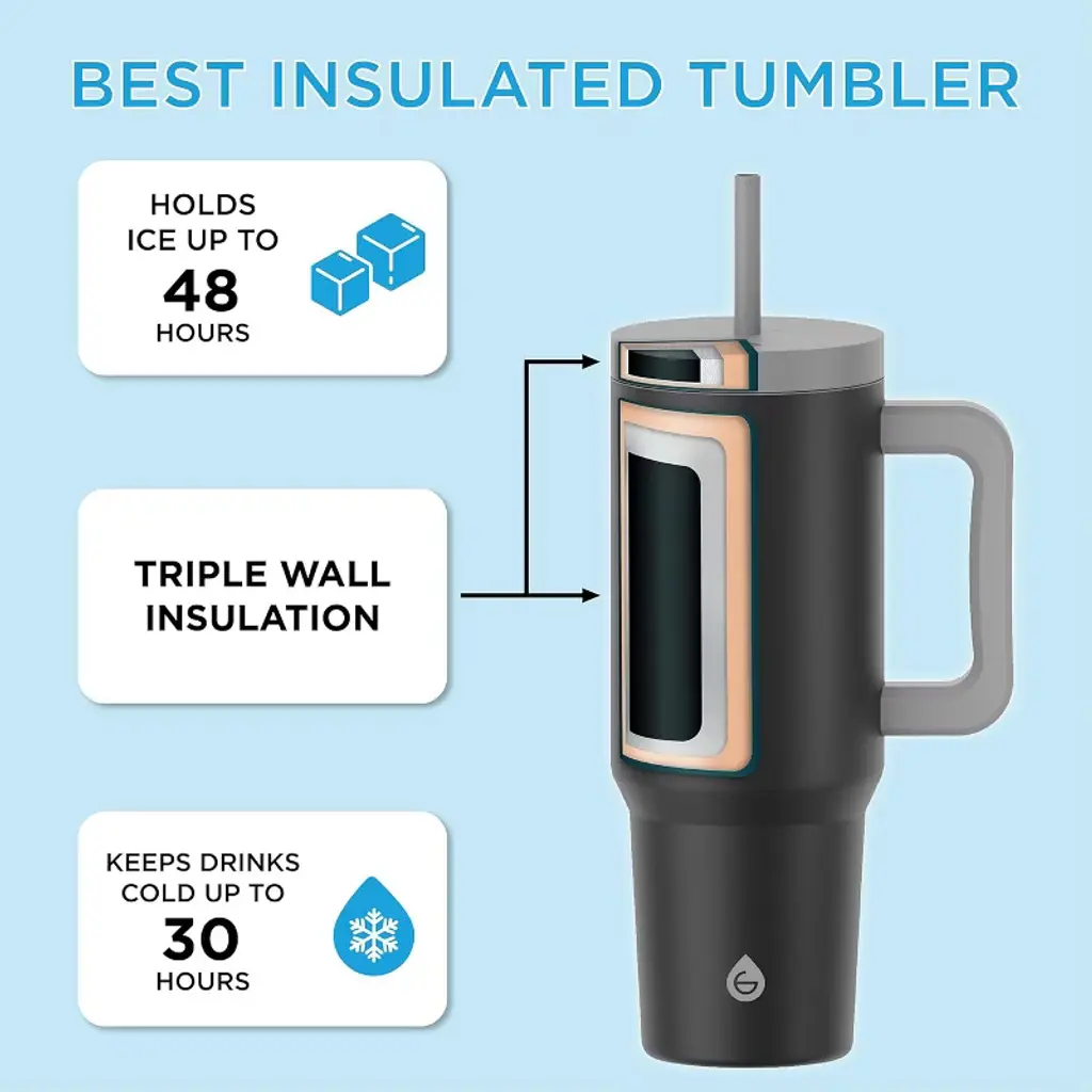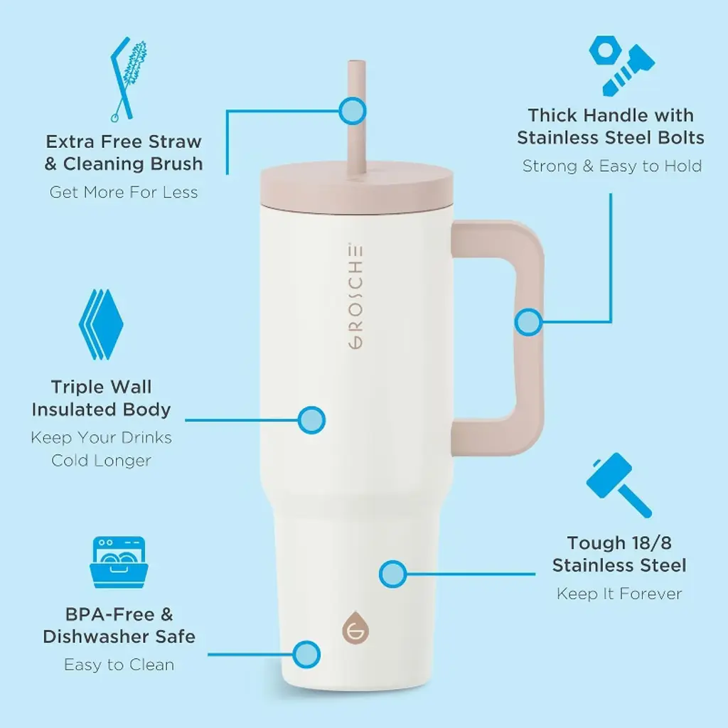 The ASPEN 40 oz Insulated Straw Tumbler is the perfect on-the-go hydration companion to take with you anywhere you go! This stylish and convenient 40oz Tumbler with straw was designed with triple wall insulation, meaning it can hold ice up to 48 hours and keep drinks icey cold all day long. The ASPEN Insulated Tumbler has all the features you need - It's built with thick 18/8 stainless steel, it's dishwasher safe, BPA and PFAS free, cupholder friendly, and includes a free extra straw and cleaning brush. Even better it's a purchase that gives back to someone in need. Every GROSCHE product you buy funds 50+ days of safe drinking water for someone in need through the GROSCHE Safe Water Project. Together, we're making a difference.