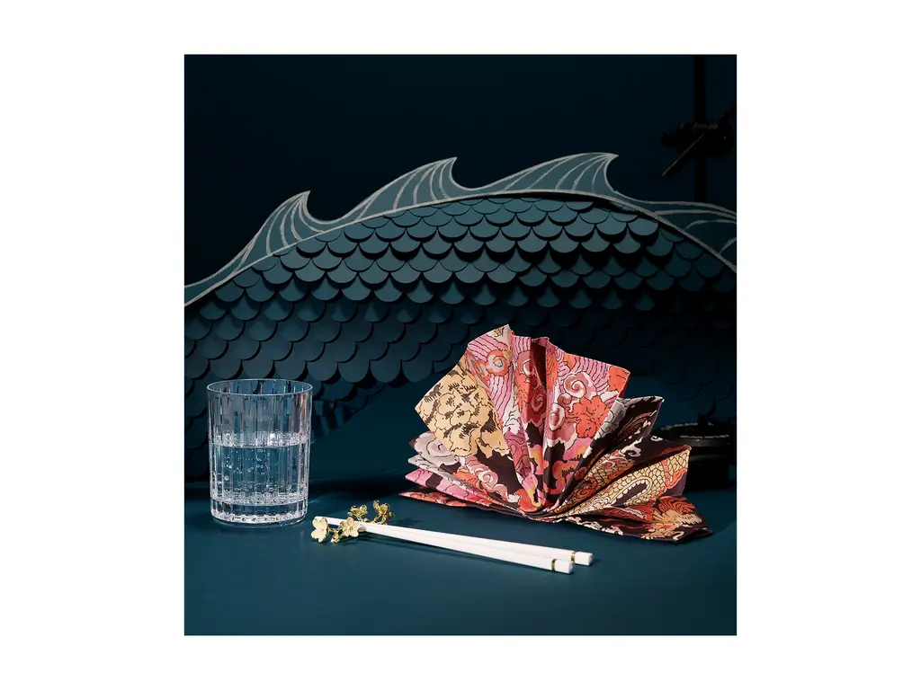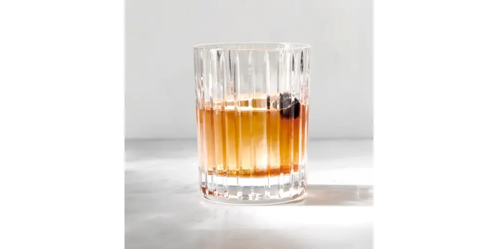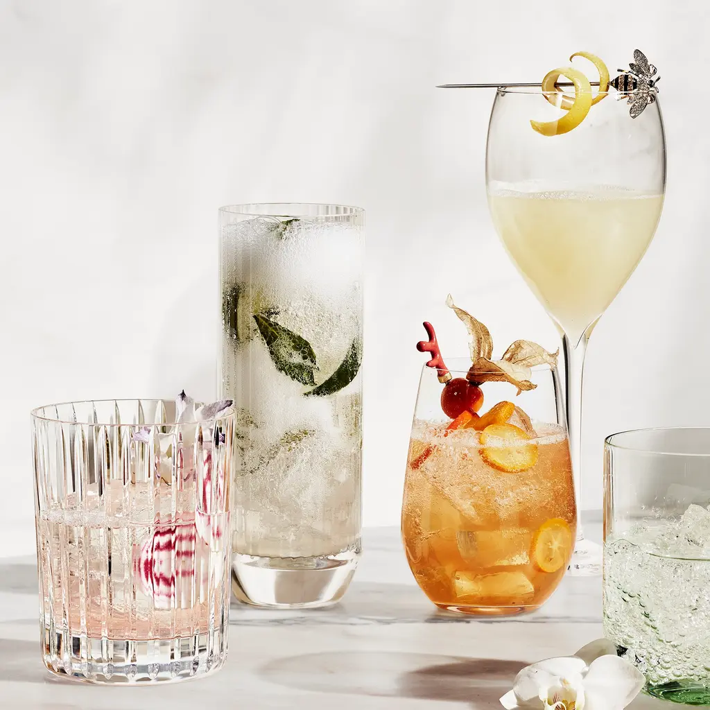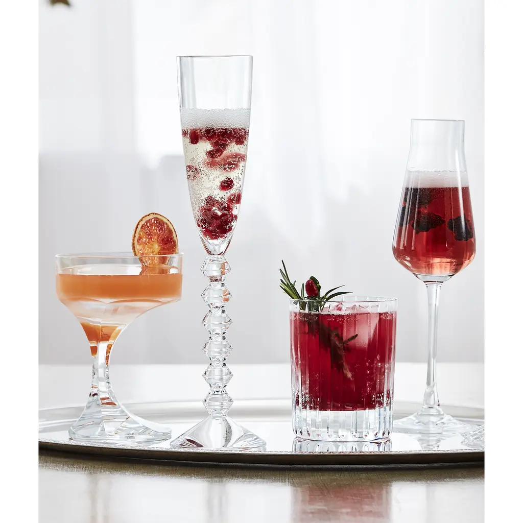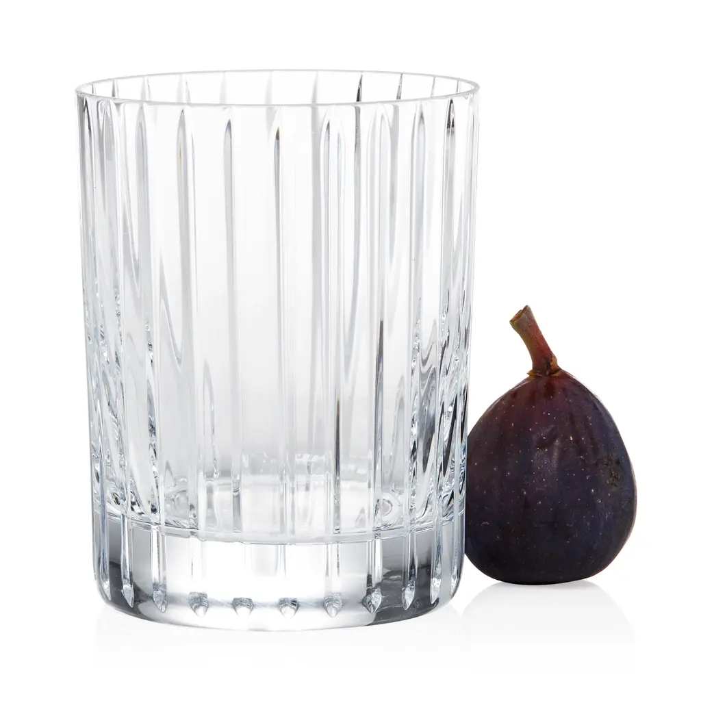 Consecutive parallel cuts travel cleanly along the Clear crystal grazing the highball glass from its lip all the way down to its thick base. The glass has a statuesque look, emphasized by the verticality of the lines, and the ridges bring a textural quality to the surface. It's a piece to admire as you sip your spirits and mixed drinks.