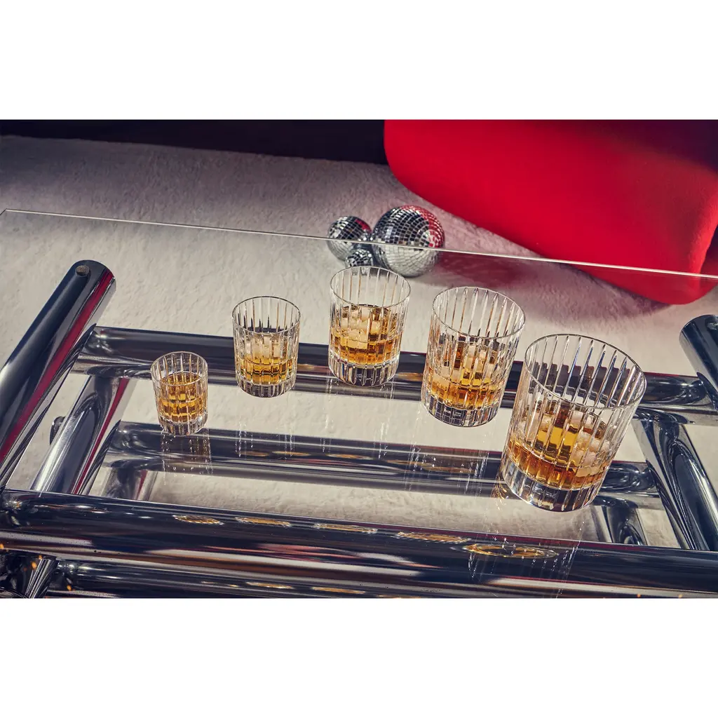 Consecutive parallel cuts travel cleanly along the Clear crystal grazing the tumbler from its lip all the way down to its thick base. These lines emphasize the verticality of the tumbler as you sip your quality spirits and mixed drinks. The vertical sweep of the striping is also present on other pieces of the Harmonie collection, which includes highball glasses and a round whiskey decanter.