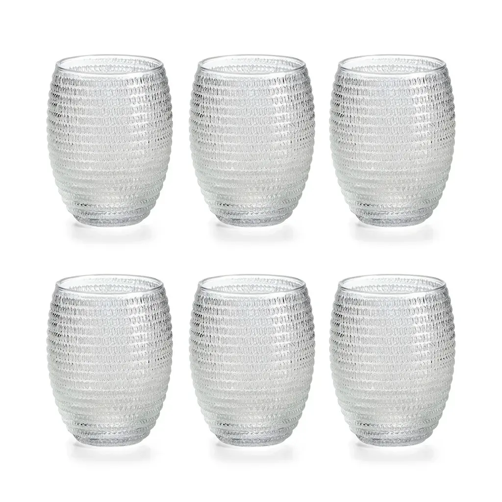 The Helix Tumbler set includes six blown glass glasses featuring exclusive optic designs. Perfectly suited for both everyday use and elegant table settings, these tumblers add a touch of refined style to any occasion. Choose from a classic transparent design or bold assorted colors for a unique addition to your tablescape design. Highlights