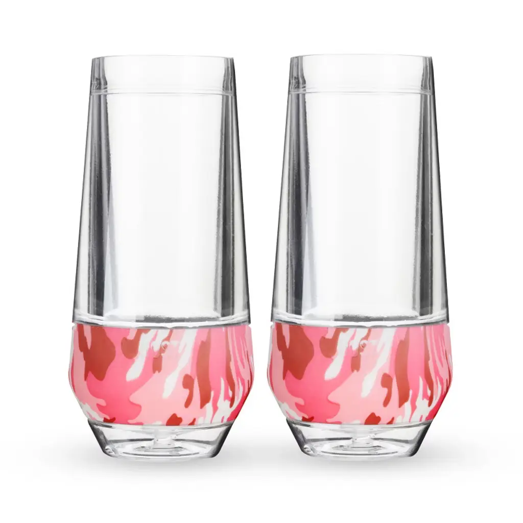 INSULATED WITH ACTIVE COOLING GEL Kick lukewarm champagne to the curb Unless you actually like room temperature bubbly (which would be, uh, frankly concerning), the Champagne FREEZE™ is the way to go. Double-walled, filled with a layer of active cooling gel, and sporting a comfortable silicone grip in trendy pink camo, this cute champagne flute keeps your favorite sparkling wine chilled, crisp, and delicious, even if you take forever to drink it. Keep your bubbles cold for 2 hours. Quantity: 2 cups Capacity: 9 oz. Materials: BPA-free plastic, active cooling gel, silicone Design: Insulated walls with active cooling gel Care: Hand wash Directions: Stash your Champagne FREEZE™ upside down in the freezer for refreshingly cold wine or cocktails. For best results, chill for 2+ hours before using. A Non-Comprehensive List of Drinks to Serve In Your Champagne FREEZE™ flutes: Mimosas, Champagne Cocktails, Bellinis, French 75s, Prosecco, Kir Royale, your favorite beer, chocolate mousse… follow your heart!