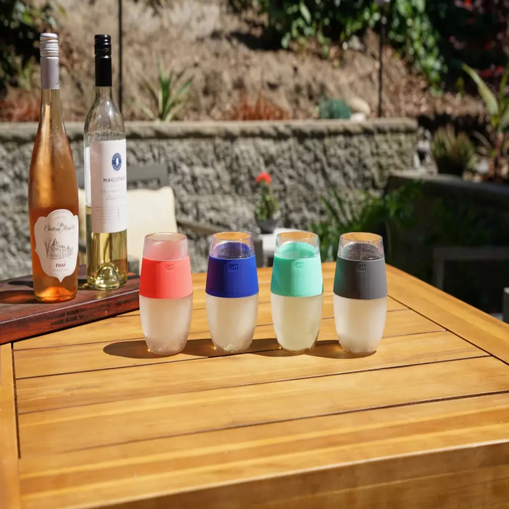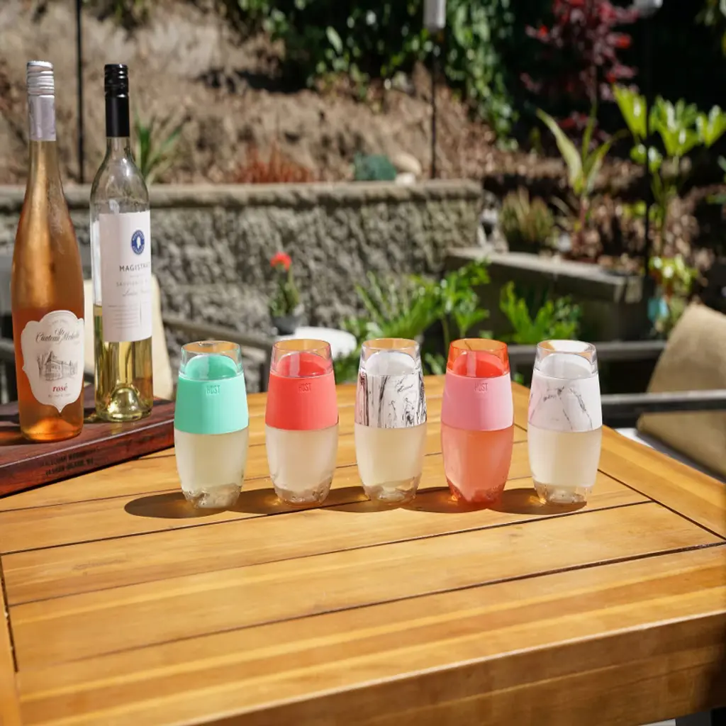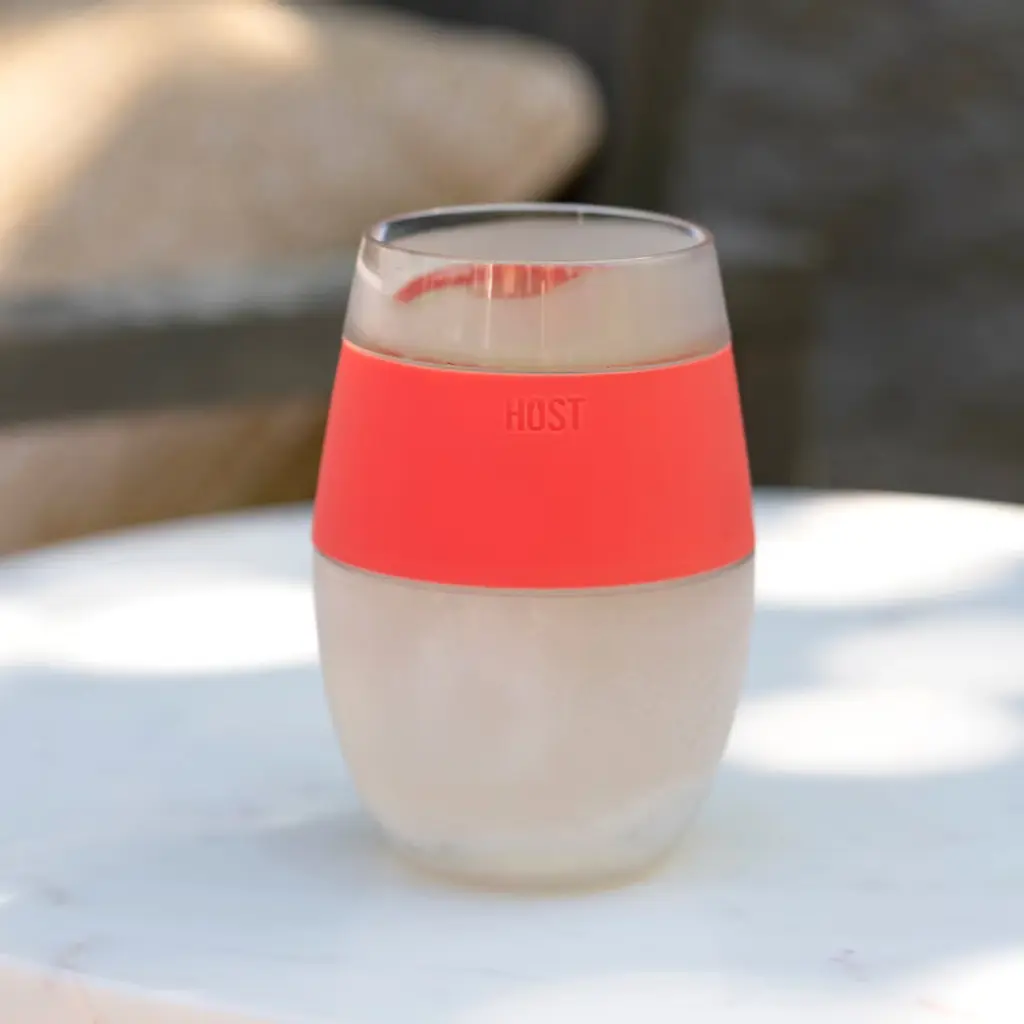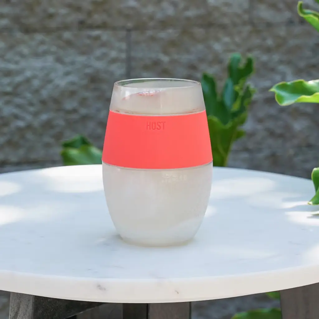 WINE FREEZE Cooling Cups are perfect for all wines. Each stemless wine tumbler features our proprietary cooling gel which allows the cups to be frozen or chilled to the ideal temperature for serving and enjoying any wine varietal. For red wine, refrigerate the Wine FREEZE for at least two hours to keep your drink between fifty-eight and sixty degrees Fahrenheit. For white wine, freeze the Wine FREEZE for at least two hours to keep your drink between forty-three and fifty-three degrees Fahrenheit. The Wine FREEZE is precisely engineered to keep your beverage perfectly cold for hours. Each stemless tumbler is constructed with an insulated silicone band for comfortable handling, and can easily accommodate 8.5 ounces. Hand wash only. For the best results, place the Wine FREEZE upside down in the freezer to allow the gel to evenly spread and freeze. Originally developed for wine, the HOST FREEZE line has grown to include popular whiskey tumblers, beer drinkware, cocktail glasses and other cooling accessories in dozens of colors. HOST’s beverage accessories solve everyday problems with creative engineering. From versatile wine accessories to chilling drinkware, these easy-to-use gadgets make life refreshing for everyone.
