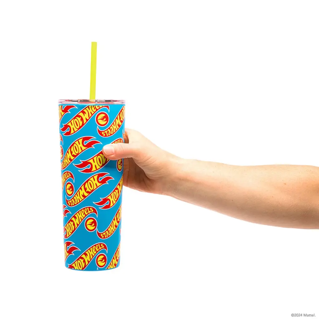 Introducing the Official Hot Wheels Tumbler! Fuel your passion for speed with this iconic merchandise featuring the classic Hot Wheels logo. This water tumbler with straw is designed for performance, keeping your drinks hot or cold for hours whether you're on the move or at the track. Designed for the fast-paced lifestyle of Hot Wheels fans, this travel tumbler is a stylish and practical way to stay hydrated on the go. It comes with a lid and straw, making it convenient and spill-proof for your adventures. Ready to gift, this race-themed insulated coffee tumbler is perfect for surprising someone special or adding to your own Hot Wheels collection. Crafted from high-quality stainless steel, it's sustainable, reusable, and comes with a lifetime limited manufacturer’s warranty for your peace of mind. Elevate your hydration game with the Official Hot Wheels hot and cold tumbler and bring the excitement of Hot Wheels wherever you race in life!
