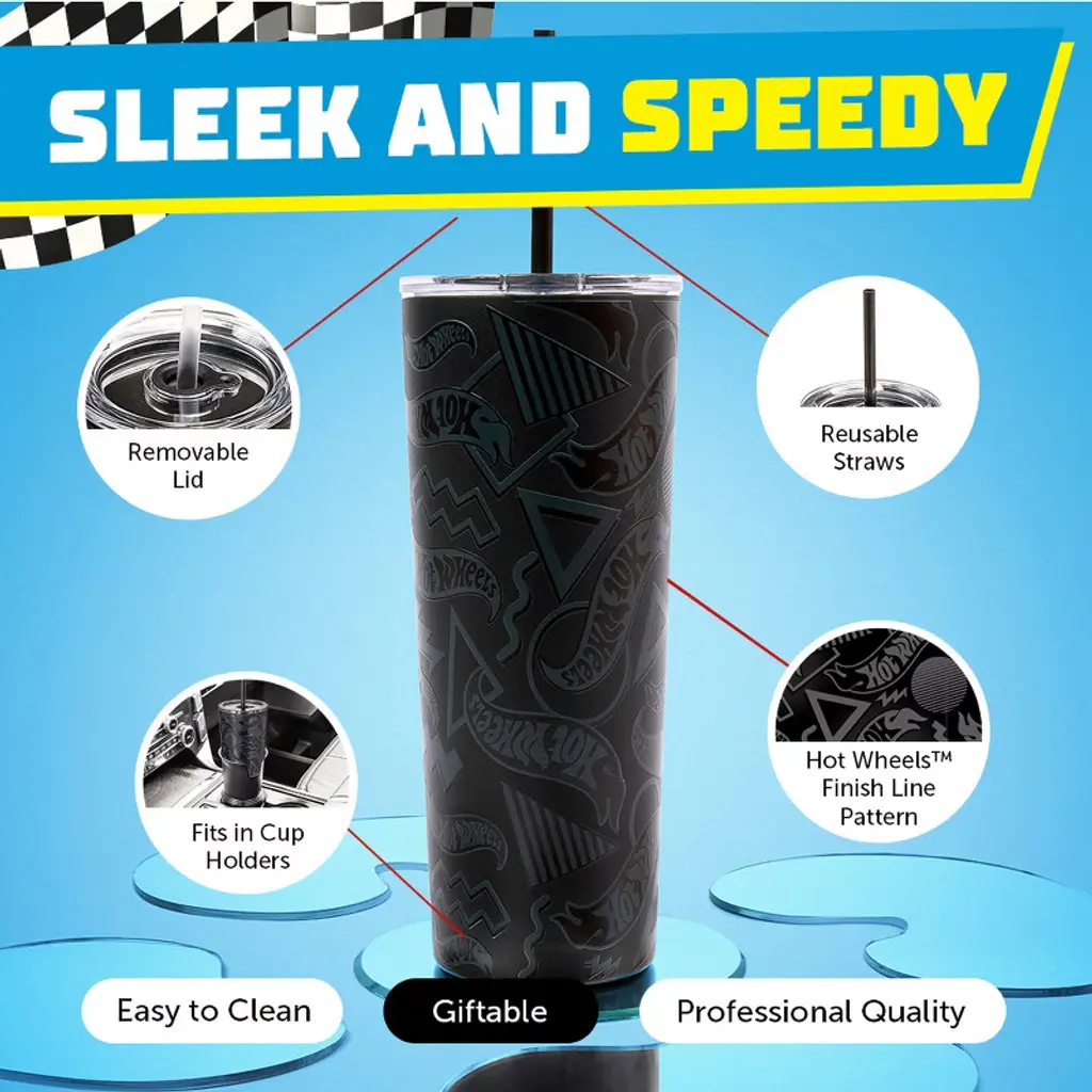 Introducing the Official Hot Wheels Tumbler! Fuel your passion for speed with this iconic merchandise featuring the classic Hot Wheels logo. This water tumbler with straw is designed for performance, keeping your drinks hot or cold for hours whether you're on the move or at the track. Designed for the fast-paced lifestyle of Hot Wheels fans, this travel tumbler is a stylish and practical way to stay hydrated on the go. It comes with a lid and straw, making it convenient and spill-proof for your adventures. Ready to gift, this race-themed insulated coffee tumbler is perfect for surprising someone special or adding to your own Hot Wheels collection. Crafted from high-quality stainless steel, it's sustainable, reusable, and comes with a lifetime limited manufacturer’s warranty for your peace of mind. Elevate your hydration game with the Official Hot Wheels hot and cold tumbler and bring the excitement of Hot Wheels wherever you race in life!