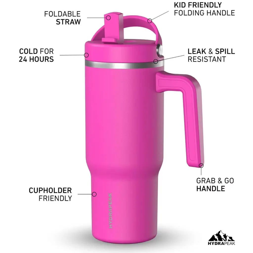 Hydrapeak Kids Voyager 18 Oz Stainless Steel Tumbler With Handle And Spill Proof Straw Lid (Fuchsia)