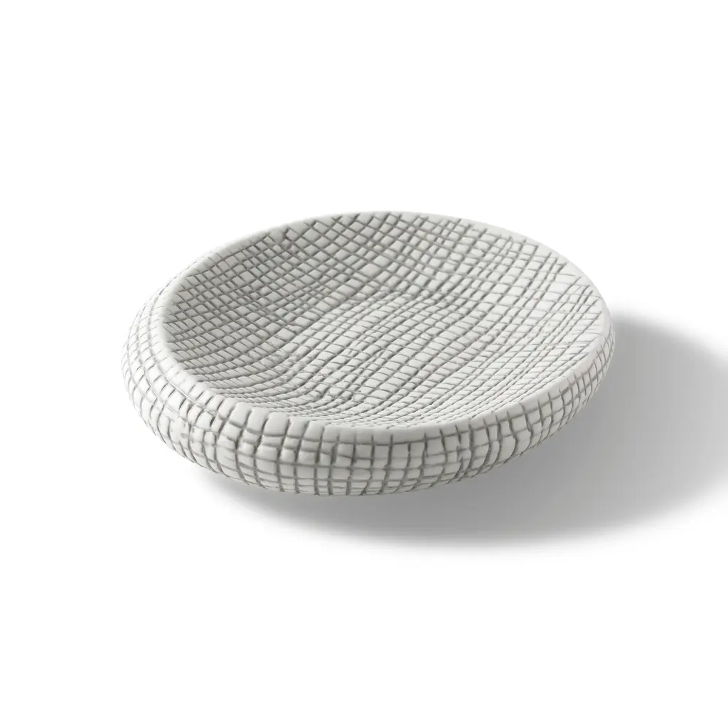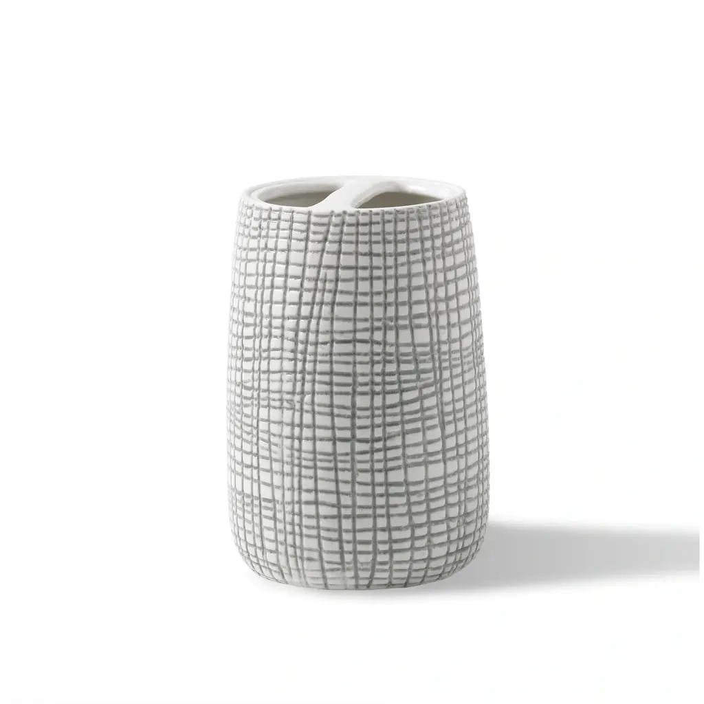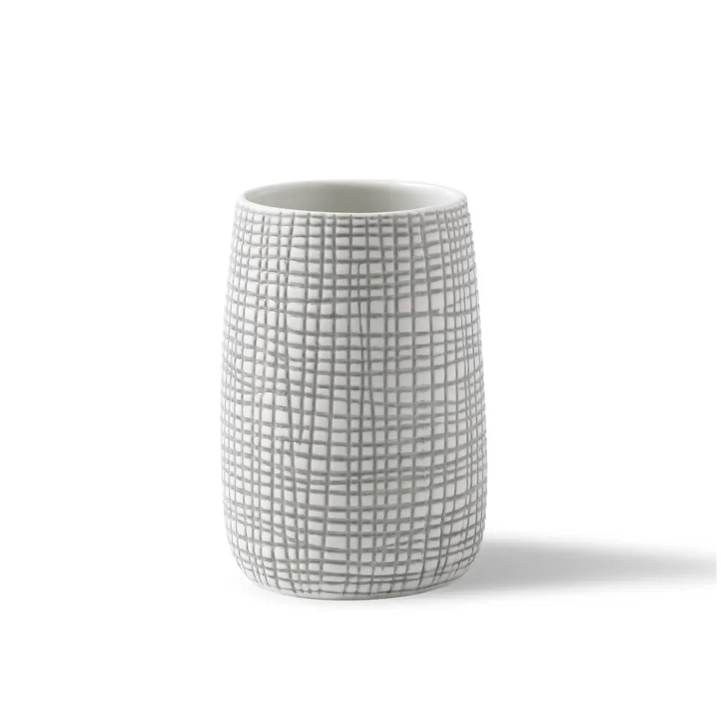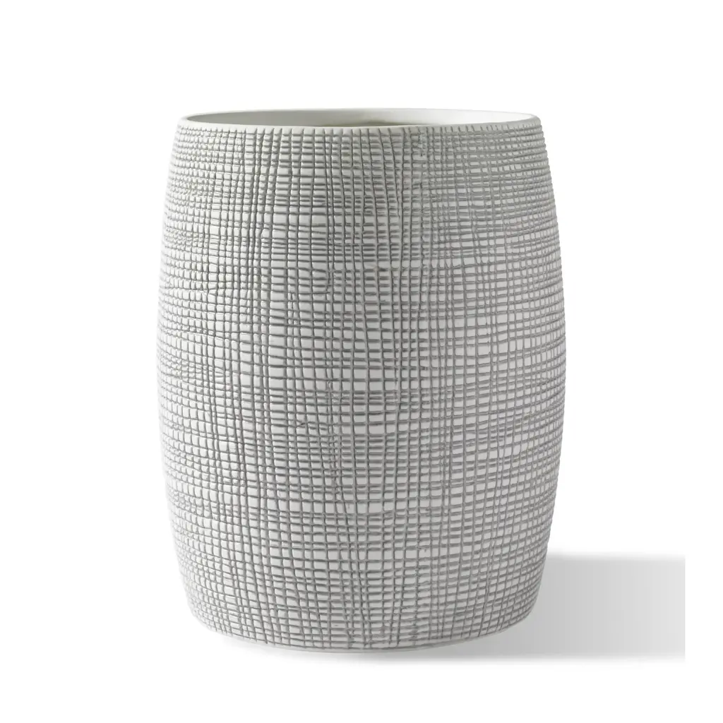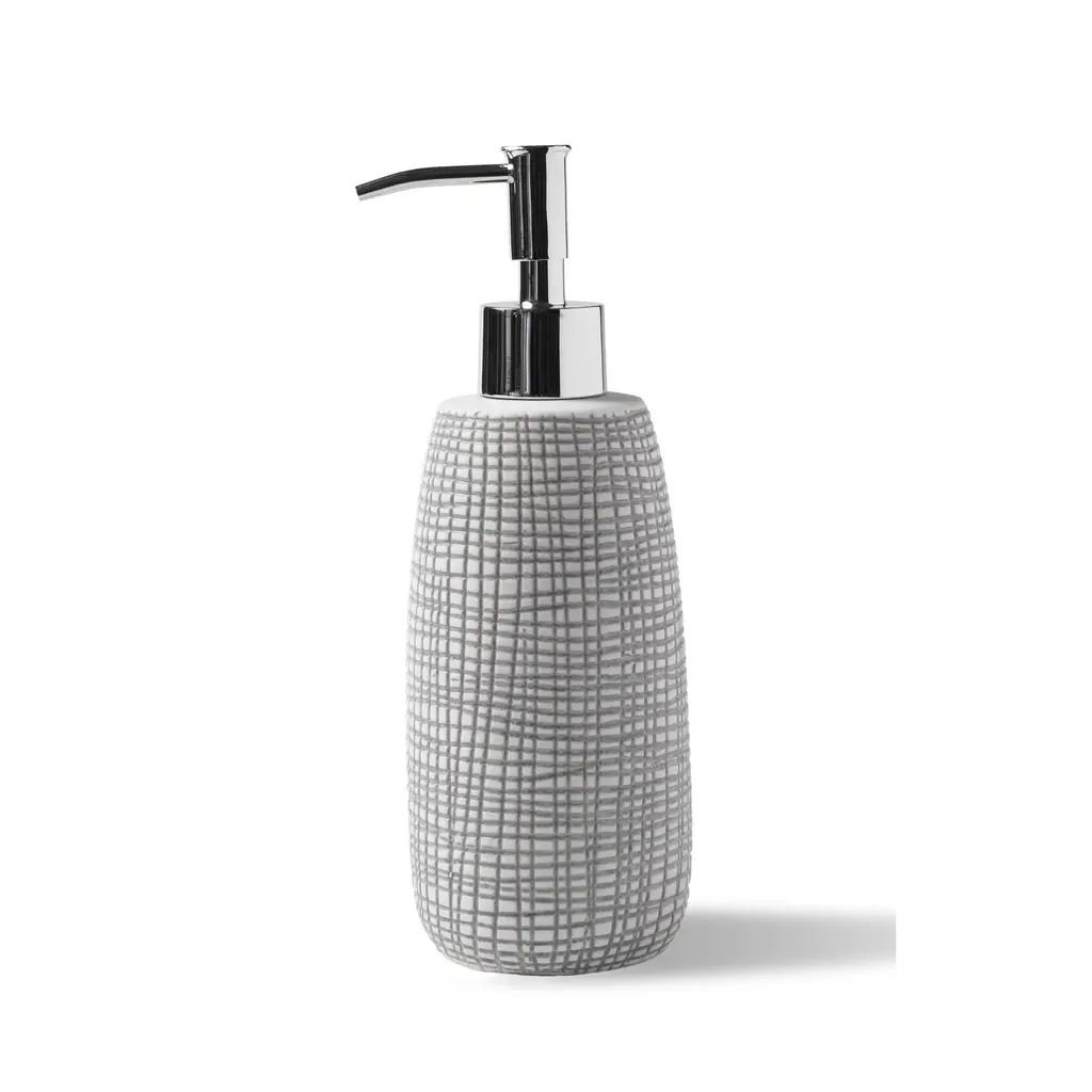 Bring the beauty of nature into your bathroom with the Cestino Bath Accessory Collection. Crafted from 100% embossed porcelain with painted details that imitate raffia palms, each piece exudes a serene and chic atmosphere. The stainless steel pump adds a touch of modern elegance. Each item is sold separately, and the collection includes a lotion dispenser, cotton jar, tissue holder, soap dish, tumbler, toothbrush holder, tray, and waste basket. Please note that the tumbler is not intended for use as a drinking cup. Clean these porcelain bath accessories easily with soap and water.Features:Dimensions: