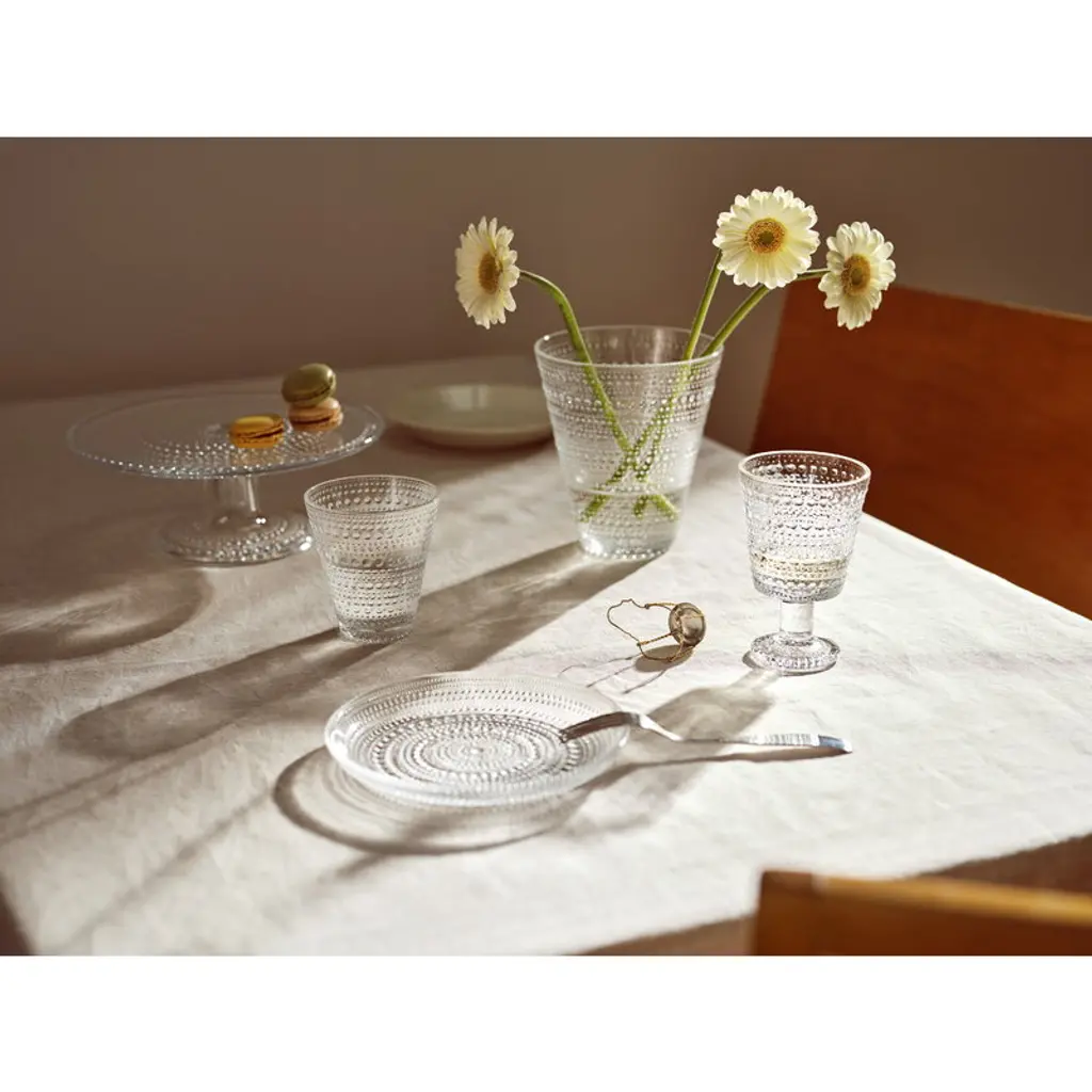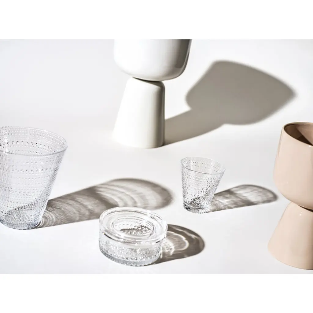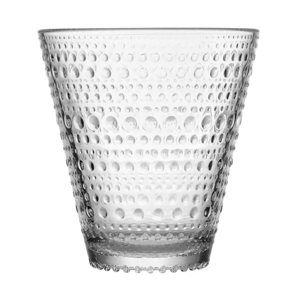 Iittala's Kastehelmi tumblers are part of the popular glass collection designed by Oiva Toikka. The 10.14 fl oz (3 dl) tumblers come in a set of four. In the 1960s, designer and artist Oiva Toikka set out to create a surface pattern that would conceal the joint marks in pressed glass. The result was Kastehelmi, Finnish for dewdrop, designed in 1964. Featuring delicate glass droplets arranged in a series of rings, Kastehelmi plays with light in the most beautiful way. Its playful elegance suits any table setting, from morning to night and from casual to formal.