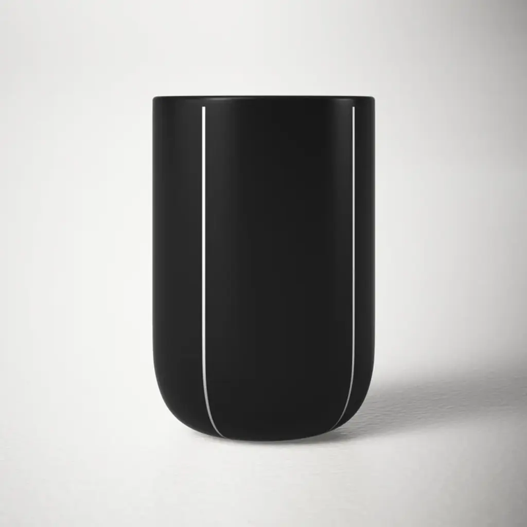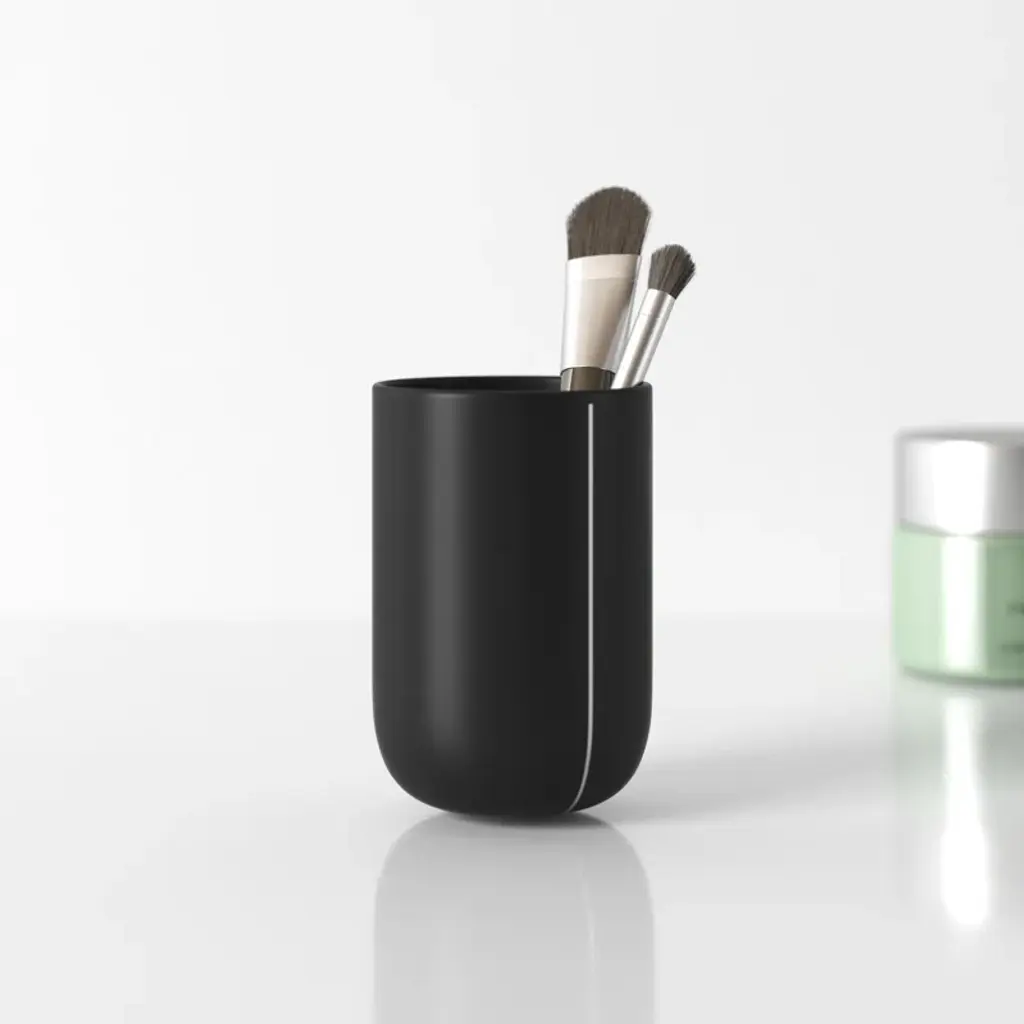 Simple storage. This tumbler holds toothbrushes, grooming tools, or toiletries while its minimal lines bring an uncluttered look to your bathroom counter. It’s crafted from water-resistant stoneware with a smooth black finish and embellished with a painted white stripe. Not for use as a drinking cup.