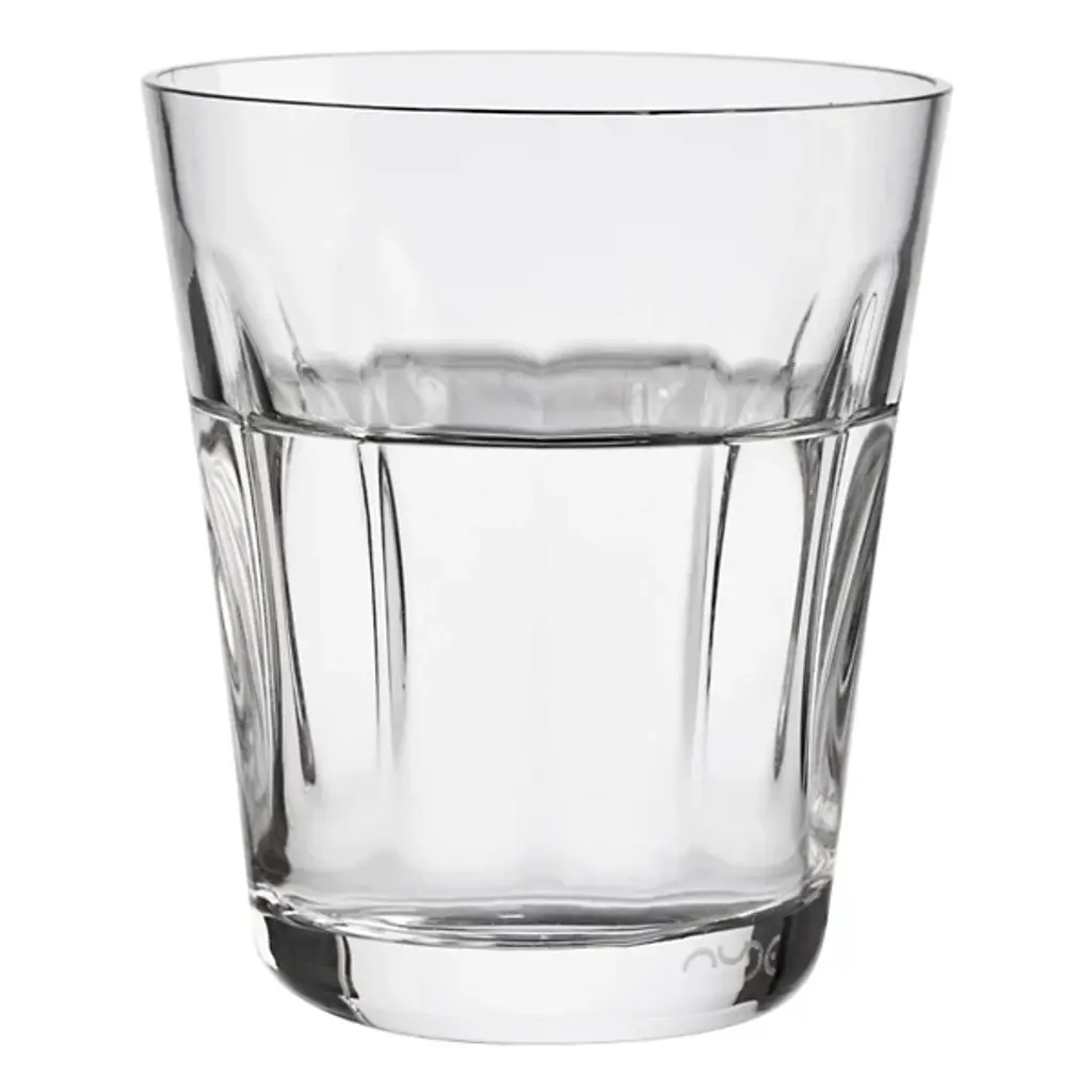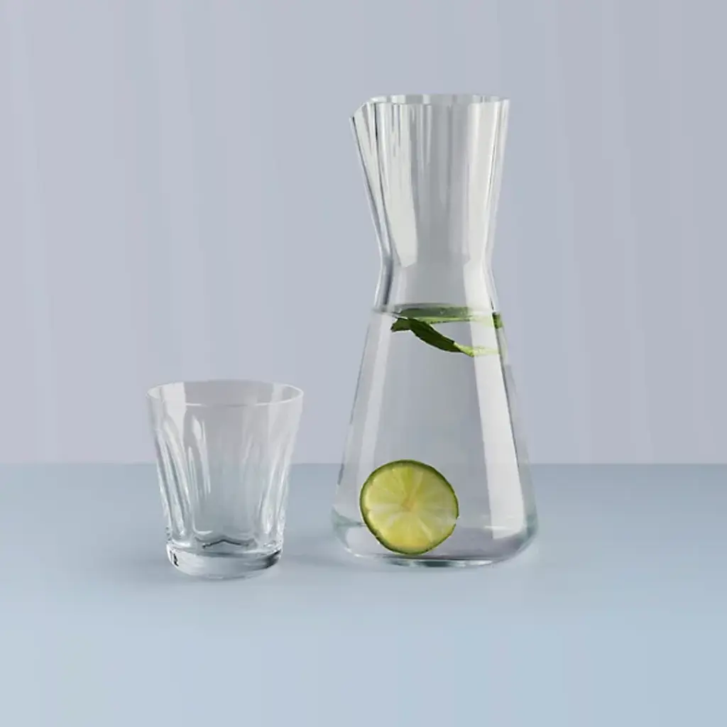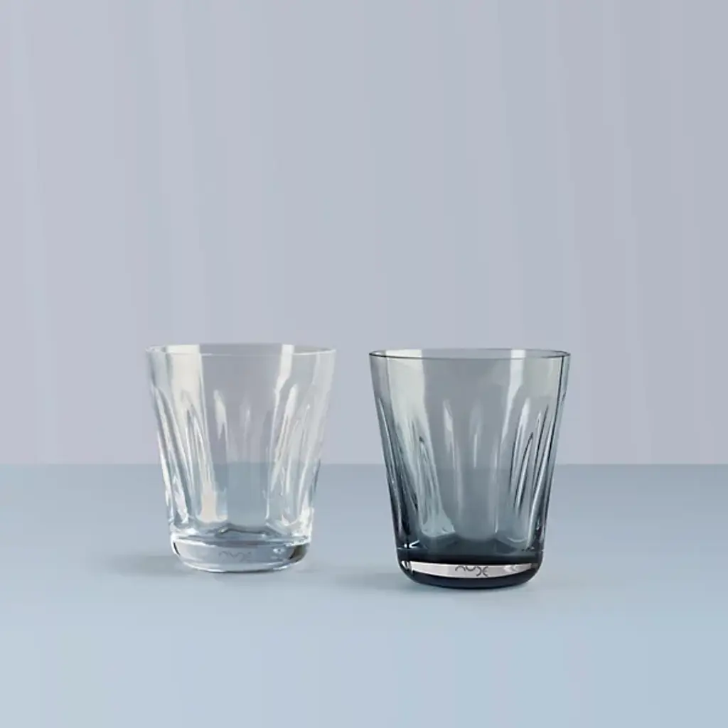 The Lady Tumbler, Set of 2 from Nude Set showcases delicate pleated ridges that gather around its rim, like fabric folds in motion. Designed by Tomas Kral and crafted in Turkey from lead-free crystal, the textured collar contrasts beautifully with the smooth cylindrical body below. The architectural detail references historical crisp ruffled collars while maintaining clean contemporary lines throughout the entire glass structure for modern table settings.
