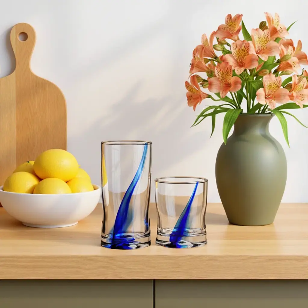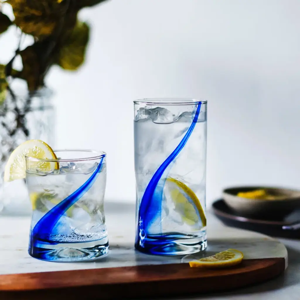Libbey Glassware Tumbler and Rocks Glass Sets: Crafted with precision and elegance, this rocks glasses set of 16 is designed to enhance your drinking experience and elevate your style. Whether you're enjoying a refreshing cocktail, sipping on your favorite whiskey, or hosting a dinner party, these versatile glass sets are a must-have for any occasion. With our mixed drinkware sets, you can effortlessly serve a wide range of beverages to suit every taste. This set of drinking glasses for everyday use has an impressive artisan-inspired blue streak infused onto each glass making them unique. The crystal-clear glass allows you to appreciate the vibrant colors merging art with functionality. Libbey Glassware is renowned for its exceptional quality and durability, and our glass tumbler set is no exception. Made from premium materials, the simple four-dimple design of these dinner glasses provide a comfortable drinking experience, allowing you to savor every sip without any distractions. Our glass sets for drinking are not only functional but also aesthetically pleasing. The sleek and modern design of these modern drinking glasses adds a contemporary touch to your home bar or kitchen. Whether you're enjoying a quiet evening at home or hosting a lively gathering, these glasses will impress your guests and make a statement. This set of tumbler and rocks glassware is also perfect for everyday use. Whether you're enjoying your morning juice, hydrating with water throughout the day, or indulging in a nightcap, these glasses are designed to meet your daily drinking needs. The versatile size and shape of our tumbler glass makes it suitable for a wide range of beverages, making them a practical and stylish addition to your kitchen essentials.