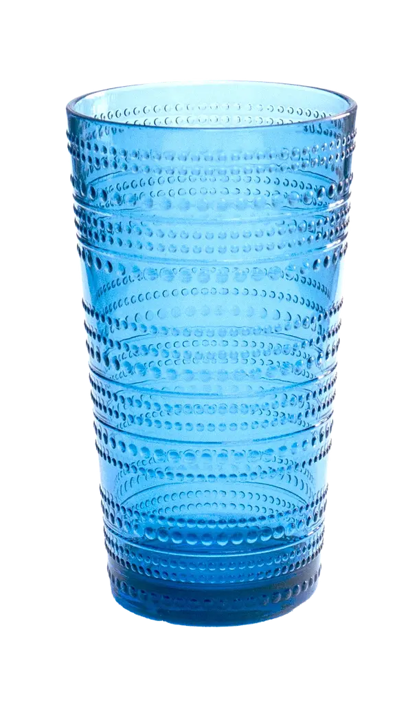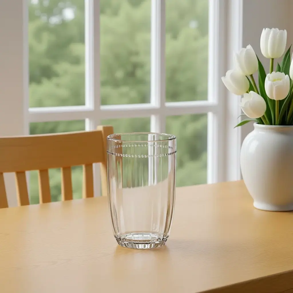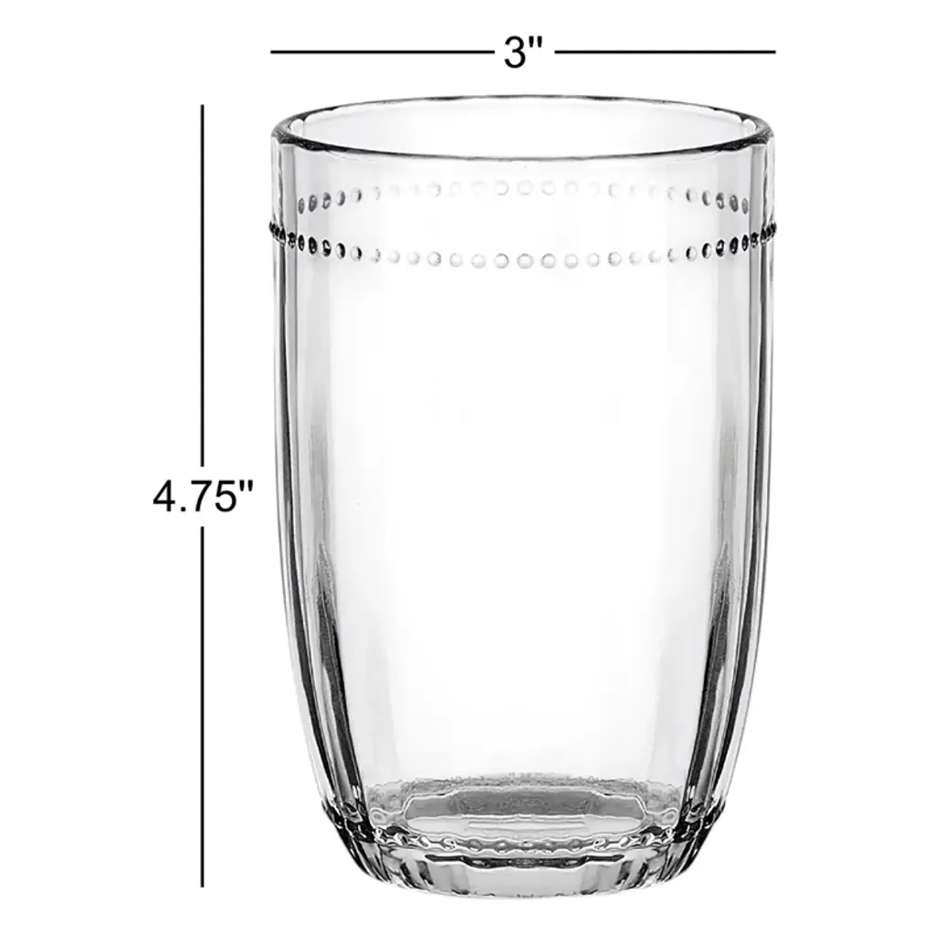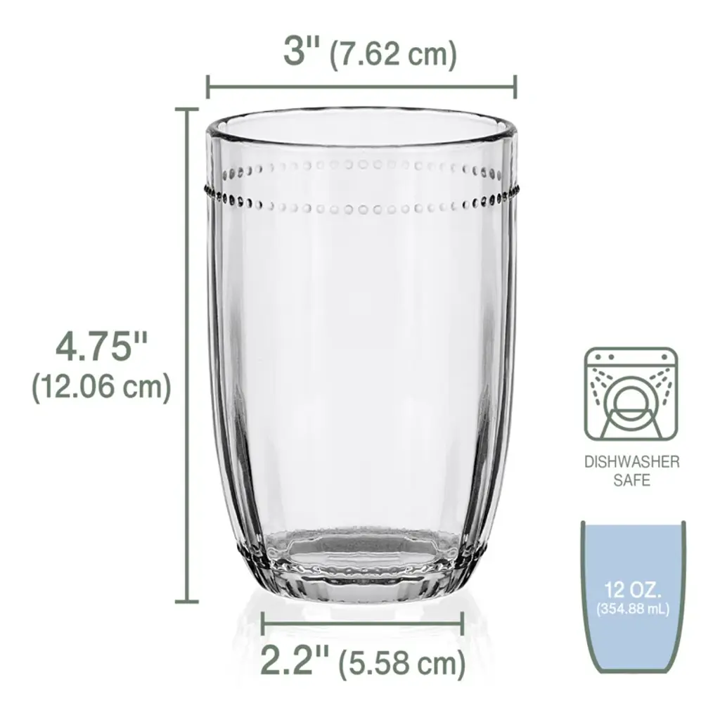 Each glass in this set of 4 beaded highball glasses features vertical lines and horizontal, beaded details that bring an elegant look to your glassware collection. The stunning designs add a touch of modern style to your table or home bar. Beautifully crafted and made of pressed glass. Dishwasher safe. Measure 4.75 inches in height and 3 inches in diameter each. Holds up to 12 fluid ounces each.