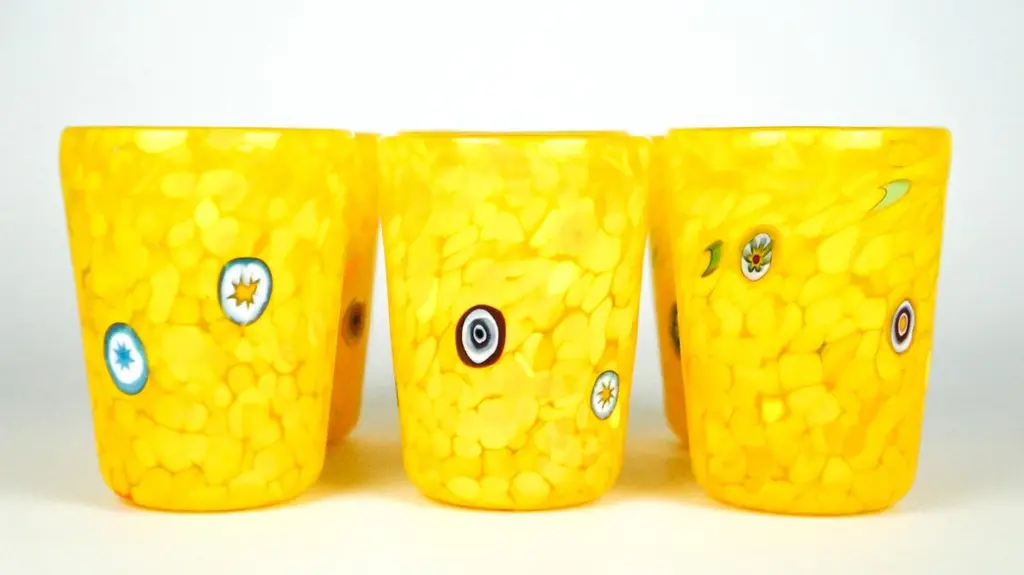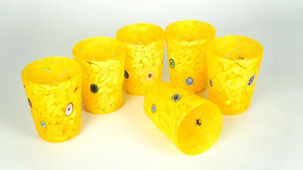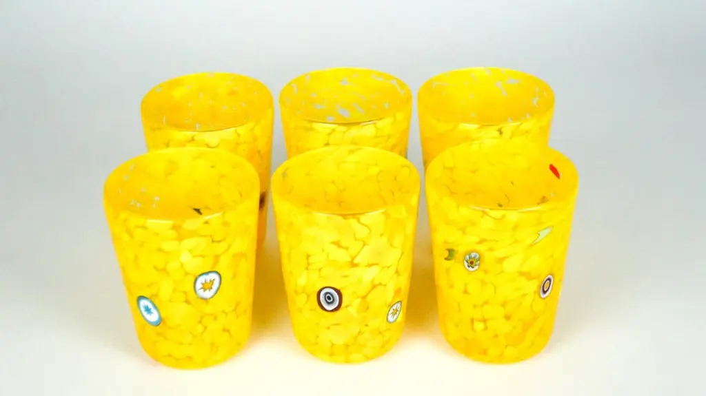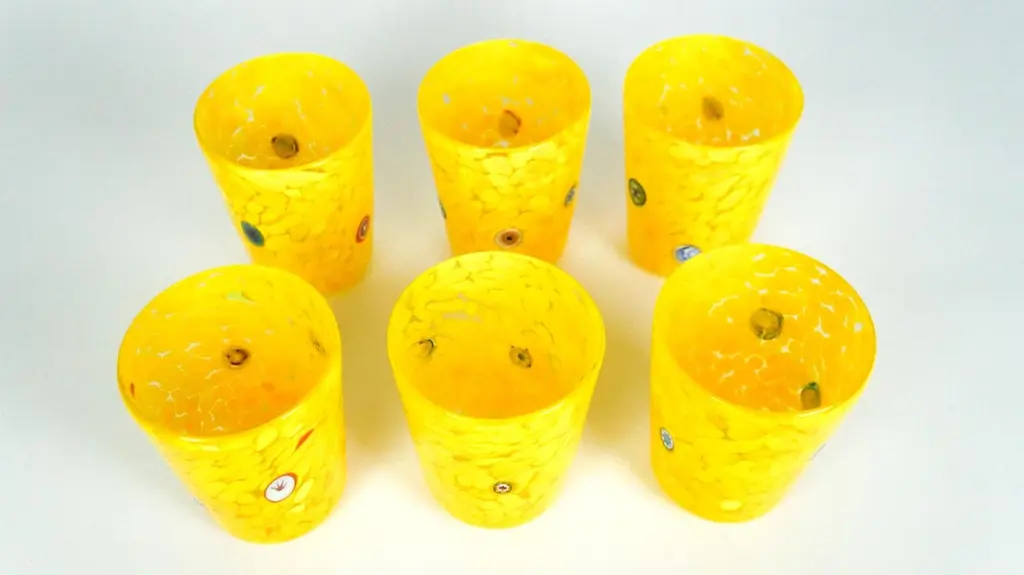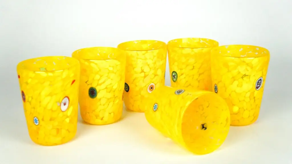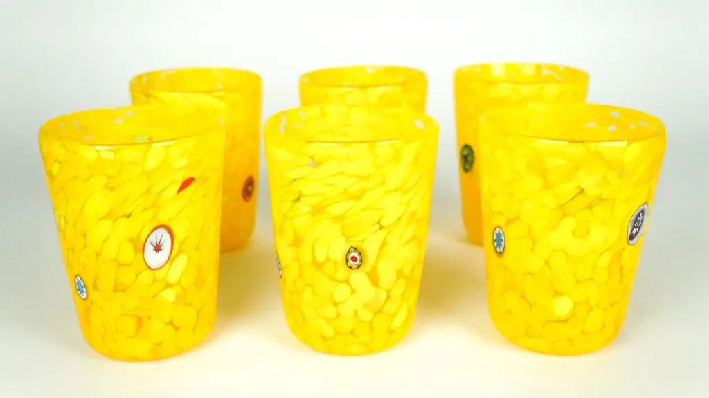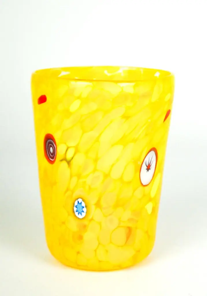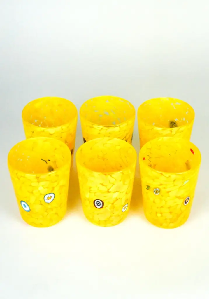 Set of yellow glasses with Millefiori murrina decoration.This set is called "Goti De Fornasa". Tradition wants that the Murano glass master with his employees did these Murano glasses to drink during work breaks. The set includes six Murano drinking glasses (red colors with decorations in murrina Millefiori), depending on the pleasure.Each piece is unique in the world in color and form being made solely by hand without the use of molds and shapes.