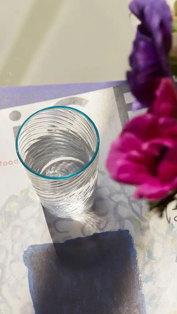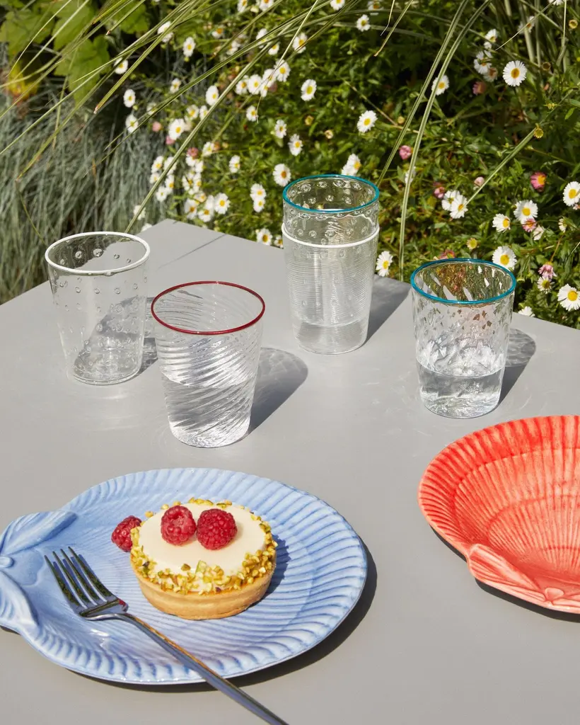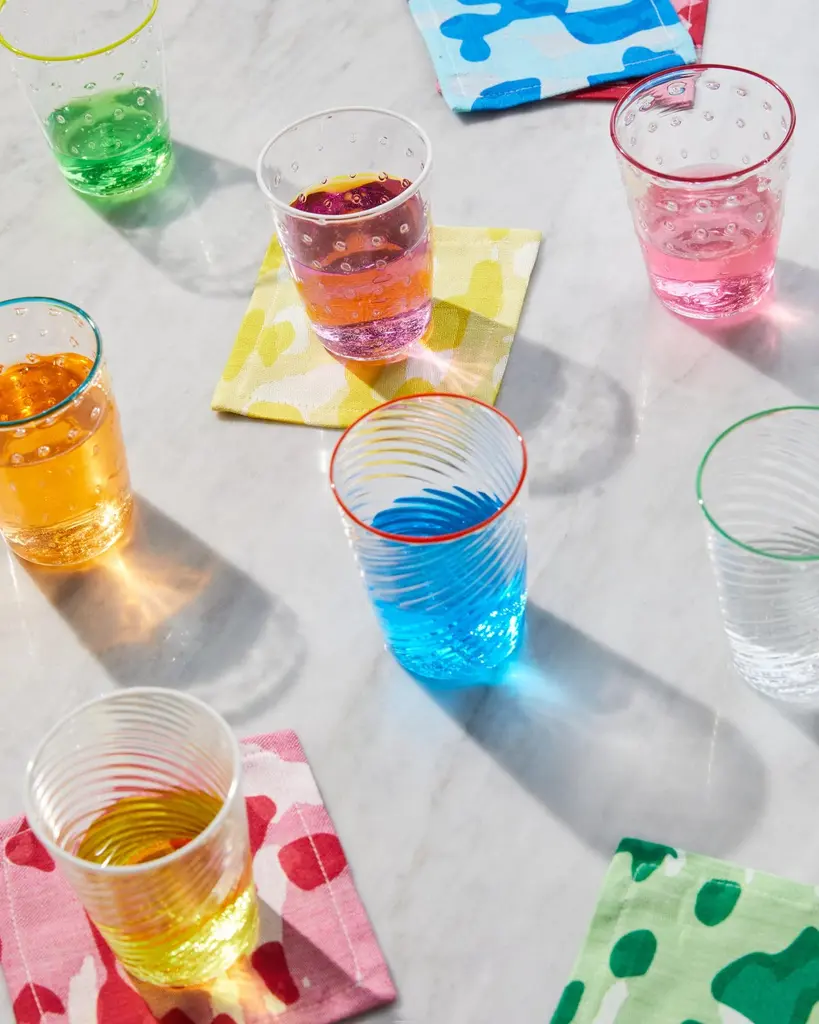 Discover our Ultralight Murano glass tumblers, meticulously crafted by an expert Maestro who specialize in the art of mouth blowing. These tumblers are skillfully created without the use of molds, ensuring their unique and handcrafted quality. Immerse yourself in the incredible light and ethereal texture of these tumblers, enriched with two distinctive patterns. One pattern features small air bubbles, adding a touch of whimsy, while the other showcases elegant curved lines. The combination of these textures creates a visually captivating and tactile experience. The hot-applied colored rims offer endless possibilities for mix and match options among the different sets. Not only are these tumblers functional for everyday use, but they also serve as stunning decorative pieces. Whether you prefer a coordinated set or a playful mix, these tumblers bring a touch of elegance and artistic flair to any table setting. Elevate your drinking experience with these handcrafted tumblers, bringing the rich heritage of Murano to your table.