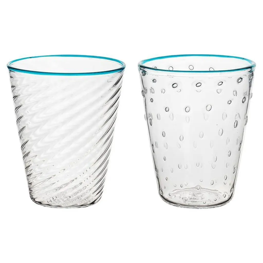 Discover our Ultralight Murano glass tumblers, meticulously crafted by an expert Maestro who specialize in the art of mouth blowing. These tumblers are skillfully created without the use of molds, ensuring their unique and handcrafted quality. Immerse yourself in the incredible light and ethereal texture of these tumblers, enriched with two distinctive patterns. One pattern features small air bubbles, adding a touch of whimsy, while the other showcases elegant curved lines. The combination of these textures creates a visually captivating and tactile experience. The hot-applied colored rims offer endless possibilities for mix and match options among the different sets. Not only are these tumblers functional for everyday use, but they also serve as stunning decorative pieces. Whether you prefer a coordinated set or a playful mix, these tumblers bring a touch of elegance and artistic flair to any table setting. Elevate your drinking experience with these handcrafted tumblers, bringing the rich heritage of Murano to your table.