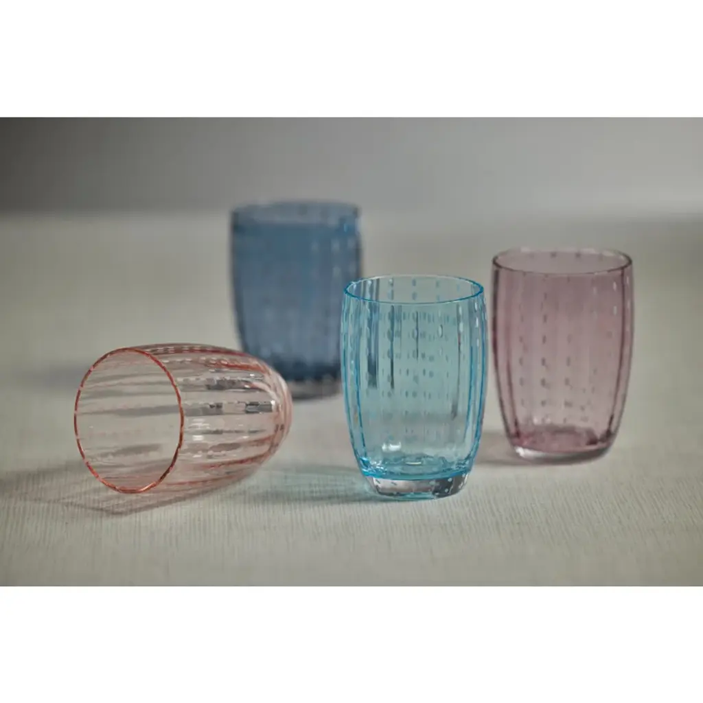 Spice up your dinner parties with glasses that shine. This set of 4 tumblers features colored glass with white dotted pattern. Fun with just the right amount of boldness, these drinking glasses are versatile enough for any use or occasion.