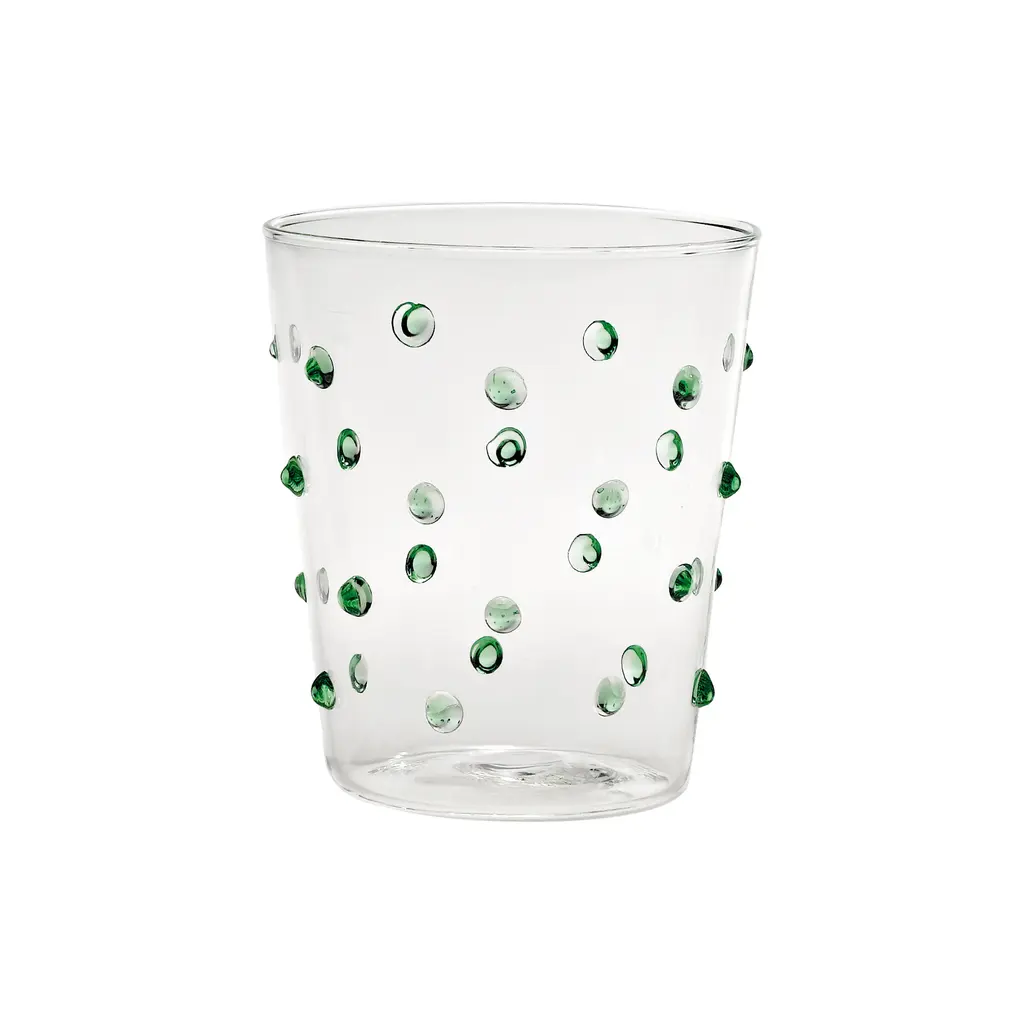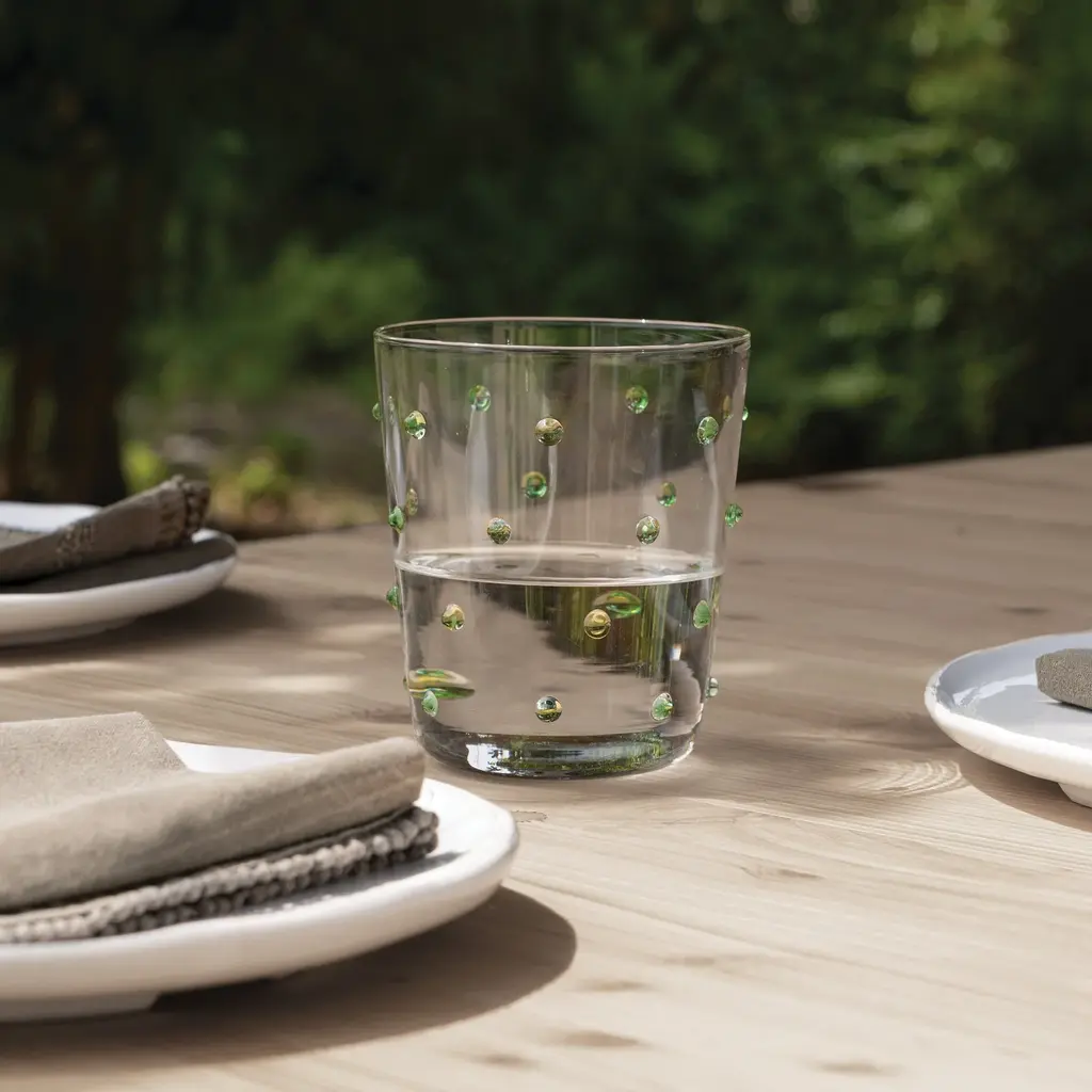 A simple glassware design that makes a lasting impression, the Party Tumbler Glass from Zafferano brings unexpected beauty to any table setting to your home. Handcrafted from borosilicate glass, these tumbler glasses are the perfect size for fresh squeezed juice in the morning or a lively cocktail in the evening. Accented by three dimensional orbs, this simple, yet sophisticated tumbler is ready to elevate your everyday mealtimes or accent your barware collection with classically chic style.Highlights