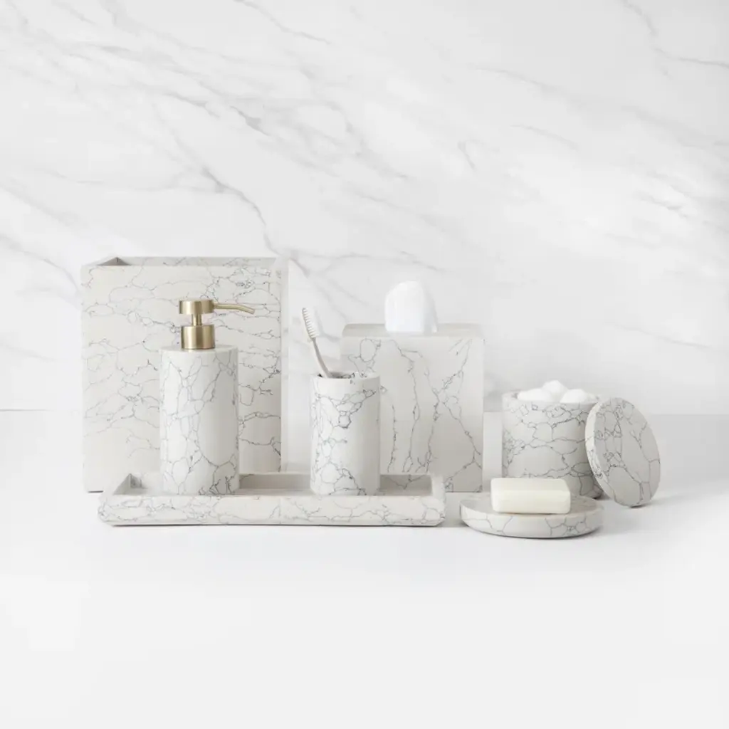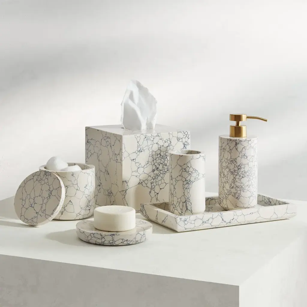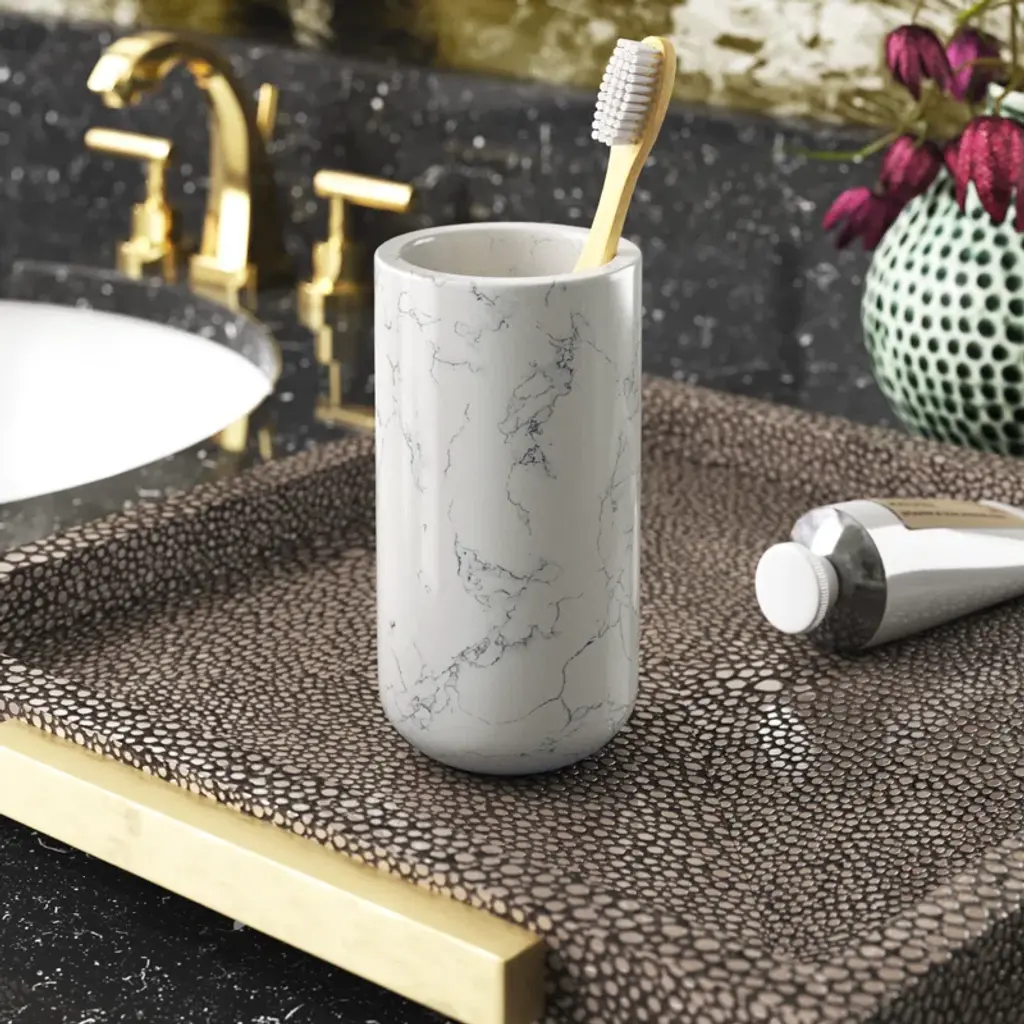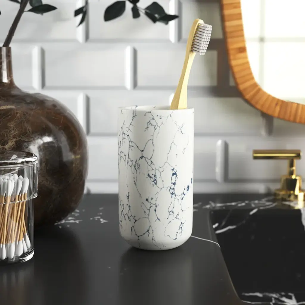 Add an effortlessly elevated accent to your bath or powder room with this versatile tumbler. It's crafted from stone in an off-white hue, and it has blue veining throughout for an eye-catching look we love. This piece is just right for keeping your toothpaste and brush upright. Plus, it doubles as an unexpected holder for faux flowers or makeup brushes.