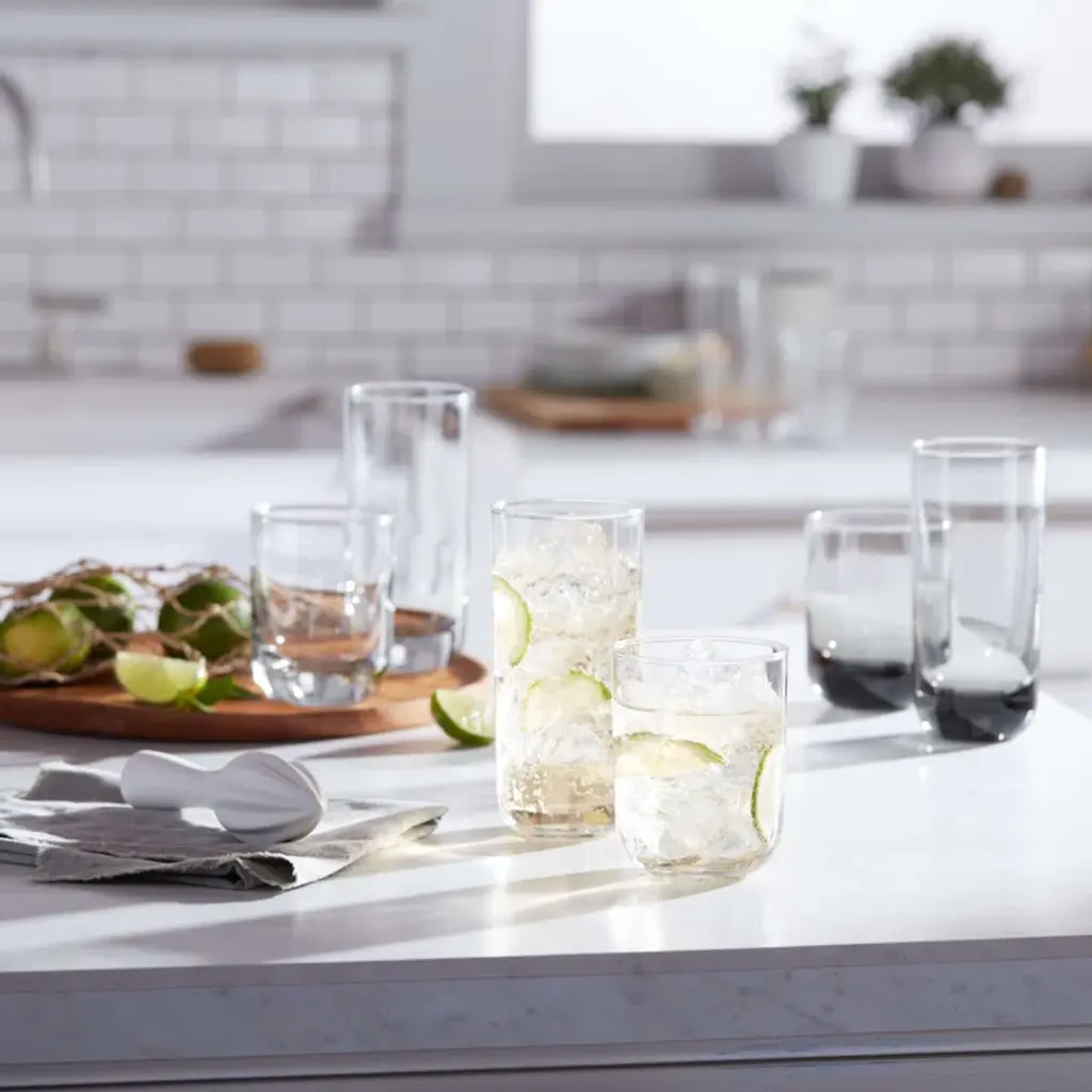 Clink-worthy clarity. This 16-piece set includes eight tall glasses and eight shorter tumblers – ideal for everything from iced coffee to cocktail hour. Made from clear, lead-free glass with a smooth, minimalist shape. Dishwasher safe + BPA-free.