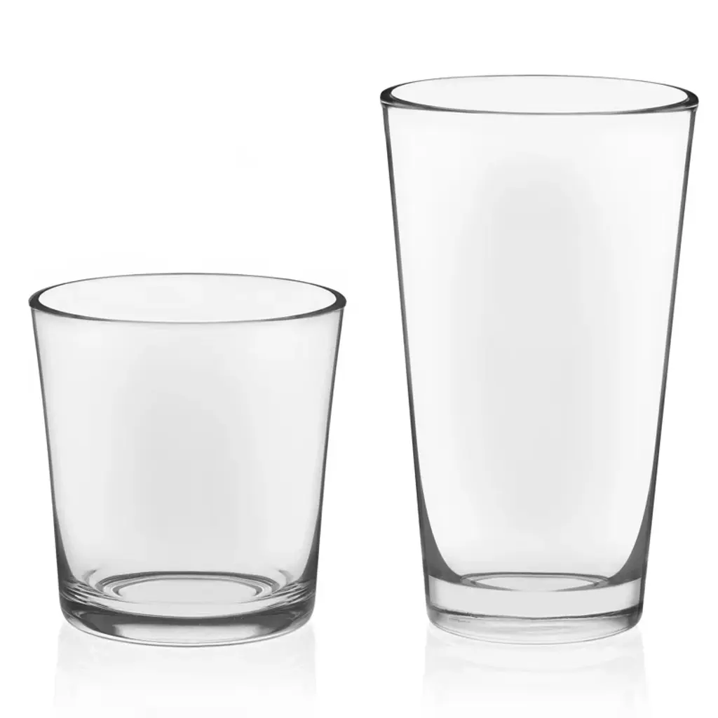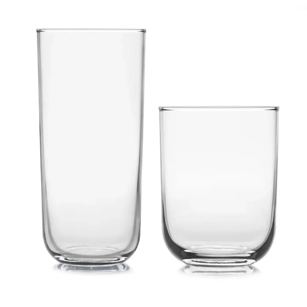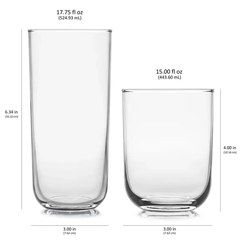 "Raise your glass to this chic set of 16 Axis drinking glasses. The set includes eight 17.75-ounce tumblers and eight 15-ounce double old-fashioned rocks glasses, all showcasing the perfect blend of form and function. Each glass is designed with sleek, straight lines and a minimalist aesthetic that is sure to make any cocktail shine. Plus, the heavy base ensures stability and a luxurious feel in your hand. These glasses are a great addition to your home bar, or an excellent gift for any occasion. Cheers to that!"