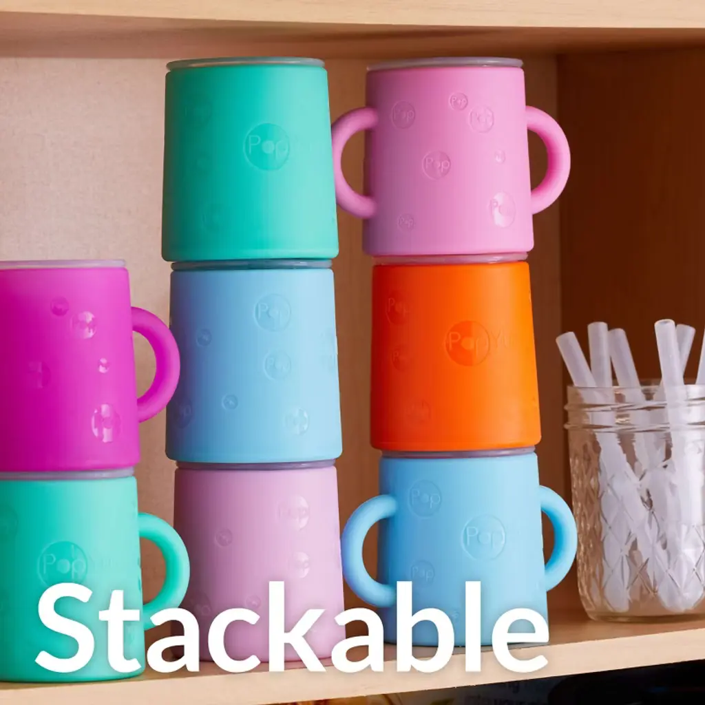 ✅ COLORFUL TRAINING STRAW CUPS: Ideal for helping babies and toddlers migrate from bottles to cups. They are great for use at home and on the go! PopYum’s larger 5 ounce (150 ml) cups are usable over a longer period of your child’s developmental cycle. Promotes optimal oral development compared to traditional sippy cups. Includes a mint green cup with handles and a pastel pink cup without handles. ✅ CLEAR LID + STRAW BUMPER: PopYum training cups can be used as an open cup (without the lid and straw) for independent drinking or as a straw cup. We made the lid clear so you can quickly see if the cup is empty without having to remove the lid. A straw bumper helps prevent your little one from pulling the straw out. ✅ TIP RESISTANT AND UNBREAKABLE: A wide base and bottom-heavy design make a tip resistant cup and reduce spillage. The silicone material is flexible and unbreakable so parents don’t have to worry about them breaking if dropped. Soft silicone reduces potential injury to developing gums and teeth. ✅ MULTI-PURPOSE SNACK CUPS: They are also large enough to hold small finger foods and snacks including cut vegetables, fruit, crackers and more! ✅ DISHWASHER SAFE, STACKABLE AND BPA FREE: The cups are dishwasher safe, microwavable and freezer safe! They are also stackable! Stack them in your cupboard to save space. Made of premium stain and odor resistant silicone which is free of BPA, BPS, PVC, latex and phthalates.