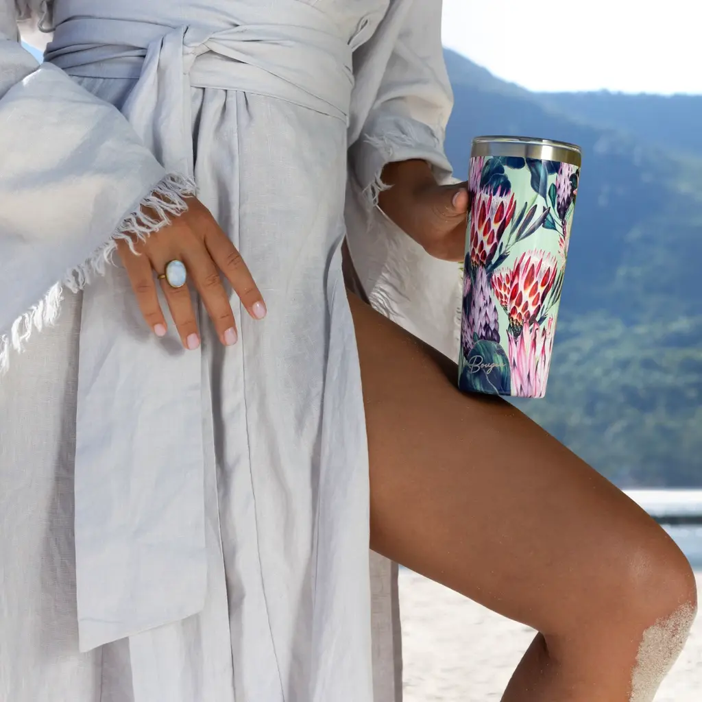 Indulge in the captivating beauty of Protea with our travel tumbler! Its vibrant blooms are sure to mesmerize, while the convenient Flip 'n' Sip Straw Lid keeps your favorite drinks at just the right temperature. Whether it's a refreshing sip or sharing chilled wine with friends, this tumbler is the perfect gift for any occasion. Keep your drinks cold for 24 hours and warm for 12 hours – cheers to that!
