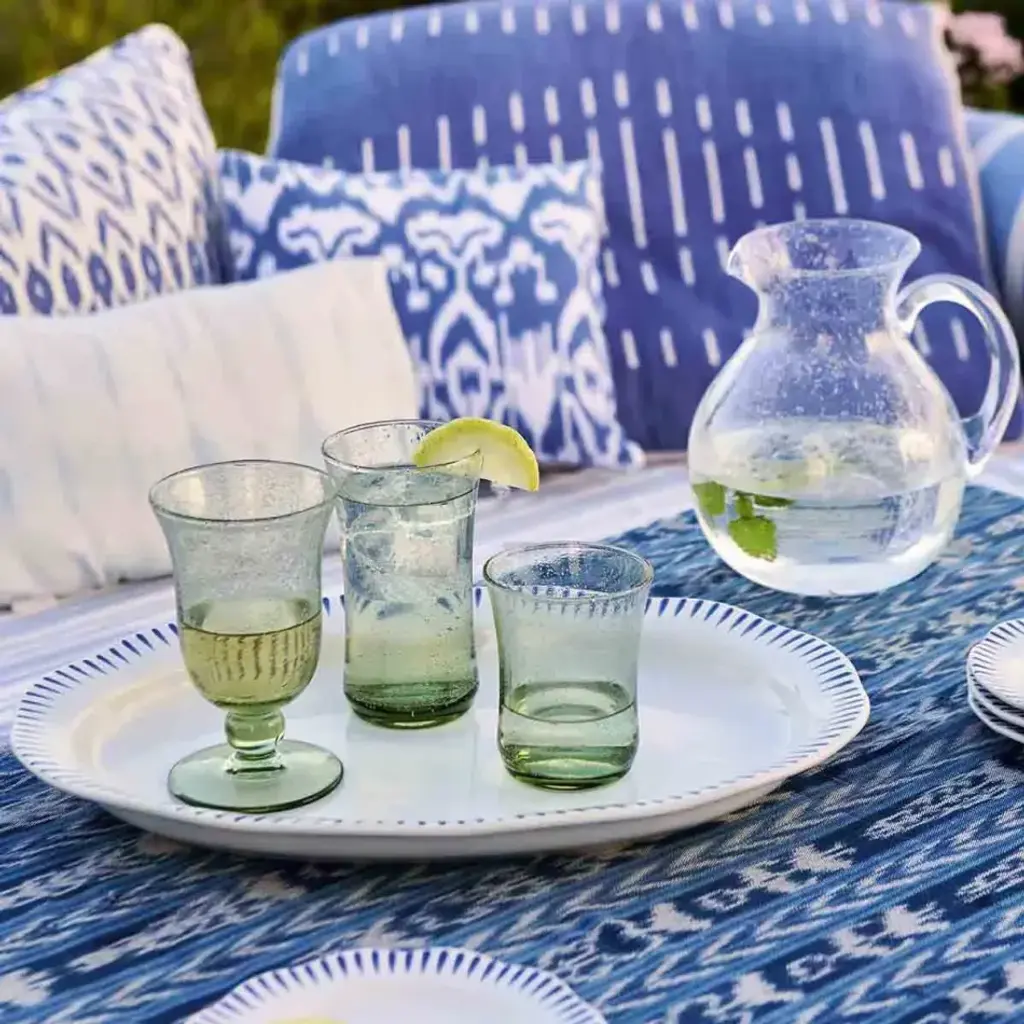 Inspired by the traditional bubbly glassware from Provence and of sturdy construction to make everyday drinking, effervescent. For water, wine, and everything in between, this mouth-blown tumbler is small in stature but large in sparkle - bringing a charming spirit of joie de vivre to every sip. Offered in four chic and versatile hues: Basil, Chambray, Blush, and Clear (we always love to add a pop of color to the table with colorful glass)! Based in Connecticut, Juliska is committed to bringing elegant European design into our modern homes. Since its founding in 2001, when David and Capucine Gooding began by working with artisans outside of Prague to reproduce antique Bohemian glass pieces, every piece from Juliska has shared a rich heritage spanning six centuries of European design. Juliska's creations are timeless, romantic and effortlessly chic.