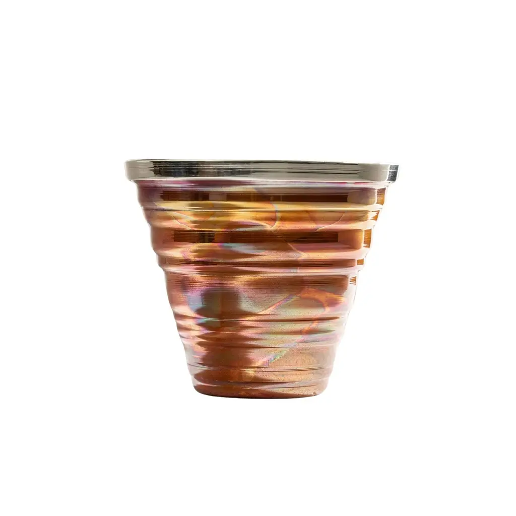 Discover the exquisite blend of beauty and functionality with our Wavy Pure Copper Tumbler, showcasing a shiny mirror finished pure copper surface that will develop a beautiful natural patina over time. Each 350 ml tumbler is meticulously crafted by artisans, ensuring a unique piece that stands out in any collection. This copper glass elevates your drinking experience while offering the health benefits associated with copper and silver.Individually handmade, ensuring a unique and personal touch in every piece. Perfect for enjoying both your favorite hot and cold beverages. Leverages antimicrobial properties of copper and silver for a healthier drinking experience. Made from sustainable materials, fully recyclable, supporting eco-conscious living.