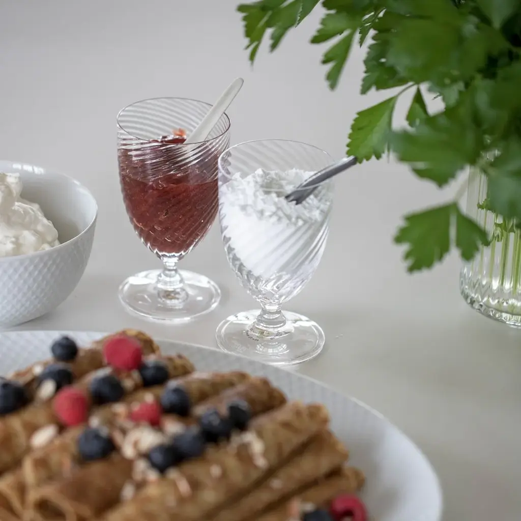 Do you need new tumblers, and do you like design and fascinating provenance? The royal Regina tumblers by Holmegaard might be just the thing for you The glasses are part of an extensive range of glasses designed by Anja Kjaer as a gift from the Municipal Council of the City of Copenhagen in connection with the Silver Wedding of the Danish Queen and Prince Consort in 1992 Every single glass is mouth-blown, which gives each glass its own unique appearance The range of Regina glasses is inspired by old Venetian glasses and includes glasses for white wine, red wine, port and champagne, so you can set the table for any festive occasion
