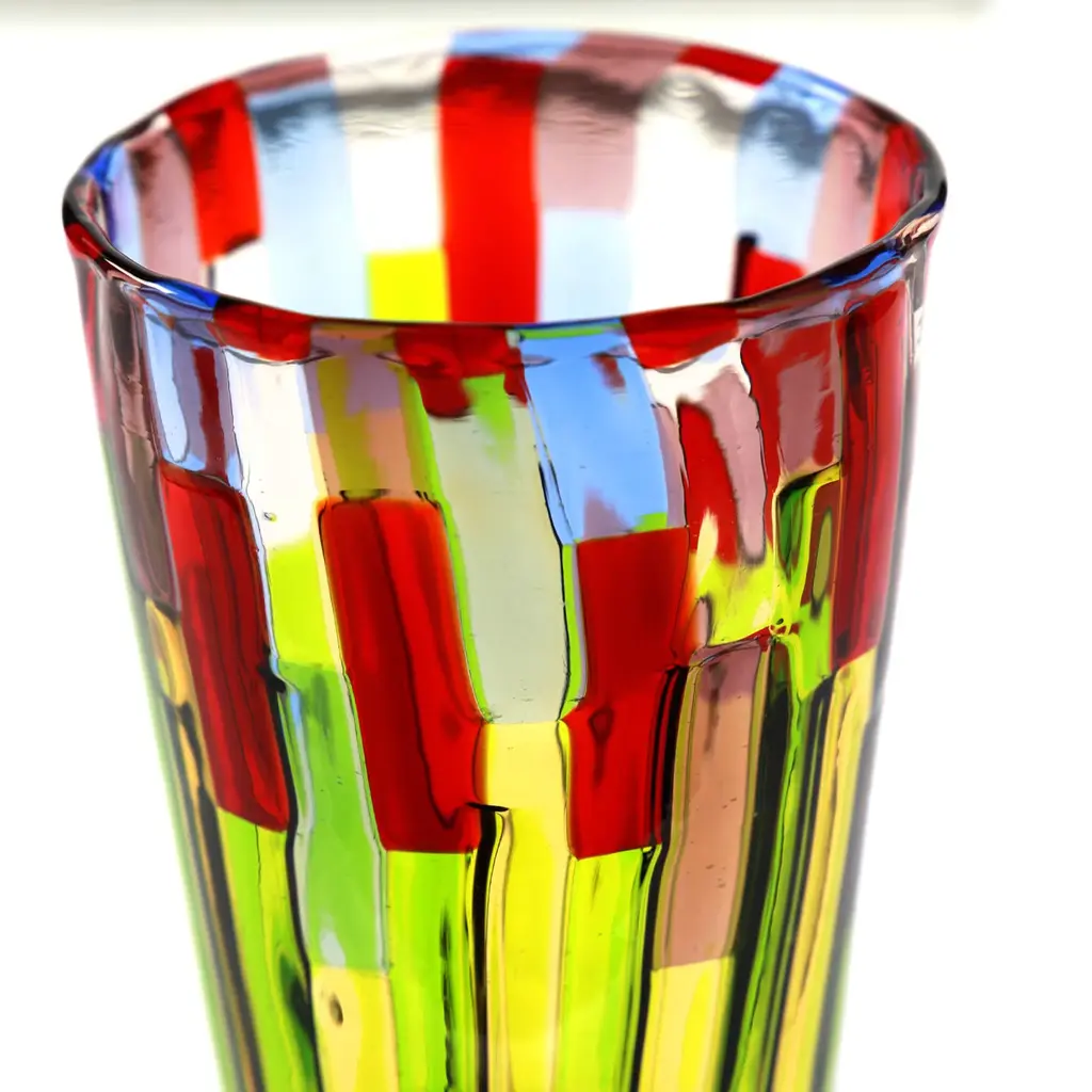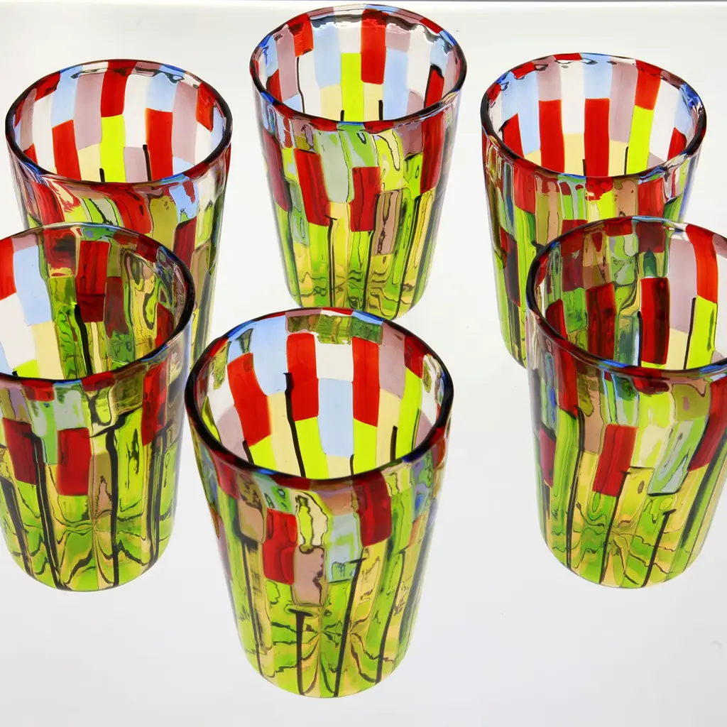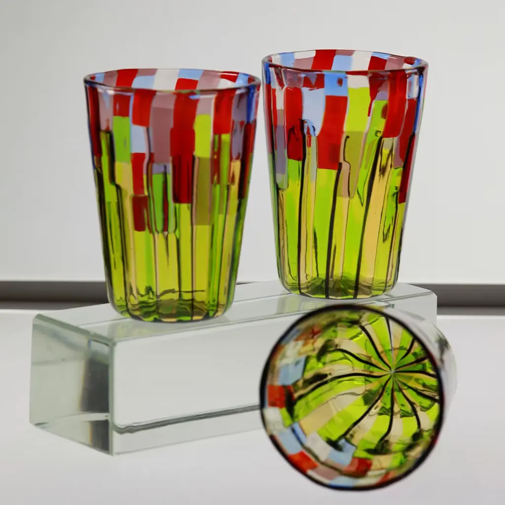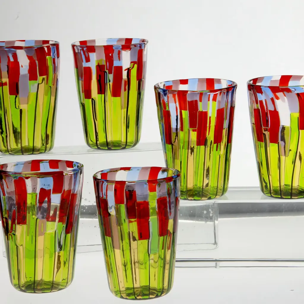 The original name is Campo fiorito con papaveri e lavanda. Each glass cane and element has to be perfectly fused to the next, representing the accurate craftsmanship of master Muranese glassmiths. The lower part alternates green and Gaggia (bright yellow) with separation of a black polish mini cane. The upper part features pops of red, amethyst, blue and pink. Canes are not flattened and they keep a lens effect that makes a great play with light. Every piece is a masterpiece and a table set with these tumblers will become attractive and make it a point of conversation. Tumblers are signed.