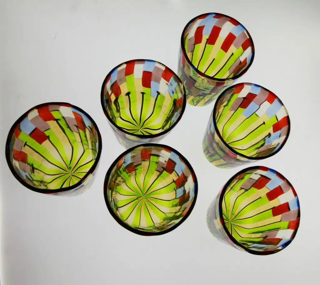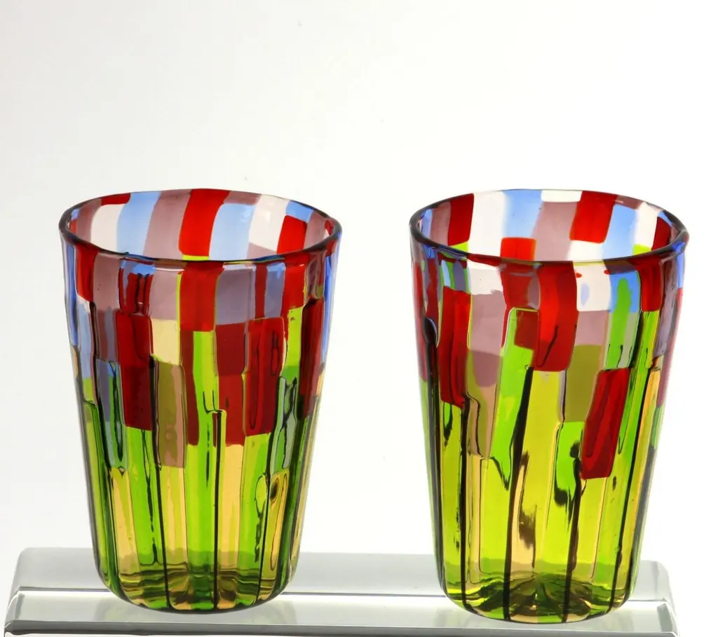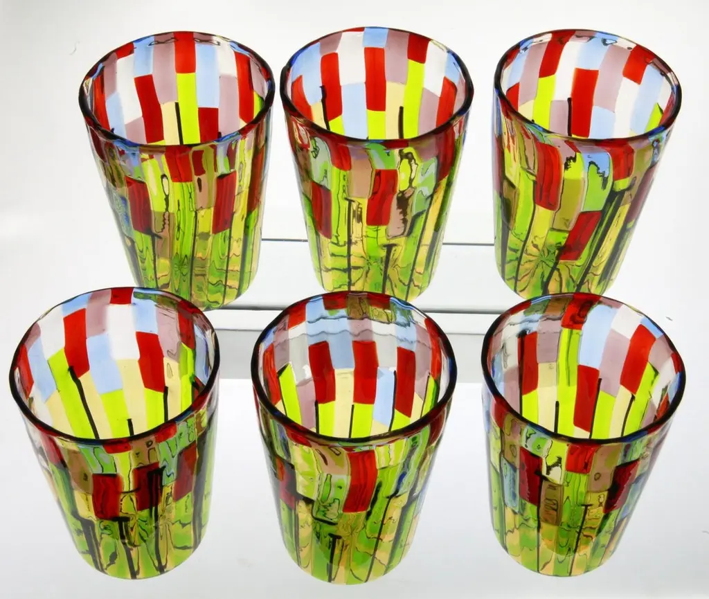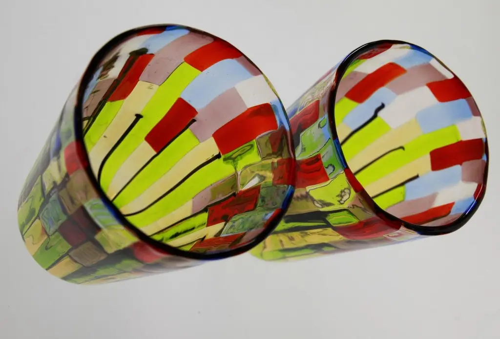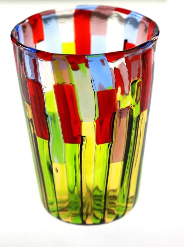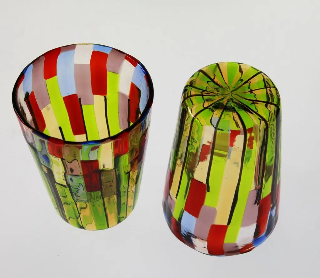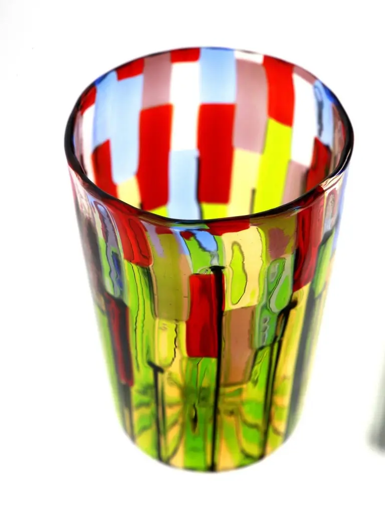 The original name is Campo fiorito con papaveri e lavanda. I designed this at the turn of the millennium for Nancy and Robert Frehling of Oggetti. I was experimenting with the piera working. This was used by the greatest glass designer. Gio Ponti did the straight canes "a canne" at Venini, Ercole Barovier worked on patching triangular pieces in the "Tessere" and Fulvio Bianconi with square elements in the "Pezzati" for Venini. Many glass makers did their version, Orlando Zennaro, almost unknown today, I considered the best.I sent to the maestro the design, with the lower part in straight canes ending at the top with pezzati. I asked him to slide in-between the canes a black small cane to mark the straw and the grass.I was so surprised that the tumbler was made. Bravissimo. Only one. I keep it as a trophy. So beautiful. It was a bit pricey for distribution so it was abandoned.I met the maestro in Murano after the acqua alta and we went back on memories and I told him I still have the Campo Fiorito tumbler. We agreed it is the right time to give to this design a second chance. Selling directly to the final consumer allows a reasonable price considering that each tumbler is a masterpiece of glass techniques and such a graceful piece.The lower part alternates Verde and Gaggia (bright yellow) with separation of a smalto nero mini cane. On the upper part there are pops of red, two amethyst, bluino and rose. It's a piera senza vetro, called roll up techniques where the glass is rolled up the pipe without a blob of glass. Each glass cane and element has to be perfectly fused to the next; this is called rimarginatura and then passed on the counter punty (pontello) and hand opened. Canes are not flattened and they keep a lens effect that makes a great play with light. Every piece is a masterpiece and a table set with these tumblers will become attractive and make it a point of conversation.Price is per unit so any quantity can be purchased.Transport becomes complimentary on a set of 12.Tumblers are signed.
