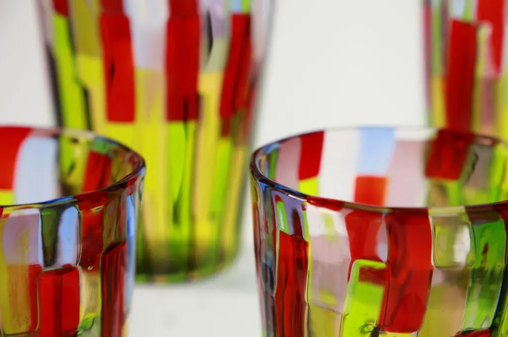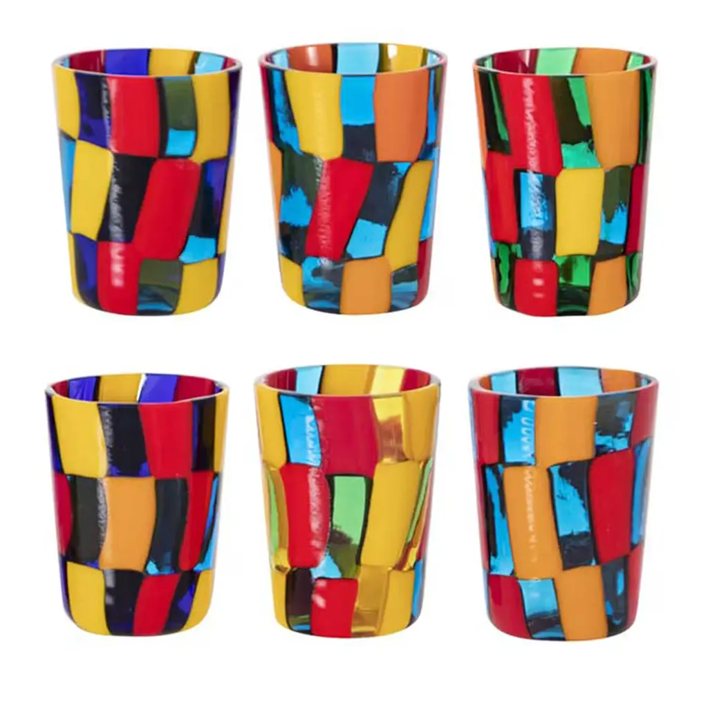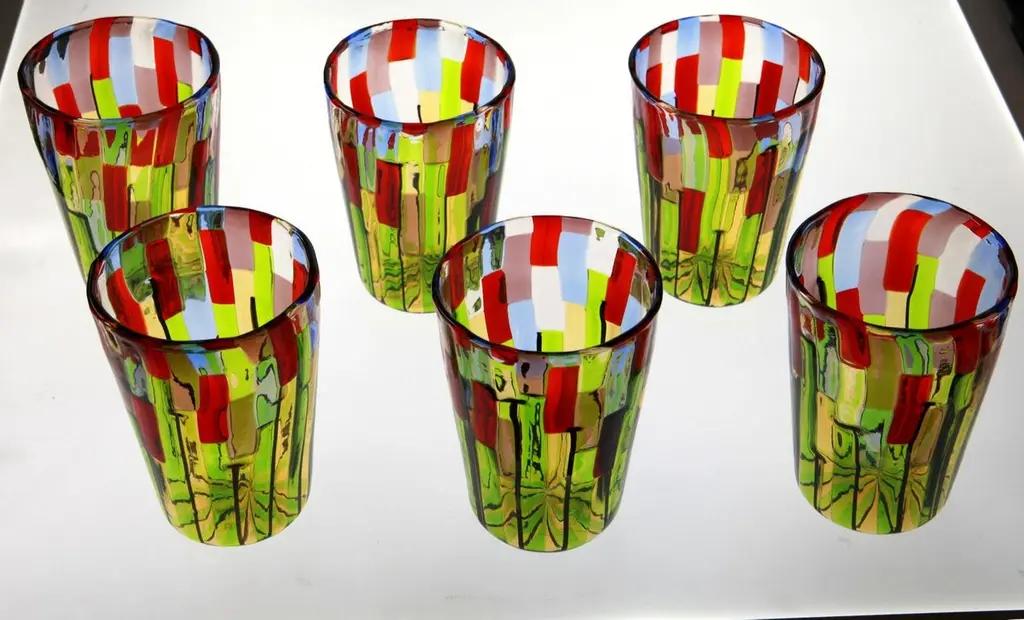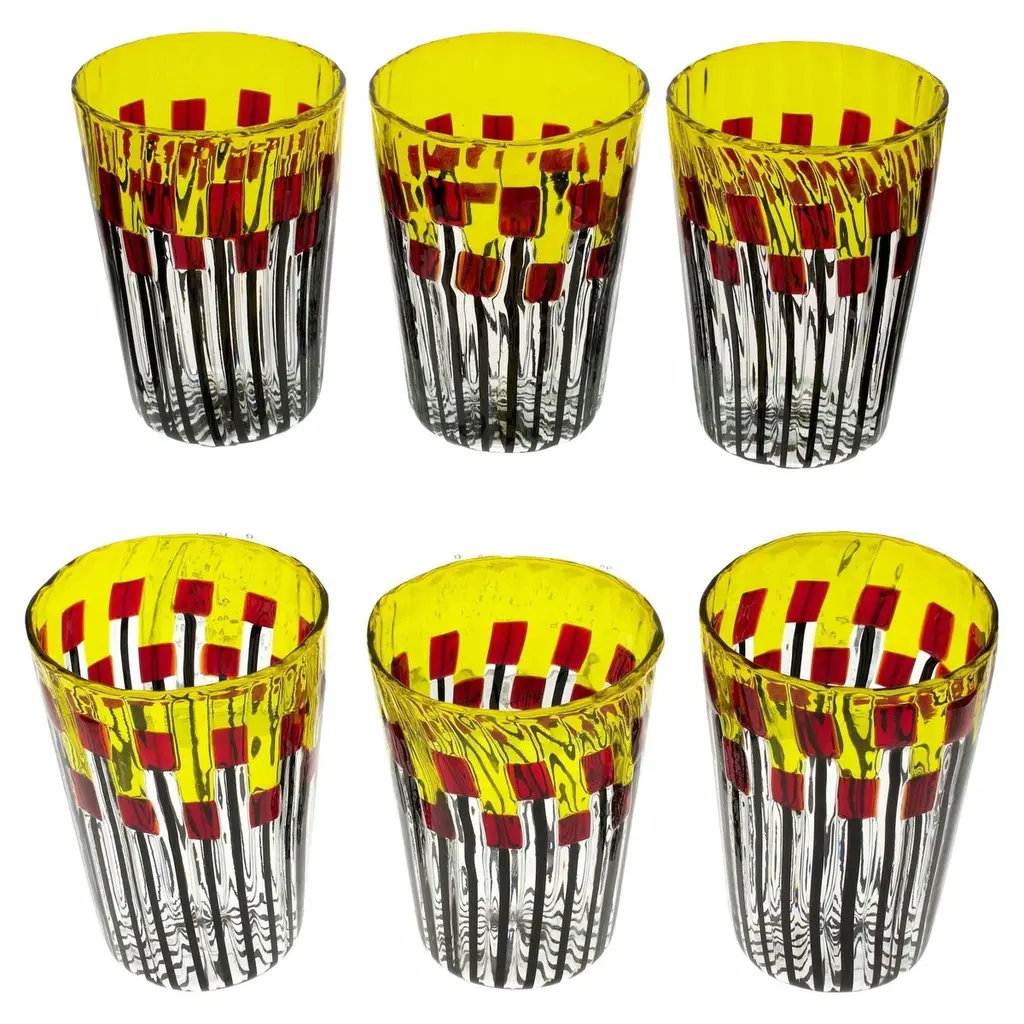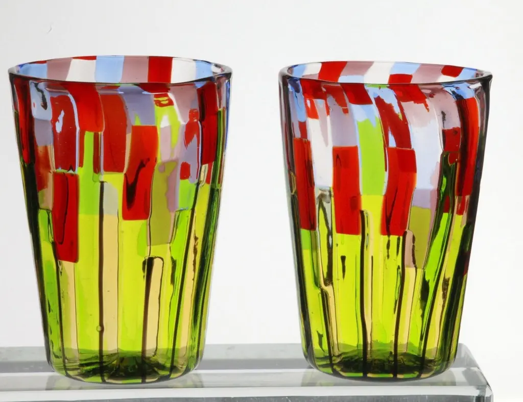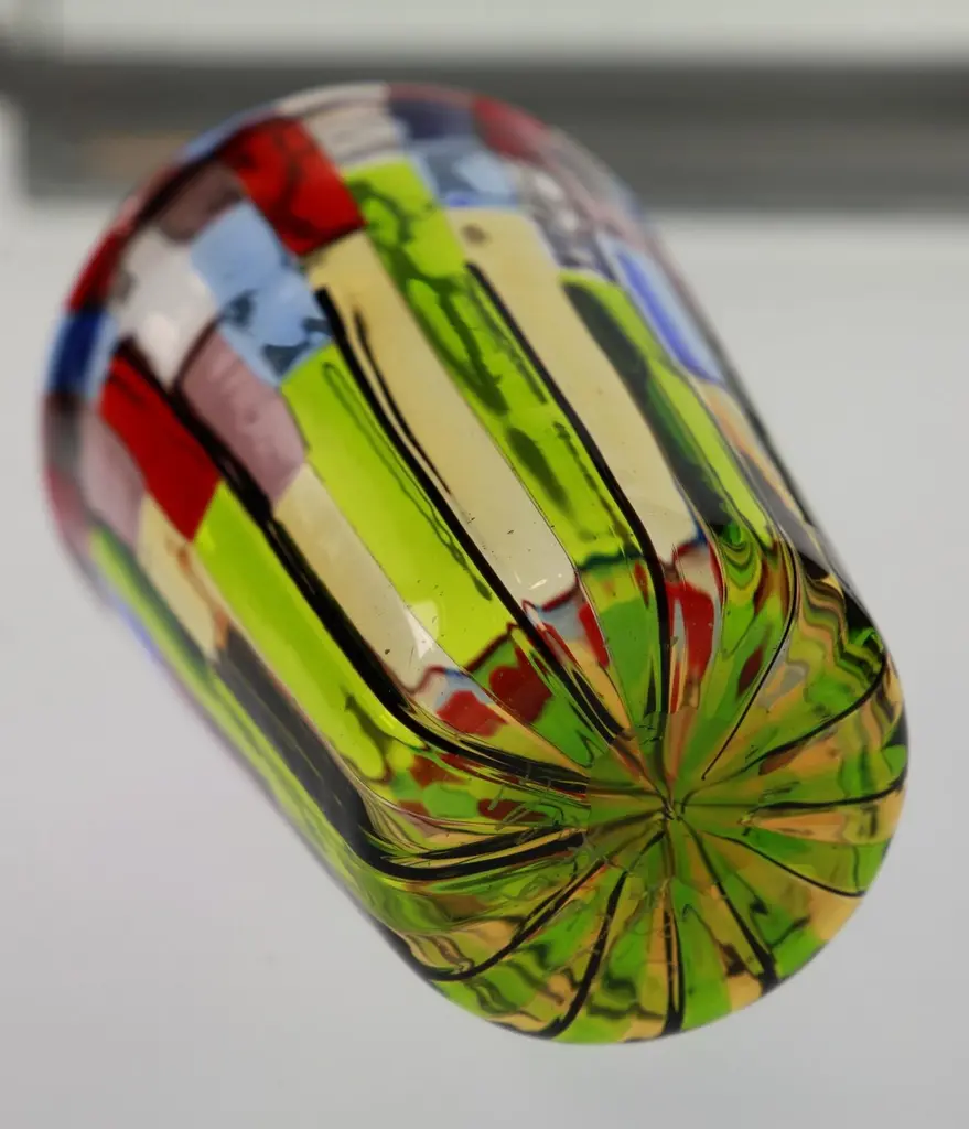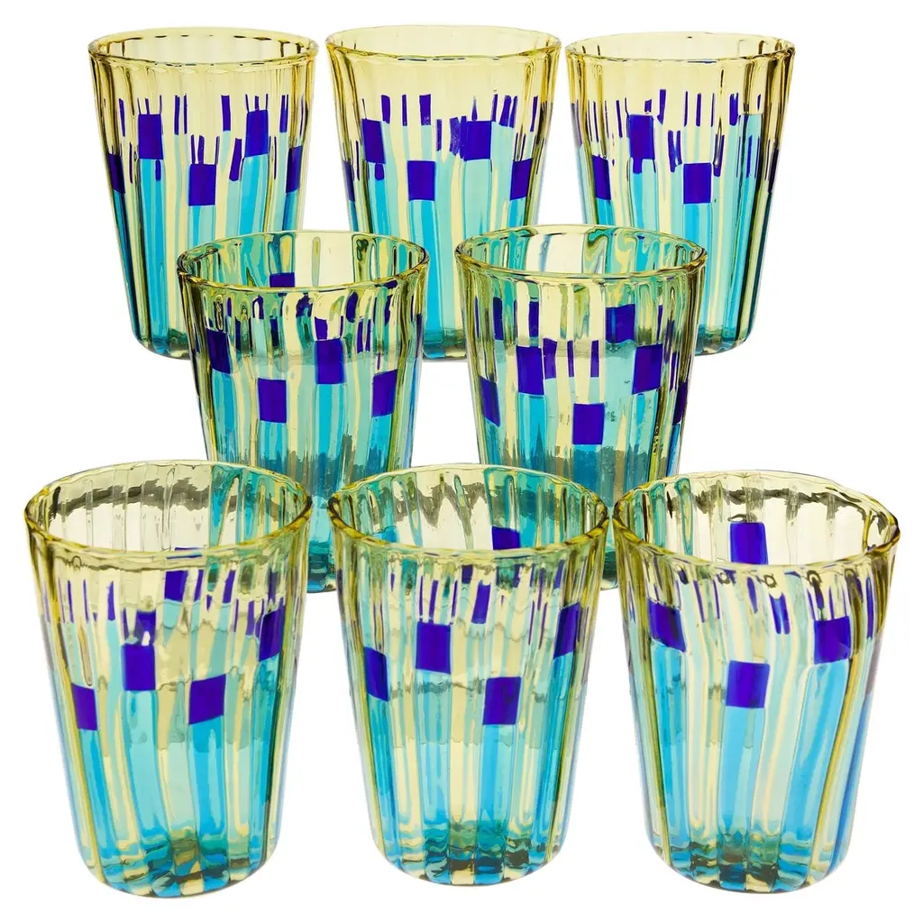 The original name is Campo fiorito con papaveri e lavanda. I designed this at the turn of the millennium for Nancy and Robert Frehling of Oggetti. I was experimenting with the piera working. This was used by the greatest glass designer. Gio Ponti did the straight canes "a canne" at Venini, Ercole Barovier worked on patching triangular pieces in the "Tessere" and Fulvio Bianconi with square elements in the "Pezzati" for Venini. Many glass makers did their version, Orlando Zennaro, almost unknown today, I considered the best.I sent to the maestro the design, with the lower part in straight canes ending at the top with pezzati. I asked him to slide in-between the canes a black small cane to mark the straw and the grass.I was so surprised that the tumbler was made. Bravissimo. Only one. I keep it as a trophy. So beautiful. It was a bit pricey for distribution so it was abandoned.I met the maestro in Murano after the acqua alta and we went back on memories and I told him I still have the Campo Fiorito tumbler. We agreed it is the right time to give to this design a second chance. Selling directly to the final consumer allows a reasonable price considering that each tumbler is a masterpiece of glass techniques and such a graceful piece.The lower part alternates Verde and Gaggia (bright yellow) with separation of a smalto nero mini cane. On the upper part there are pops of red, two amethyst, bluino and rose. It's a piera senza vetro, called roll up techniques where the glass is rolled up the pipe without a blob of glass. Each glass cane and element has to be perfectly fused to the next; this is called rimarginatura and then passed on the counter punty (pontello) and hand opened. Canes are not flattened and they keep a lens effect that makes a great play with light. Every piece is a masterpiece and a table set with these tumblers will become attractive and make it a point of conversation.Price is per unit so any quantity can be purchased.Transport becomes complimentary on a set of 12.Tumblers are signed.