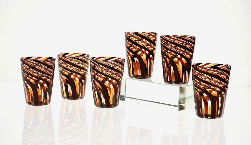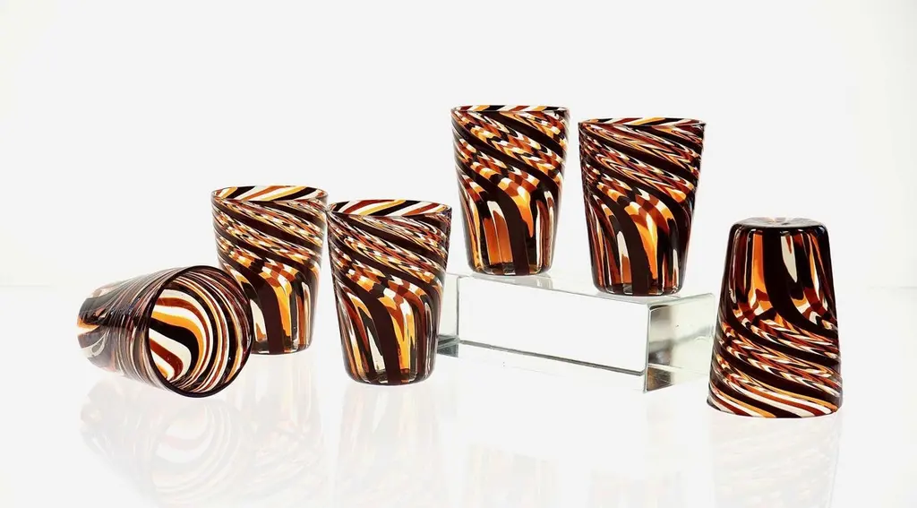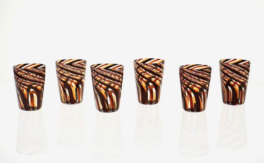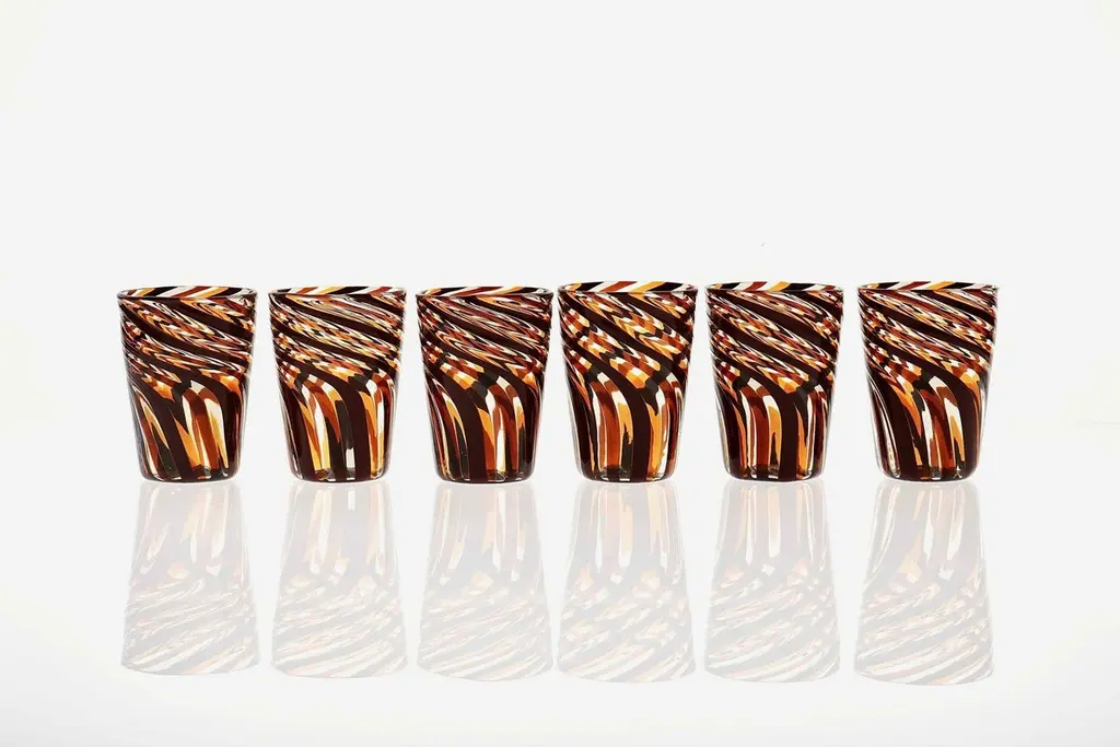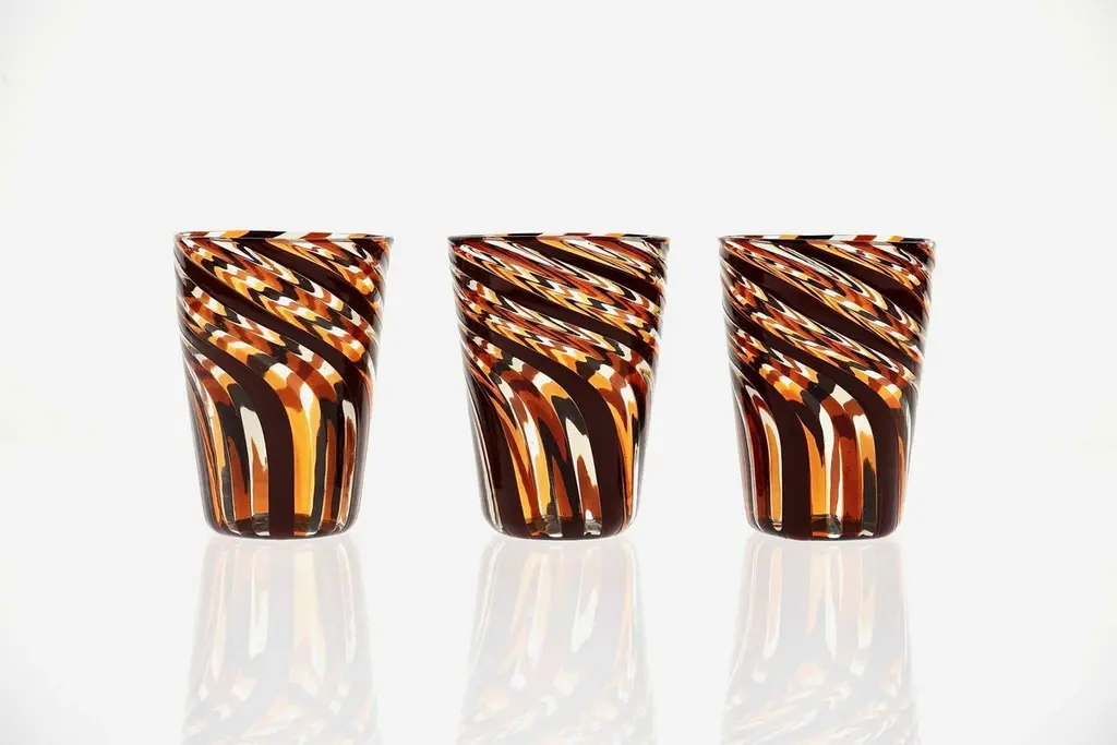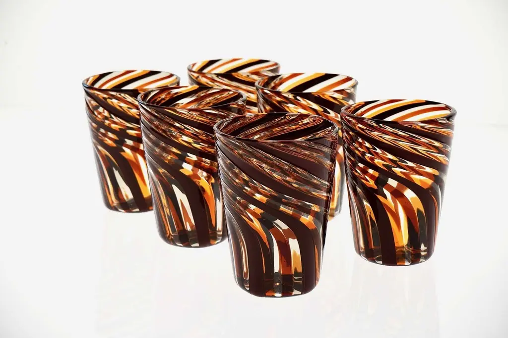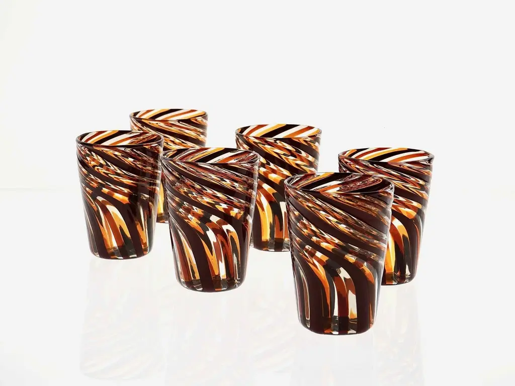 This set of six Murano glass tumblers showcases a harmonious blend of rich, vivid colors.The glasses are created using the traditional Murano technique, where a sequence of Murano glass rods is transformed into a stunning three-dimensional design. In this process, the classic technique of straight canes is enhanced with a special twist. Before the glass is blown, it is reheated to the perfect softness. The glass is then twisted into a spiral, a process known as ritorto—or mena in Murano dialect, meaning “to lead.” The spiral is carefully interrupted, creating a unique fold that straightens the rods, offering a striking visual effect.Inspired by Chaim Soutine's early works, particularly Les Platanes in Ceret (1920), these tumblers are a true testament to artistic craftsmanship.This intricate design evokes the bold, artistic spirit of the 1960s, where the intersecting colors create a beautiful patchwork effect. The body of each tumbler is crafted from fused glass rods in brown, amber, and yellow, creating an exquisite contrast of transparencies and hues. The interplay of light as it passes through the various shades of glass is simply breathtaking, making each piece one-of-a-kind.These tumblers are handmade in Murano using the challenging “a piera” technique, also known as the roll-up method, in which glass is carefully rolled onto the pipe without forming a patch. Every glass cane and element is perfectly fused together through a process called rimarginatura before being placed on the counter punty (pontello) and hand-opened. The canes retain their lens-like effect, creating an enchanting play with light.Each tumbler is a true work of art, and when displayed as part of a set, they’ll be sure to attract attention and spark conversation. The price is per unit, so you can purchase any quantity, with complimentary shipping on orders of 12 or more. Each tumbler is signed, underscoring its authenticity.Slight variations in height and diameter are a testament to the high level of craftsmanship that goes into creating each piece.